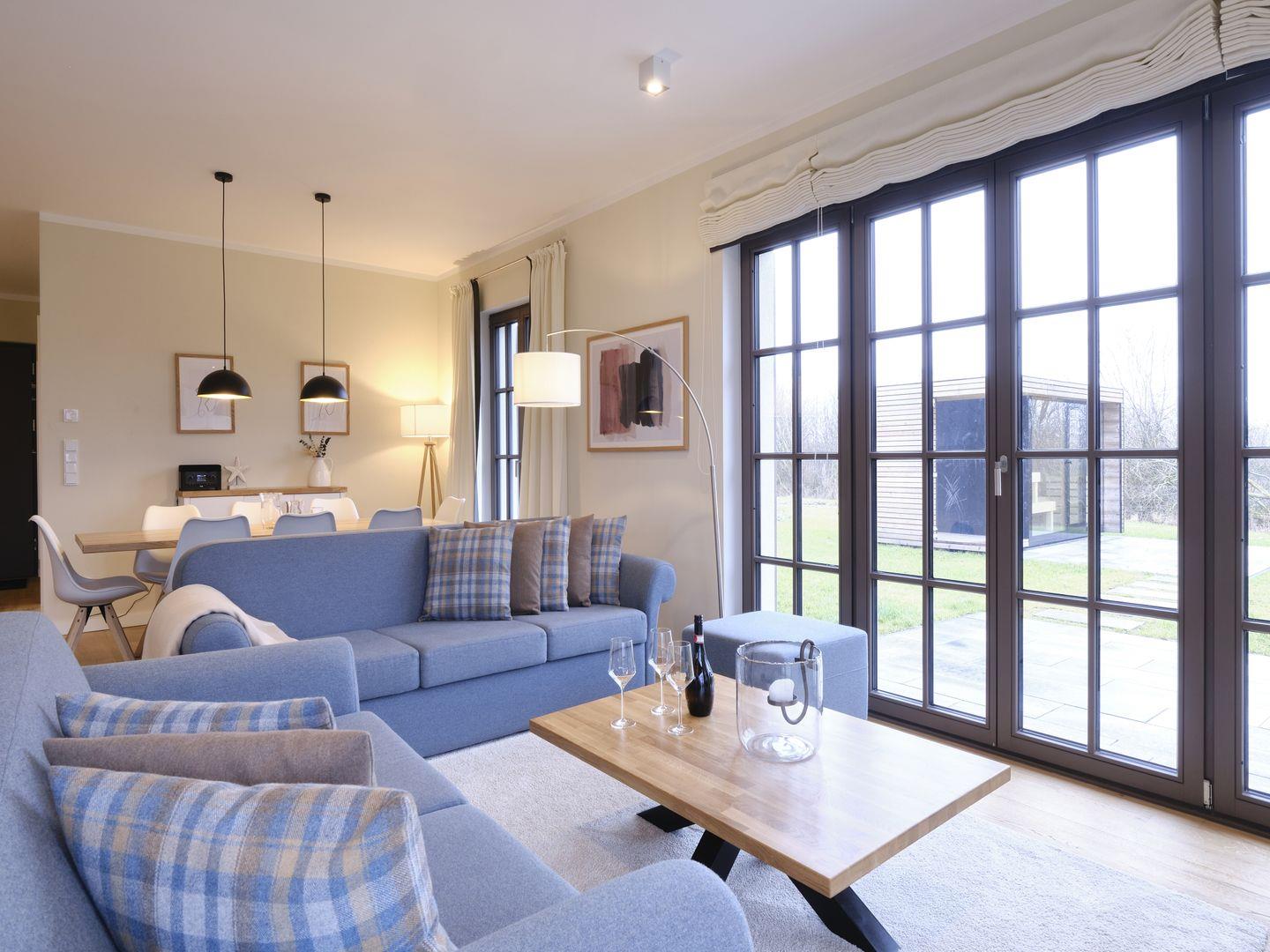 Neu erbaute Villa mit 155 qm, Loungebereich, Außensauna, 4 Schlafzimmer mit Boxspringbetten, großzügiger Wohnraum mit Essbereich und großem Kamin, eine hochwertige in den Wohnbereich integrierte Qualitätsküche mit Geschirrspüler, 1 Badelounge, 1 Vollbad, 1 Gäste-WC, Hauswirtschaftsraum mit Waschmaschine und Trockner, LCD-Flachbildschirme sowie eine Stereo-Anlage, Bettwäsche und Handtücher sind ausreichend vorhanden.