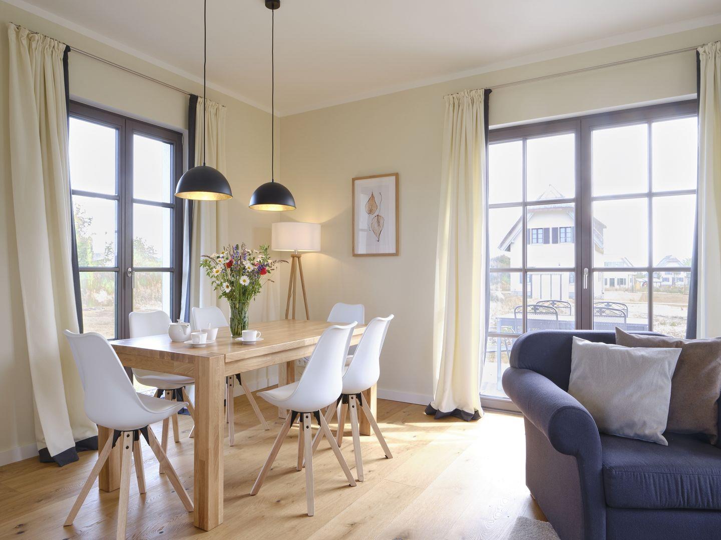 Freuen Sie sich in dieser luxuriösen Villa auf ein Frühstück auf der privaten Terrasse, einen gemütlichen Kaminabend und einen entspannten Saunabesuch in der hauseigenen Sauna mit Duschbad. Das Haus verfügt über eine zweite süd-westlich ausgerichtete Terrasse mit Strandkorb. Ein großzügiger Wohnraum kombiniert das Wohnzimmer mit Kamin, LCD-Flachbildschirm, DVD-Player und Stereo-Anlage mit dem Essbereich und einer Qualitätsküche. Diese ist voll eingerichtet und bietet einen Geschirrspüler, einen Backofen, ein Kochfeld, eine Mikrowelle, einen Kaffeevollautomat, einen Wasserkocher und einen Toaster. Drei Schlafzimmer, eines mit großem Doppelbett, die anderen mit je einem 160cm Doppelbett, verfügen zusätzlich über genügend Verstaumöglichkeiten. Das Vollbad überzeugt mit einer Badewanne, einer geräumigen Dusche, einem Waschbecken, einem WC und einem großen Spiegel. Zusätzlich gibt es ein Gäste-WC und eine Waschmaschine sowie einen Trockner.