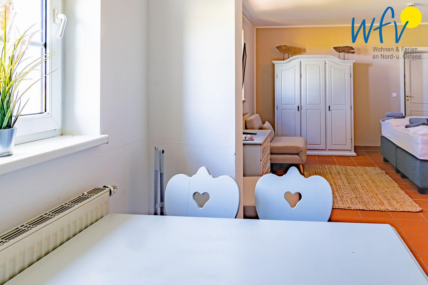Die Ferienanlage umfasst 23 Ferienwohnungen. In unserem 39 m² großen Appartement "Sonnenkuss" im 1. Obergeschoss erwartet Sie ein Wohnraum mit Doppelbett (180 cm x 200 cm), TV, Kochnische und Essplatz sowie ein separates Schlafzimmer mit zwei Etagenbetten (90 cm x 200 cm) und ein Duschbad.