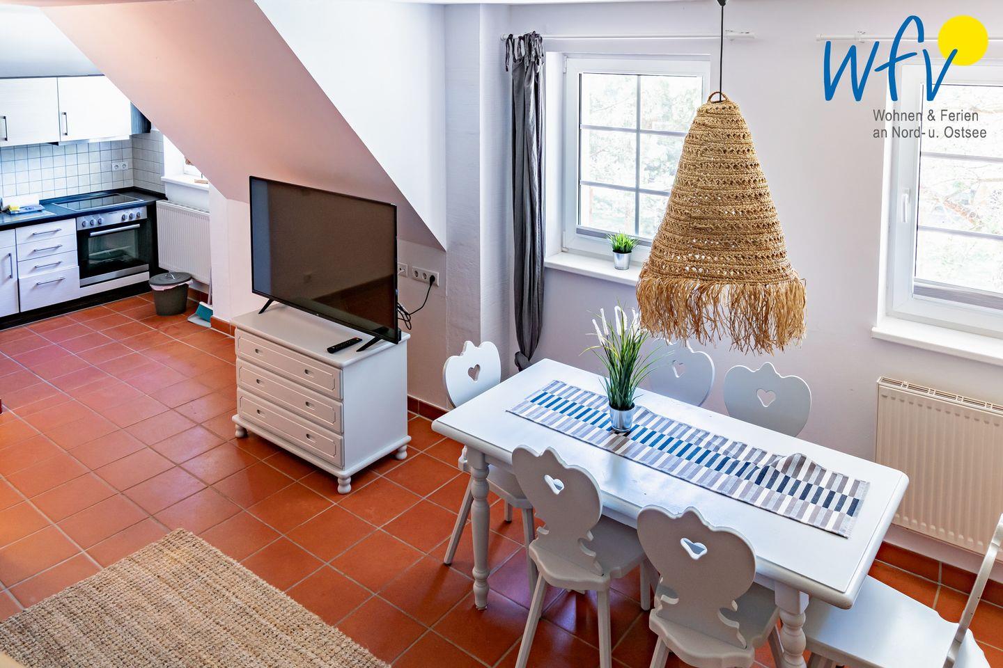Die Ferienanlage umfasst 23 Ferienwohnungen. In unserem 75 m² großen Appartement "Sonnenstrahl" über zwei Etagen erwartet Sie ein Wohnraum mit Sitzgelegenheiten, TV, Kochnische und Essplatz sowie zwei separate Schlafzimmer und ein Duschbad mit zusätzlichem Gäste-WC. Die Schlafzimmer sind mit einem Doppelbett (180 cm x 200 cm) bzw. einem Einzelbett (90 cm x 200 cm) und einem Etagenbett (90 cm x 200 cm) ausgestattet. Die Maisonettewohnung erstreckt sich über das 1. OG (Wohn- und Küchenbereich, Gäste-WC) und das 2. OG (Schlafbereiche + Bad).