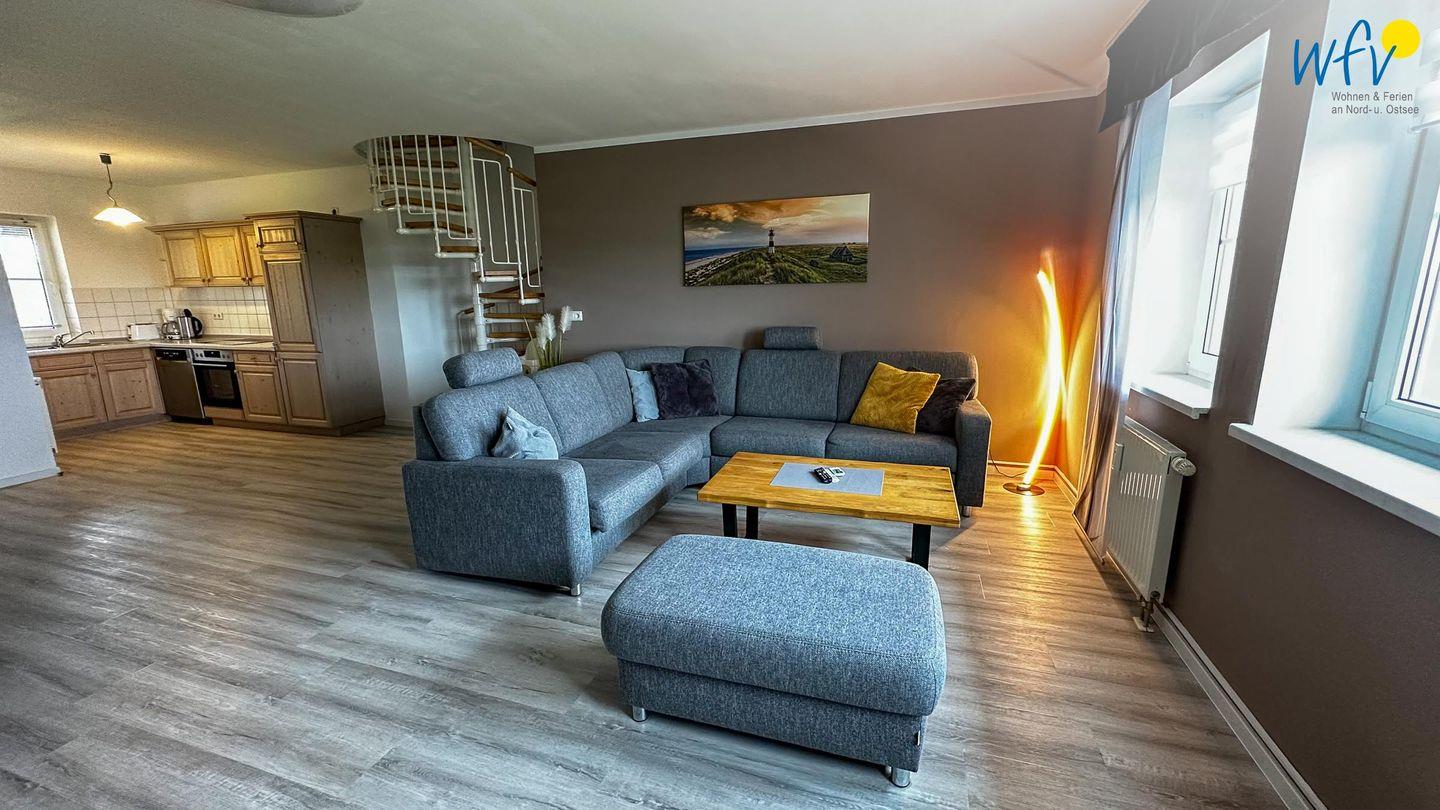 Genießen Sie in der Maisonette-Ferienwohnung modernes Wohnen über zwei Etagen. In der ersten Etage empfängt Sie ein Ensemble aus offenem Wohnraum mit Sofaecke, Essbereich und integrierter Küche, das sich harmonisch miteinander verbindet und für ein weites Raumgefühl sorgt. Hier können Sie sich nach einem erlebnisreichen Tag zurücklehnen, entspannen und gemeinsame Zeit verbringen. Zudem bietet die Sofaecke ausreichend Raum und Gemütlichkeit, um die Abende angenehm ausklingen zu lassen. Ein modernes TV und ein Radio sind vorhanden, zudem empfangen Sie kostenlos freies WLAN.