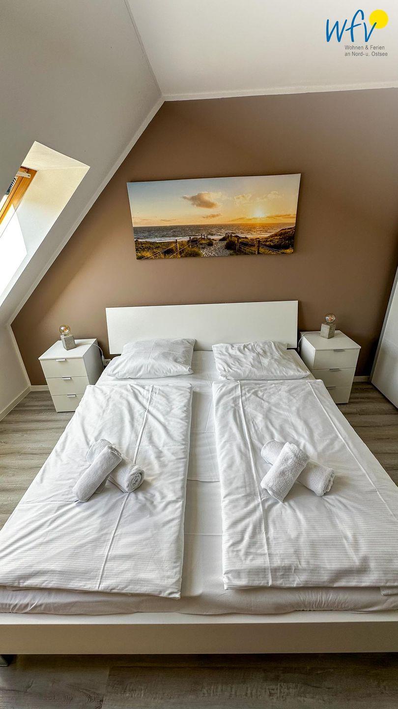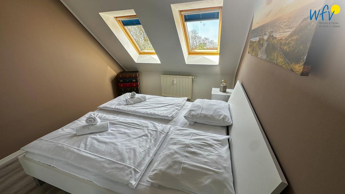 Wenn auf Rügen die Sonne untergeht, können Sie sich auf der zweiten Etage in die zwei separaten Schlafzimmer zurückziehen. Eines der Zimmer ist mit einem Doppelbett ausgestattet, das andere mit zwei Einzelbetten (je 90 x 200 cm). Zwei weitere Personen finden auf dem Sofa im Wohnraum Platz, das sich schnell und einfach zu einer komfortablen Schlafcouch umwandeln lässt.