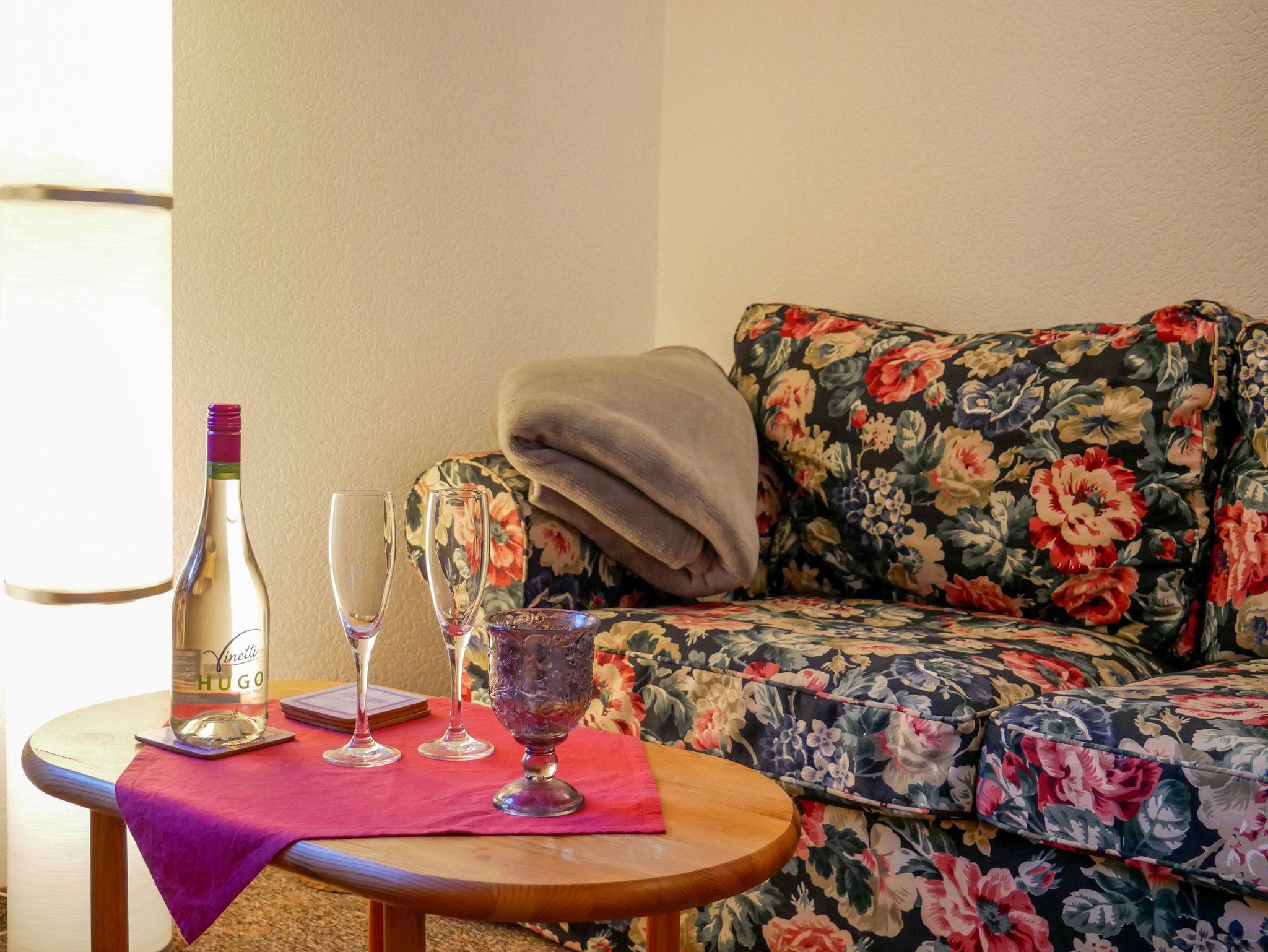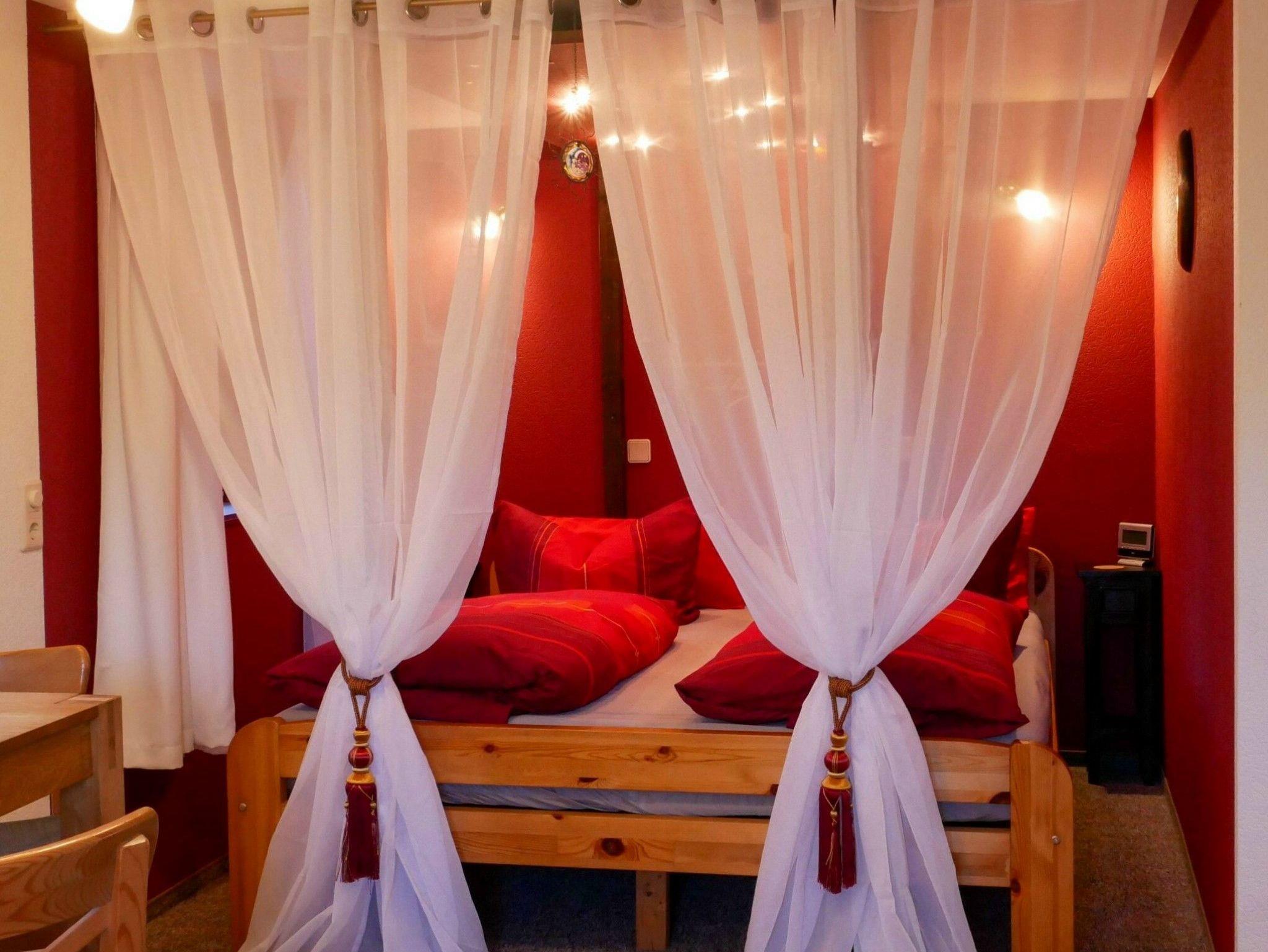 Das Doppelzimmer Moonlight besticht durch sehr viel Romantik, Gemütlichkeit und eine fröhlich- farbige Innenausstattung. Ein Himmelbett mit dimmbarem Sternchenhimmel lädt zum Träumen ein. Das Sofa sorgt für eine angenehme Atmosphäre. Eine voll eingerichtete Miniküche steht zur Verfügung. Im Bad gibt es sowohl einen Fön und einen Kosmetikspiegel als auch diverse Kosmetikprodukte, falls Sie Ihre eigenen vergessen haben. Angeboten werden ofenfrische Brötchen in Varianten ab 9 Uhr an die Tür gehängt. Oder ein Frühstück für 15,- Euro pro Person ab 9 Uhr ins Zimmer oder in den Garten serviert. Bei Gelegenheit gibt es einen Grillabend, einen Fischabend oder ab und an selbstgebackenen Kuchen. Alles ist auf Bequemlichkeit und Freundlichkeit ausgerichtet - der Gast möge sich von Anfang an zu Hause fühlen.