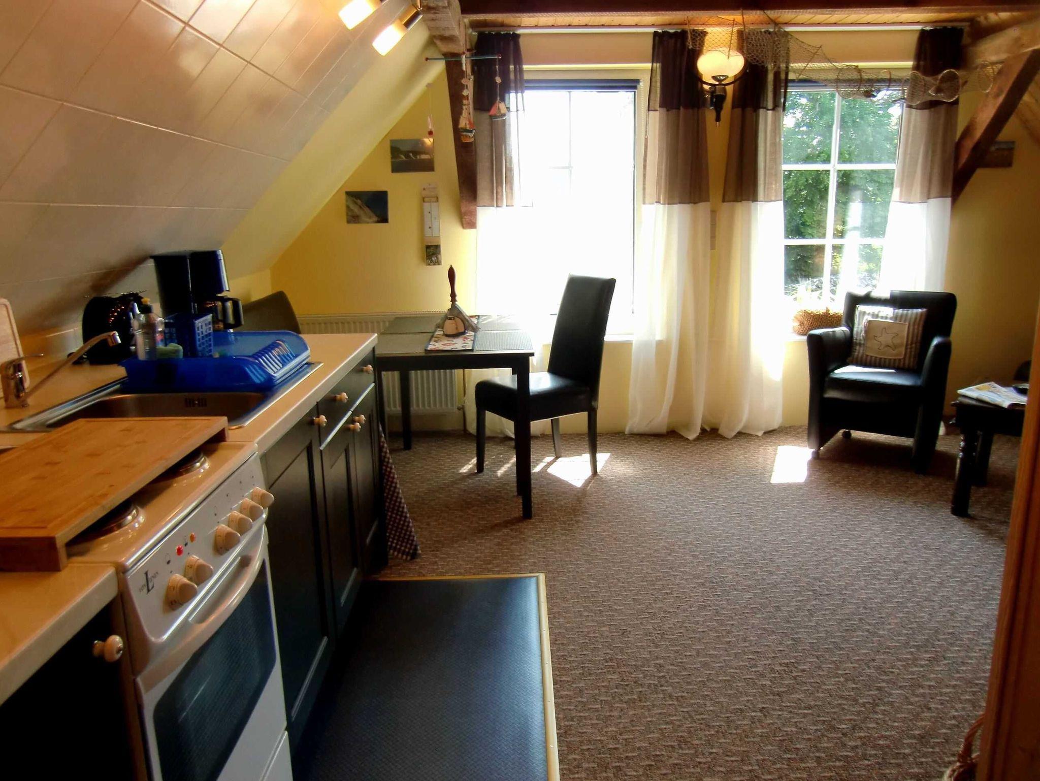 Das Appartement Captains Inn ist genauso eingerichtet: typisch nordisch, etwas kolonial, sehr gemütlich. Ein unmöglicher Mix? Die urige Atmosphäre in dieser ländlichen Ruhe passt prima. Dazu komfortabel mit volleingerichteter Küchenzeile und einem großen, hellen Bad mit Fenster, Fön und Kosmetikspiegel. Auch diverse Kosmetikprodukten sind vorhanden, falls Sie Ihre eigenen vergessen haben. Das Bett im holzverkleideten Schlafzimmer wie auch die Schlafcouch sind 1,40 m breit und äußerst bequem. Angeboten werden ofenfrische Brötchen in Varianten ab 9 Uhr an die Tür gehängt. Oder ein Frühstück für 15,- Euro pro Person ab 9 Uhr ins Zimmer oder in den Garten serviert (nur außerhalb der Saison). Bei Gelegenheit gibt es einen Grillabend, einen Fischabend oder ab und an selbstgebackenen Kuchen. Alles ist auf Bequemlichkeit und Freundlichkeit ausgerichtet - der Gast möge sich von Anfang an zu Hause fühlen.