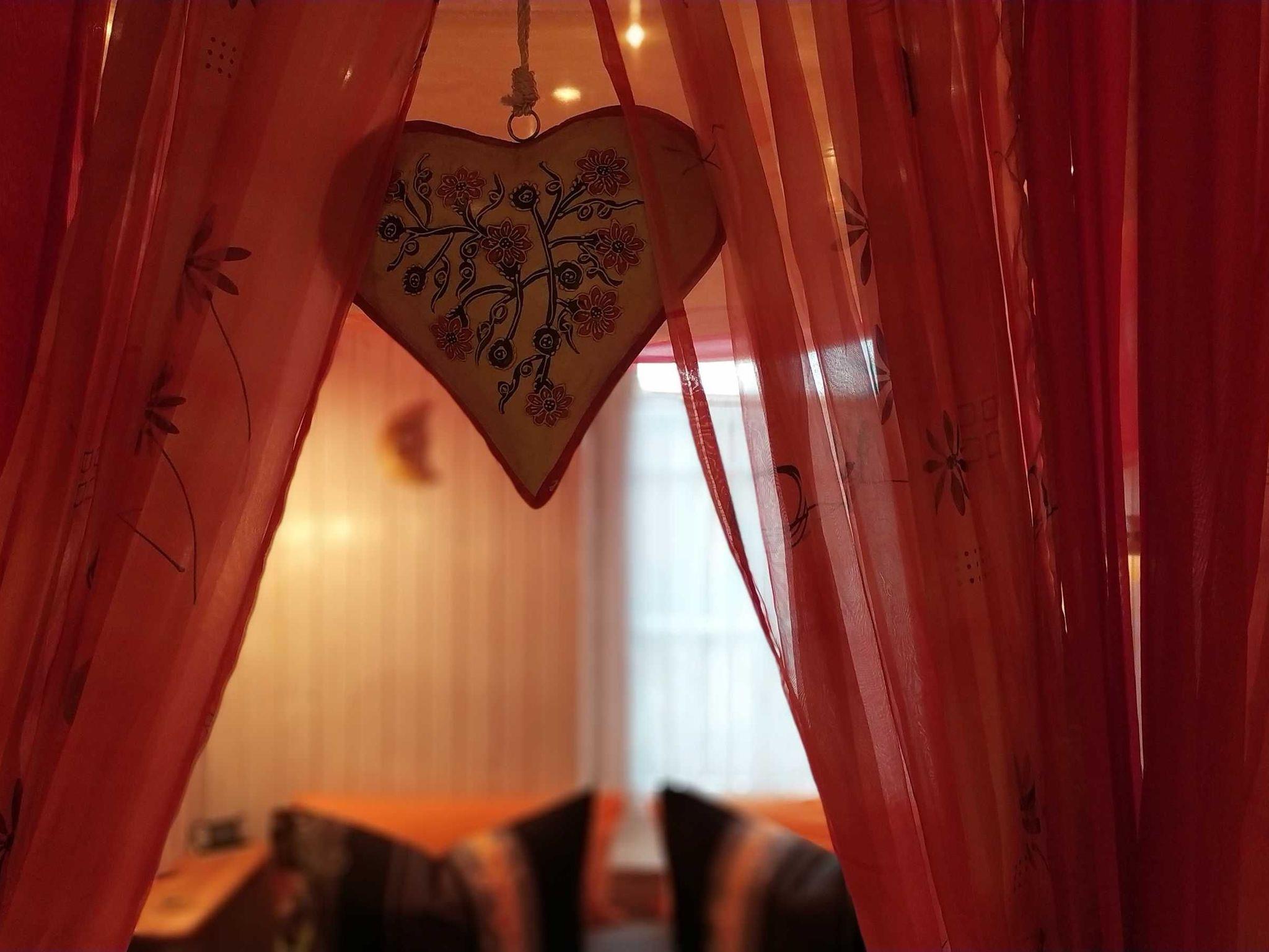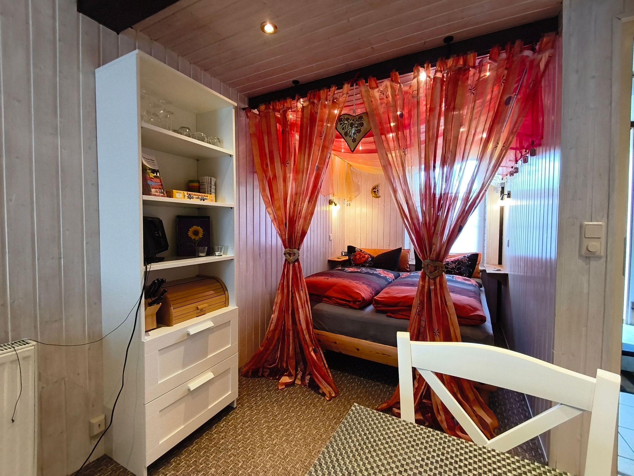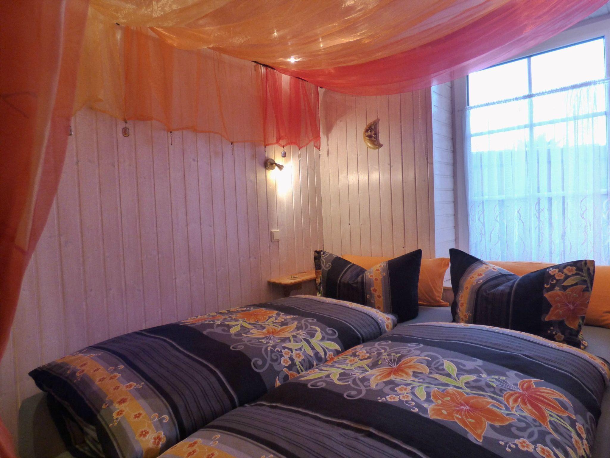 Das Doppelzimmer Honeymoon besticht durch sehr viel Romantik, Gemütlichkeit und eine fröhlich- farbige Innenausstattung. Ein Himmelbett mit dimmbarem Sternchenhimmel lädt zum Träumen ein. Das Sofa sorgt für eine angenehme Atmosphäre. Eine voll eingerichtete Miniküche steht zur Verfügung. Im Bad mit Fenster gibt es sowohl einen Fön und einen Kosmetikspiegel als auch diverse Kosmetikprodukte, falls Sie Ihre eigenen vergessen haben. Angeboten werden ofenfrische Brötchen in Varianten ab 9 Uhr an die Tür gehängt. Oder ein Frühstück für 15,- Euro pro Person ab 9 Uhr ins Zimmer oder in den Garten serviert. Bei Gelegenheit gibt es einen Grillabend, einen Fischabend oder ab und an selbstgebackenen Kuchen. Alles ist auf Bequemlichkeit und Freundlichkeit ausgerichtet - der Gast möge sich von Anfang an zu Hause fühlen.