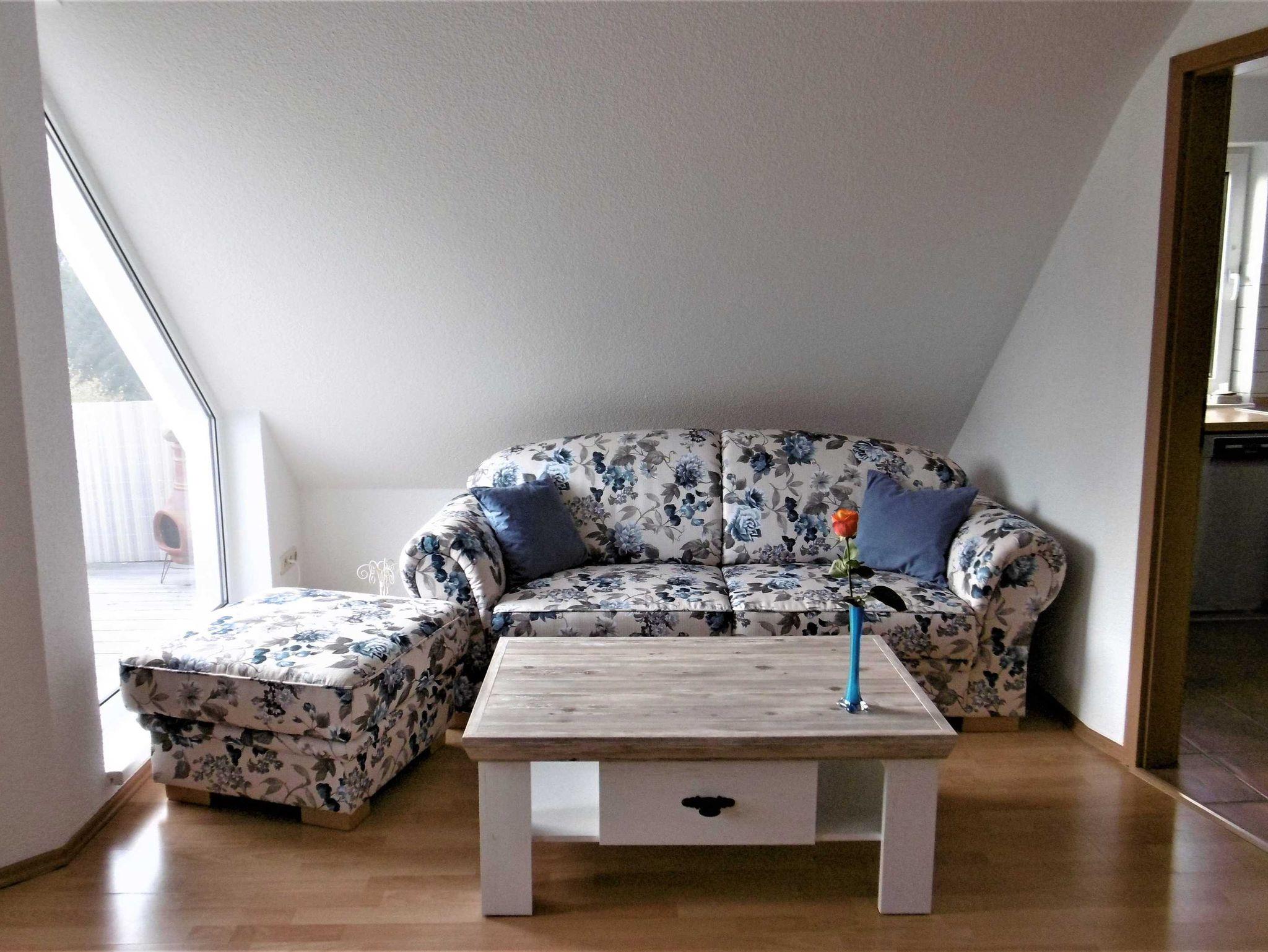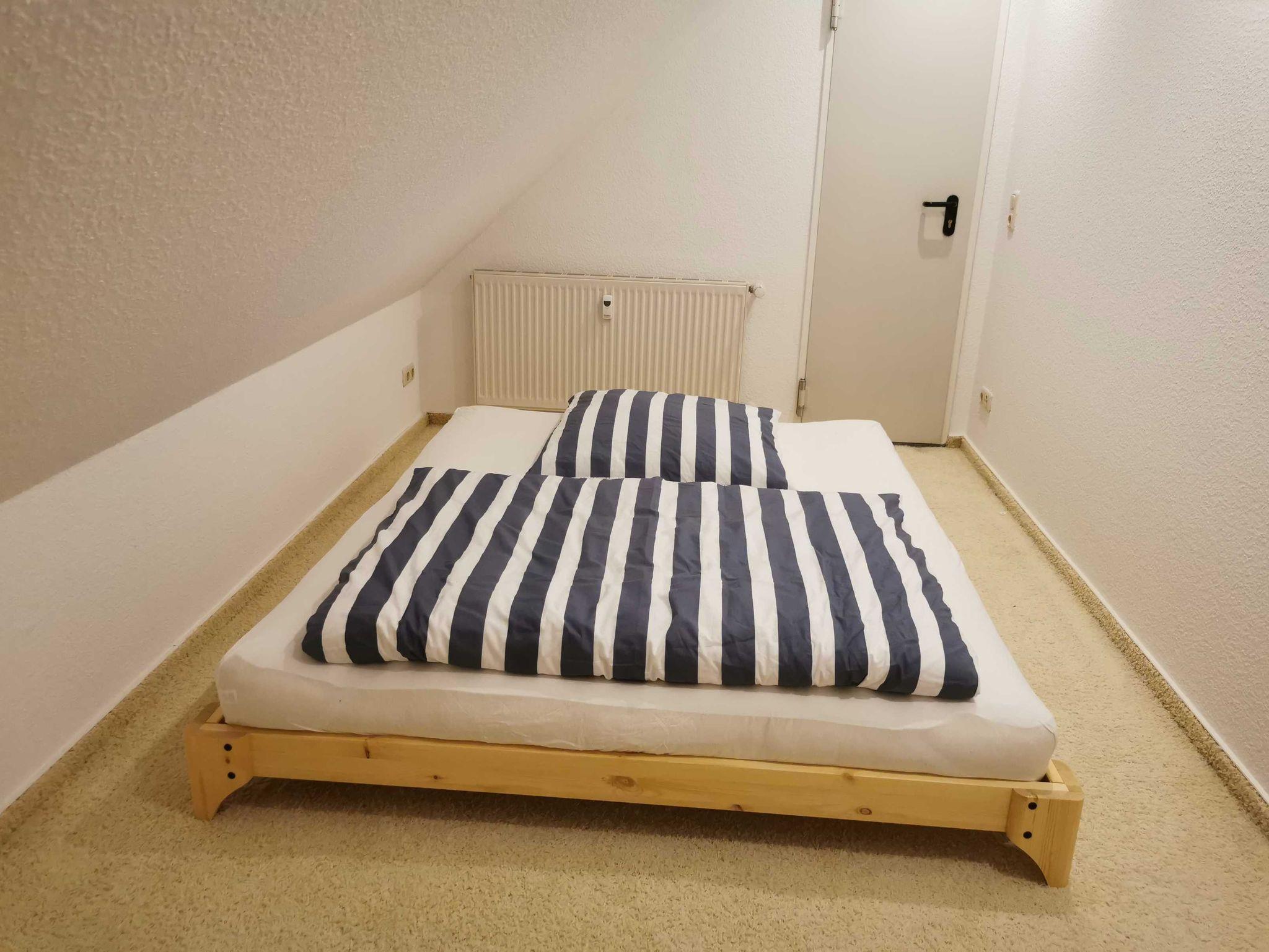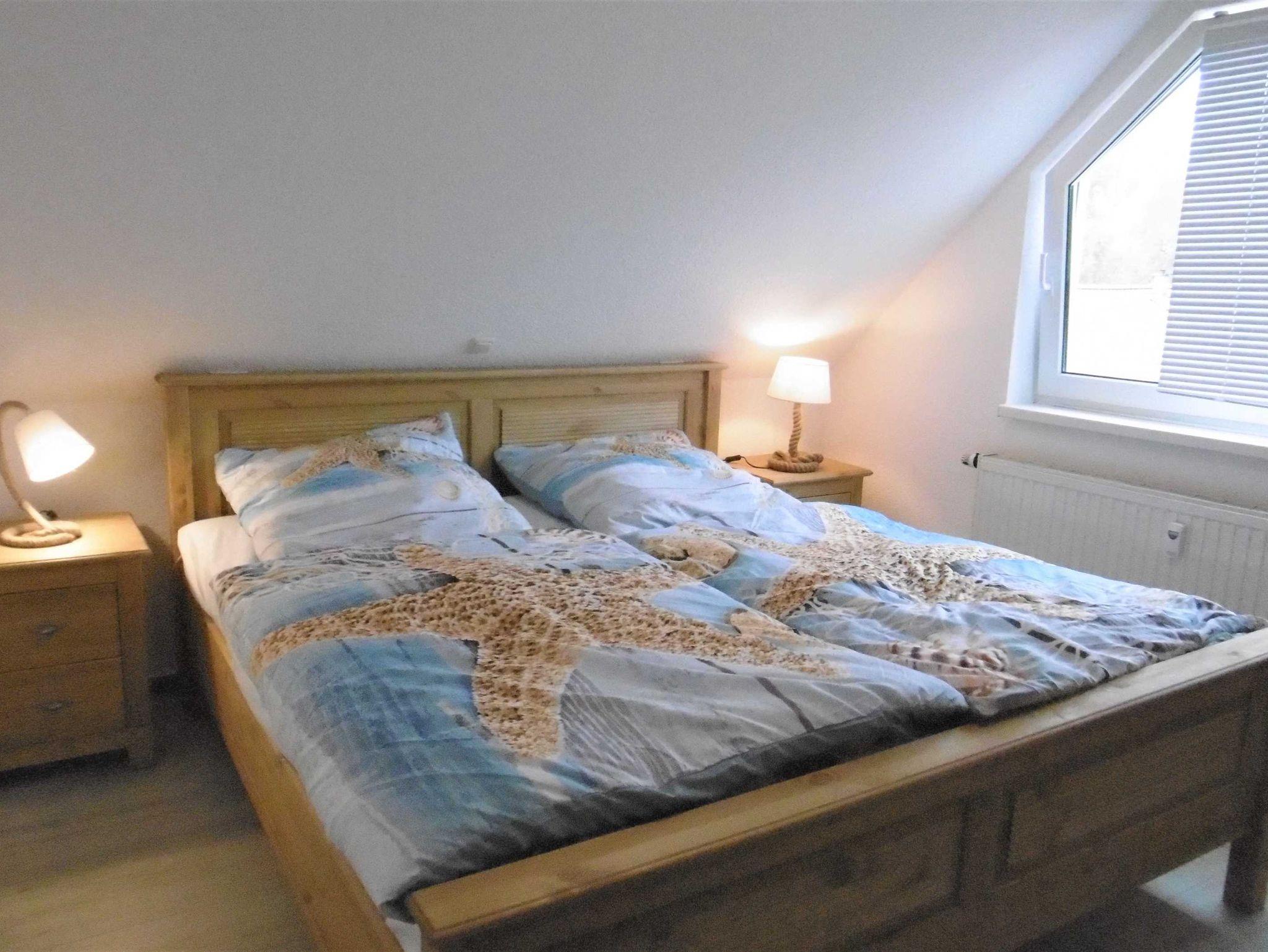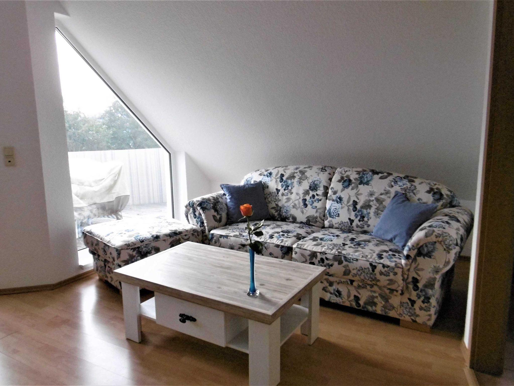 Unsere modern eingerichtete Ferienwohnung im Obergeschoß verfügt über ein Wohnzimmer mit Sitzgruppe (TV) mit Esstisch, der Küche mit Spülmaschine, Herd und Backofen, den 3 Schlafzimmern ( 2 Schlafzimmer mit Doppelbett und ein Kinderzimmer mit Etagenbett, das zweite Schlafzimer mit dem französischen Bett befindet sich in der Mansarde) sowie dem Duschbad. Von dem 8 m² großen Balkon haben Sie einen wunderbaren Ausblick in die Natur und den nahe gelegenen Moorsee.