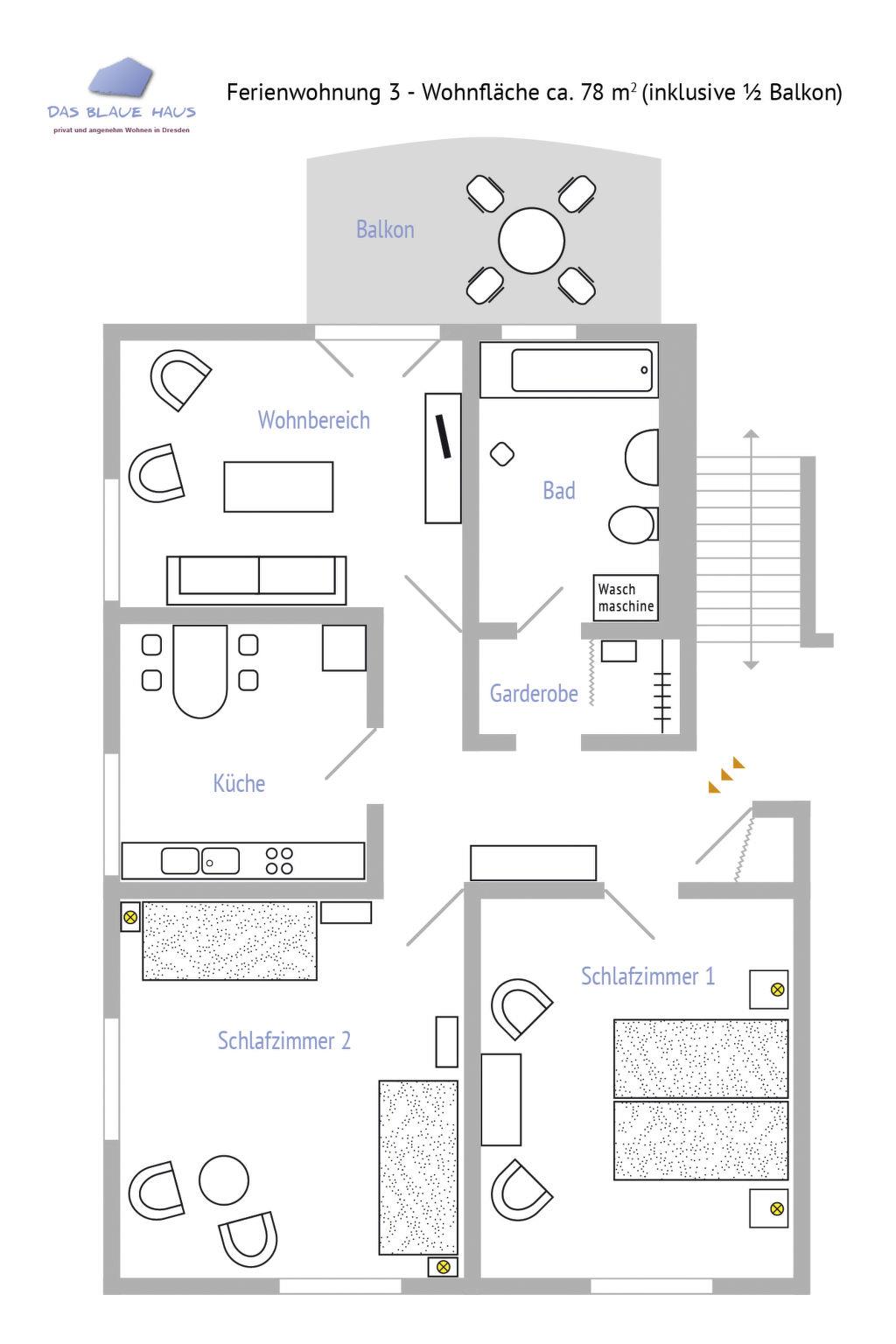 The holiday apartment is in the south of Dresden and has excellent public transport connections to the city centre and the surroundings. You can leave your car parked. The apartment has been classified as four-star by the DTV. The owner herself lives in the house and is happy to assist with any queries. The house was built in the 1930s in a classical style and was fully renovated in 1999 and again in 2018.Holiday apartment with a generous balcony on the outskirts of the city with good connectionsThe apartment is in the south of Dresden and has excellent public transport connections into the city centre and the surroundings. You can leave your car parked. The apartment has been classified as four-star by the DTV. The owner lives in the house and is happy to provide advice. The house in Dresden was built in the classical style of the 1930s and was completely renovated in 1999 and again in 2014.Your apartment comprises a living room, two bedrooms each with two single beds (90 x 200cm), a kitchen, a bathroom and a spacious wardrobe. Bed linen is included in the price. The built-in kitchen includes a ceramic hob, oven, extractor fan, coffee machine, toaster, kettle, fridge and freezer, dishwasher, crockery and kitchen utensils. A vacuum cleaner, iron, ironing board and tea towels are provided. The bathroom has towels, a hairdryer, a bath, a WC and a washing machine. Evening entertainment is provided by an LDC with satellite channels, a Bluray player, radio, books and a collection of games. There is central heating with a radiator in each room, apart from the hallway. A child’s bed and a highchair can be provided on request.The outdoor area has a bicycle stand, a balcony with garden furniture and a pond with a stream in the shared garden. There is a car parking space on site, which can be used on agreement with the owner, but you can also always find free spaces on the street in front of the house.It is a non-smoking apartment in a non-smoking house!Holiday on the outskirts of Dresden – almost rural, but within easy access of the centre by tram (a stop 200 metres away). If you are looking for trade fair accommodation in Dresden you can save yourself the stress of looking for a parking space at the trade fair grounds and book your accommodation here for two to five people. It is barely 30 minutes by tram from door to door. You can also stop off in the evening in the historical old town or the trendy district Dresden-Neustadt, as tram line 11 runs practically the whole night. The nearest grocery shops are about 500 metres away.