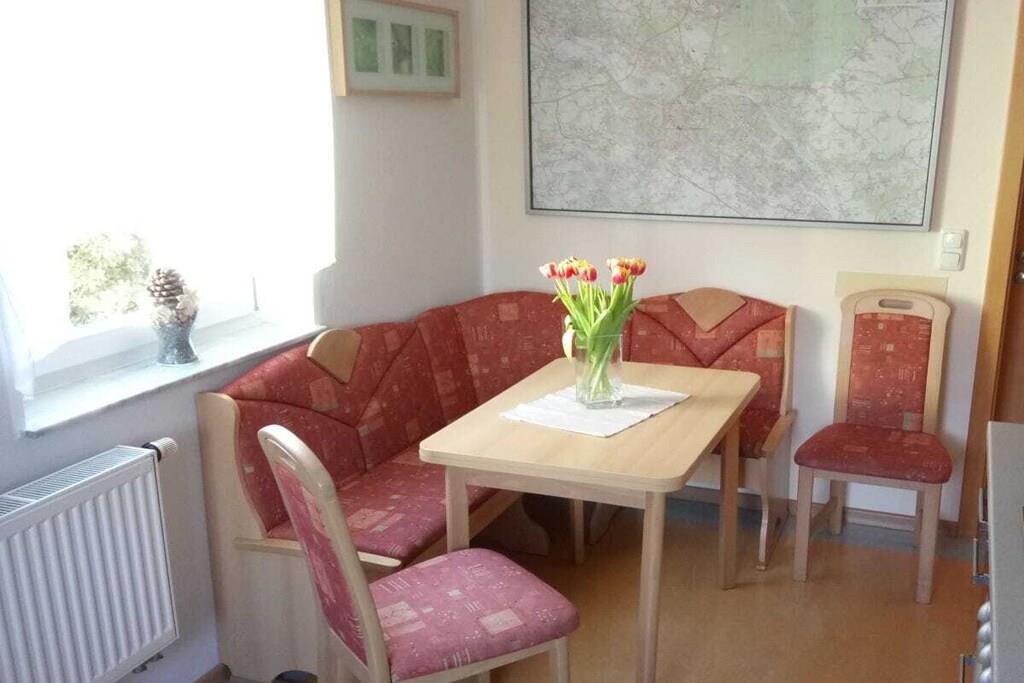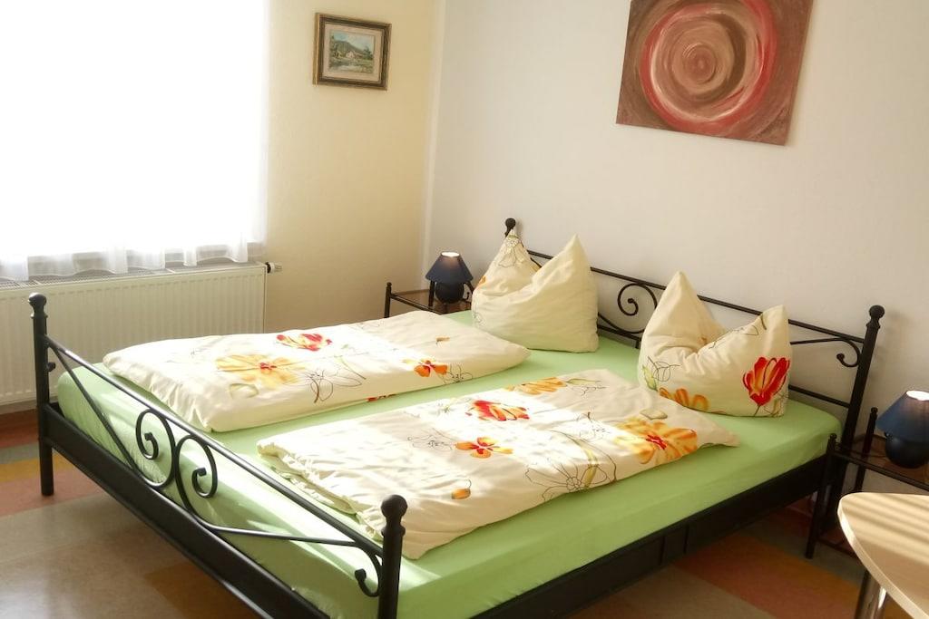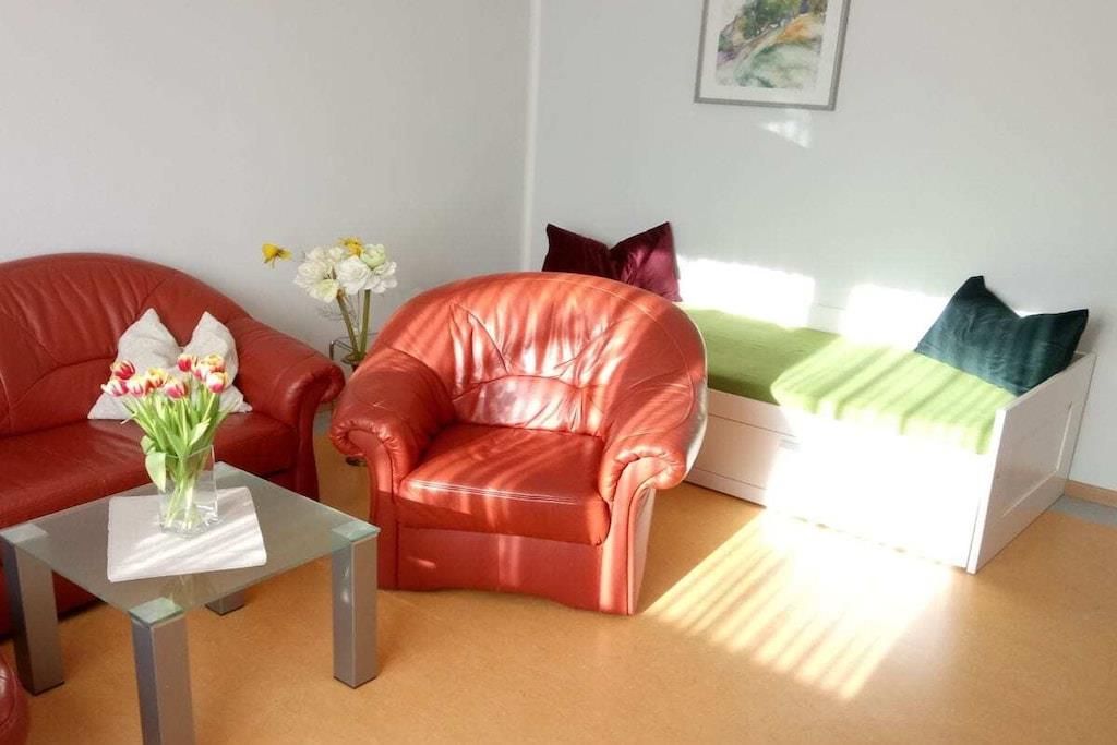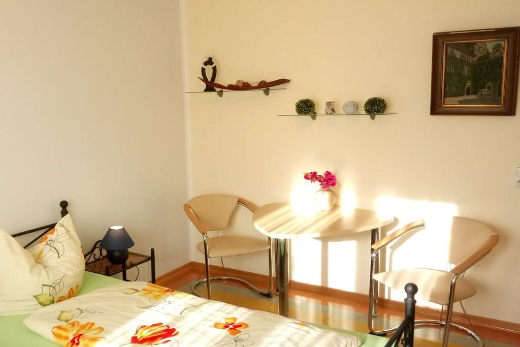Vores moderne ferielejlighed ligger i den vestlige del af Dresden, centralt, men roligt, i stueetagen af vores tofamiliehus. Den er ideel til 2-5 personer, med mulighed for en ekstra seng til op til 6 gæster. Den har en central stue, 2 soveværelser, et køkken med spiseplads og 2 badeværelser. Lejligheden er hyggelig og komfortabelt møbleret. Den tilbyder hvile og afslapning. Om sommeren kan du nyde morgenmad og grillmad i haven.