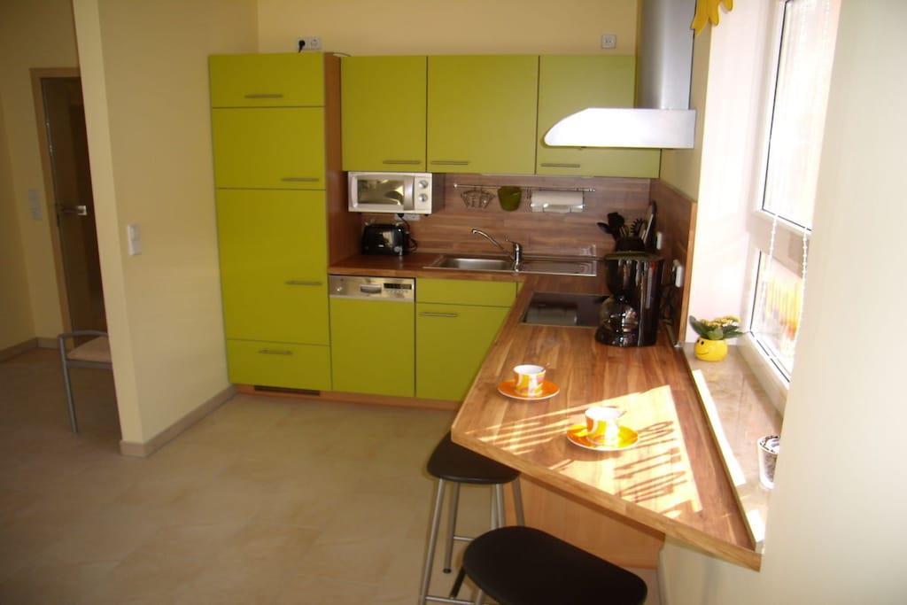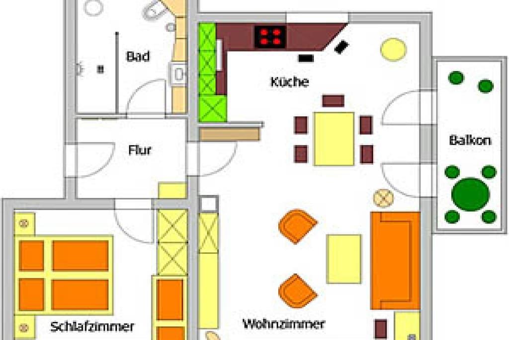Denne komfortable, ikke-ryger ferielejlighed med to værelser i den hævede stueetage med et boligareal på cirka 55 m² og en 7,5 m² altan ligger i en nyopført lejlighedsbygning. Lejligheden er moderne og indbydende møbleret. Soveværelset har en dobbeltseng og en juniorseng (70 x 160 cm). Stuen har en sovesofa til en ekstra gæst. Opholdsstuen indeholder også et stort LCD-tv med kabeltilslutning, en dvd-afspiller, en radio, et fladskærms-tv og et skrivebord. Internetadgang er tilgængelig via bygningens Wi-Fi. Det moderne, åbne tekøkken er integreret i opholdsstuen og udstyret med alle nødvendige apparater.