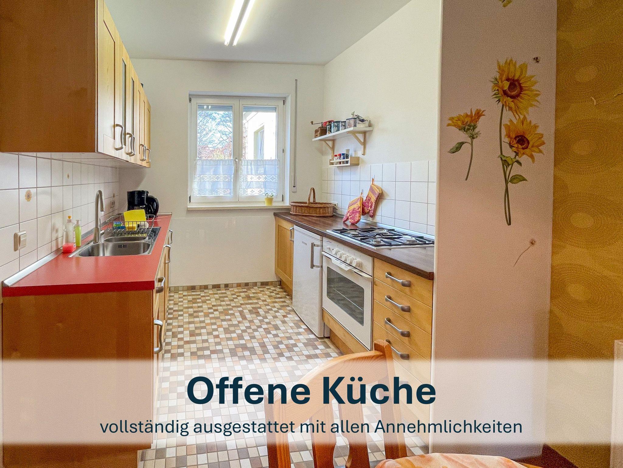 Im Eingangsbereich befindet sich linkerhand das moderne Badezimmer mit Dusche, WC, Waschbecken und Fußbodenheizung. Geradezu kommen Sie in den großzügigen Wohnbereich, wo sich die vollständig ausgestattete Küche und der Esstisch befinden.