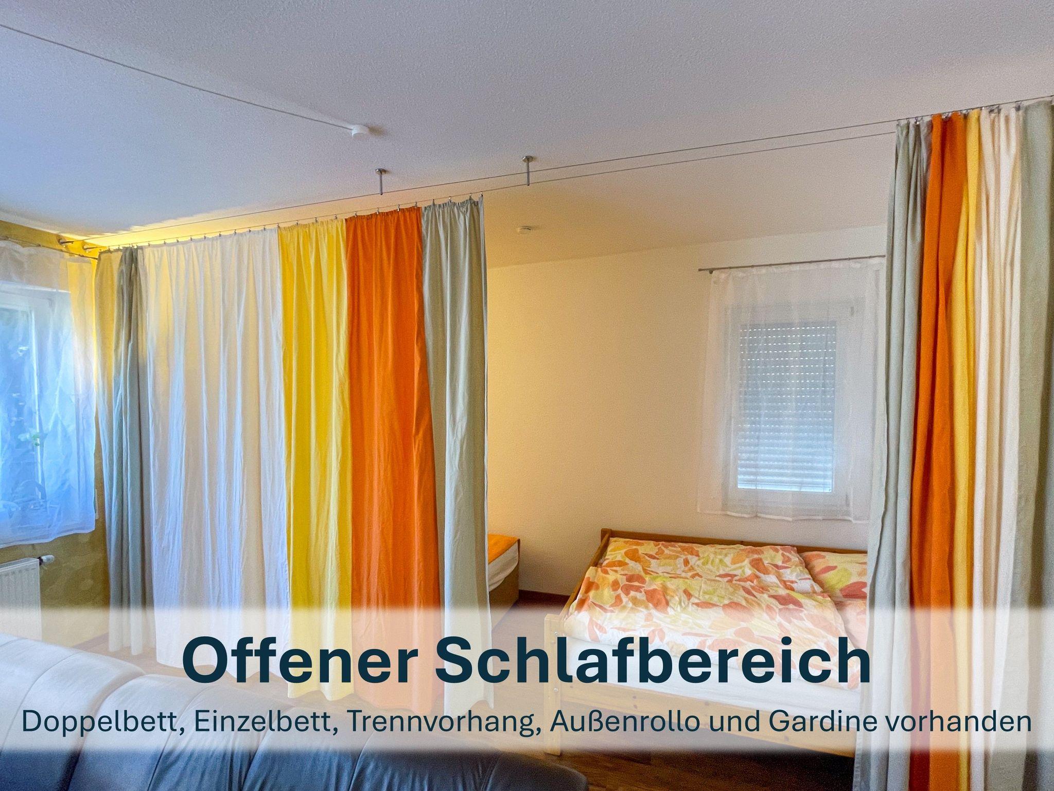 Über drei kleine Stufen kommen Sie zum Schlafbereich mit einem Doppel- und einem Einzelbett, welcher durch einen textilen Raumteiler vom Wohnbereich getrennt wird.