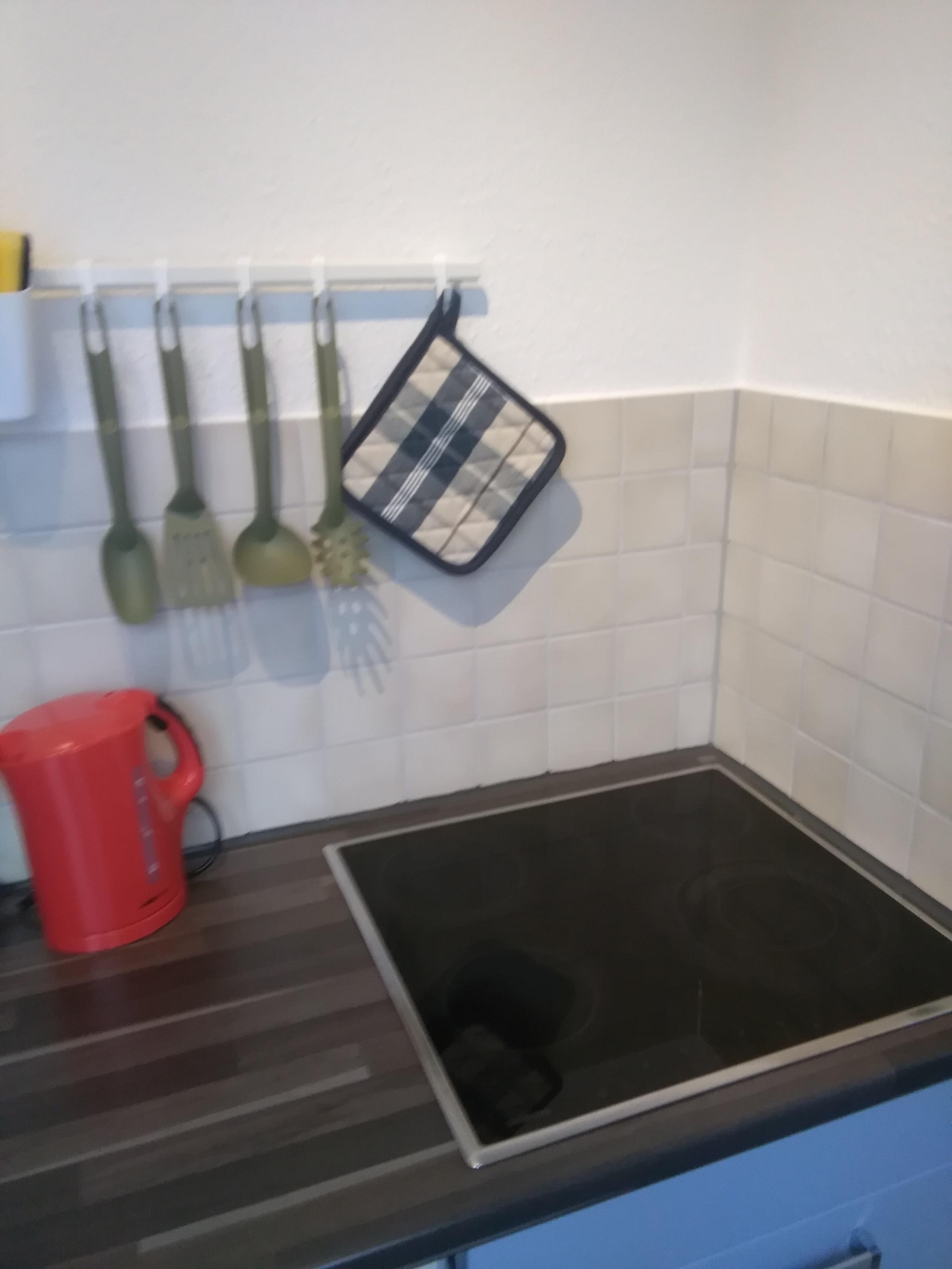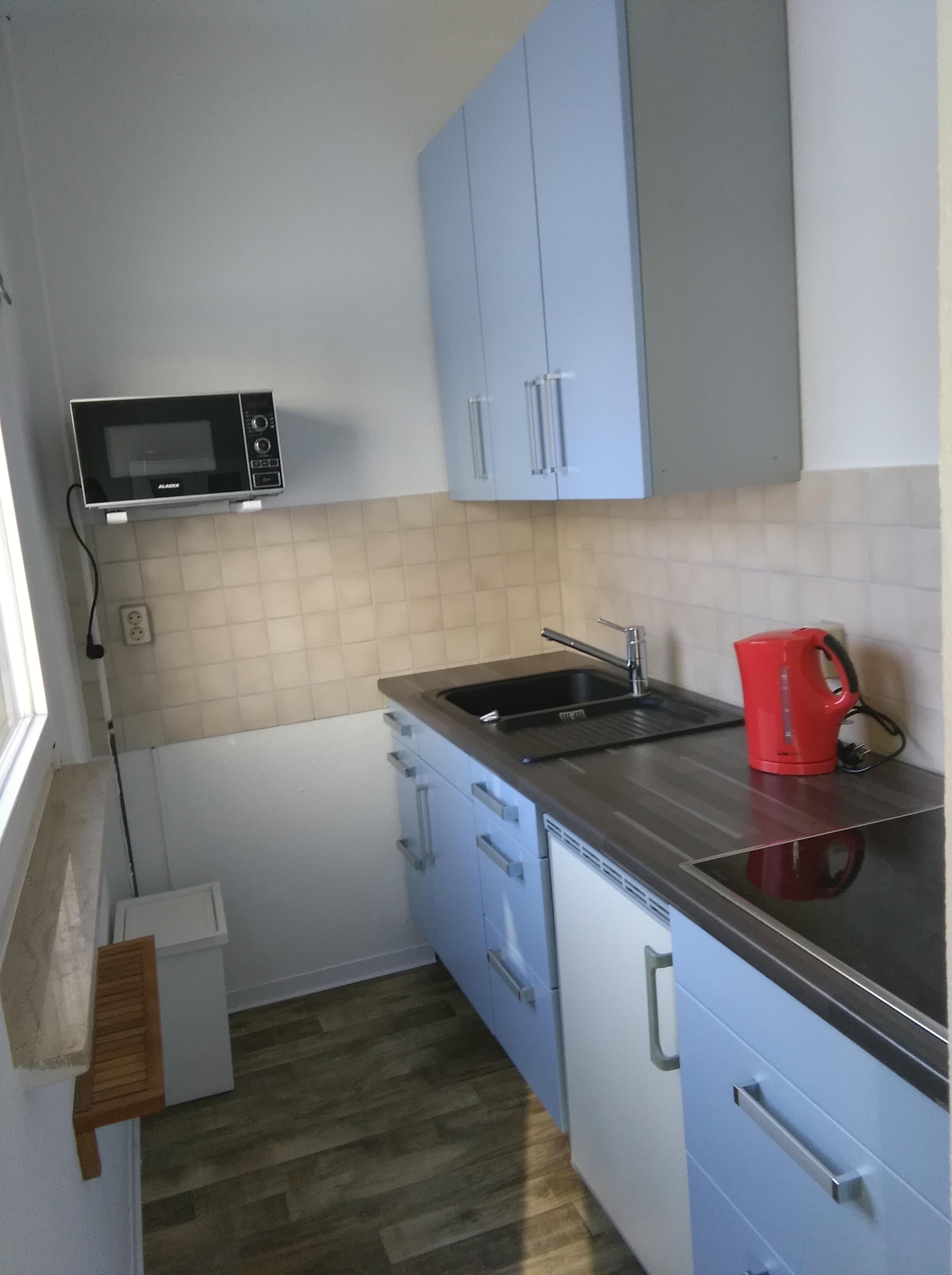 Die Wohnung besteht aus einem Wohn-/Schlafzimmer, Küche, Bad mit Dusche und WC und einem kleinen Flur. Die Küche ist ausgestattet mit 4 Herdplatten, Kühlschrank, Mikrowelle, Kaffeemaschine, Toaster, Wasserkocher und was man sonst so zum kochen benötigt. Kaffee, Tee, Salz, Pfeffer und Öl stehen zur Verfügung.