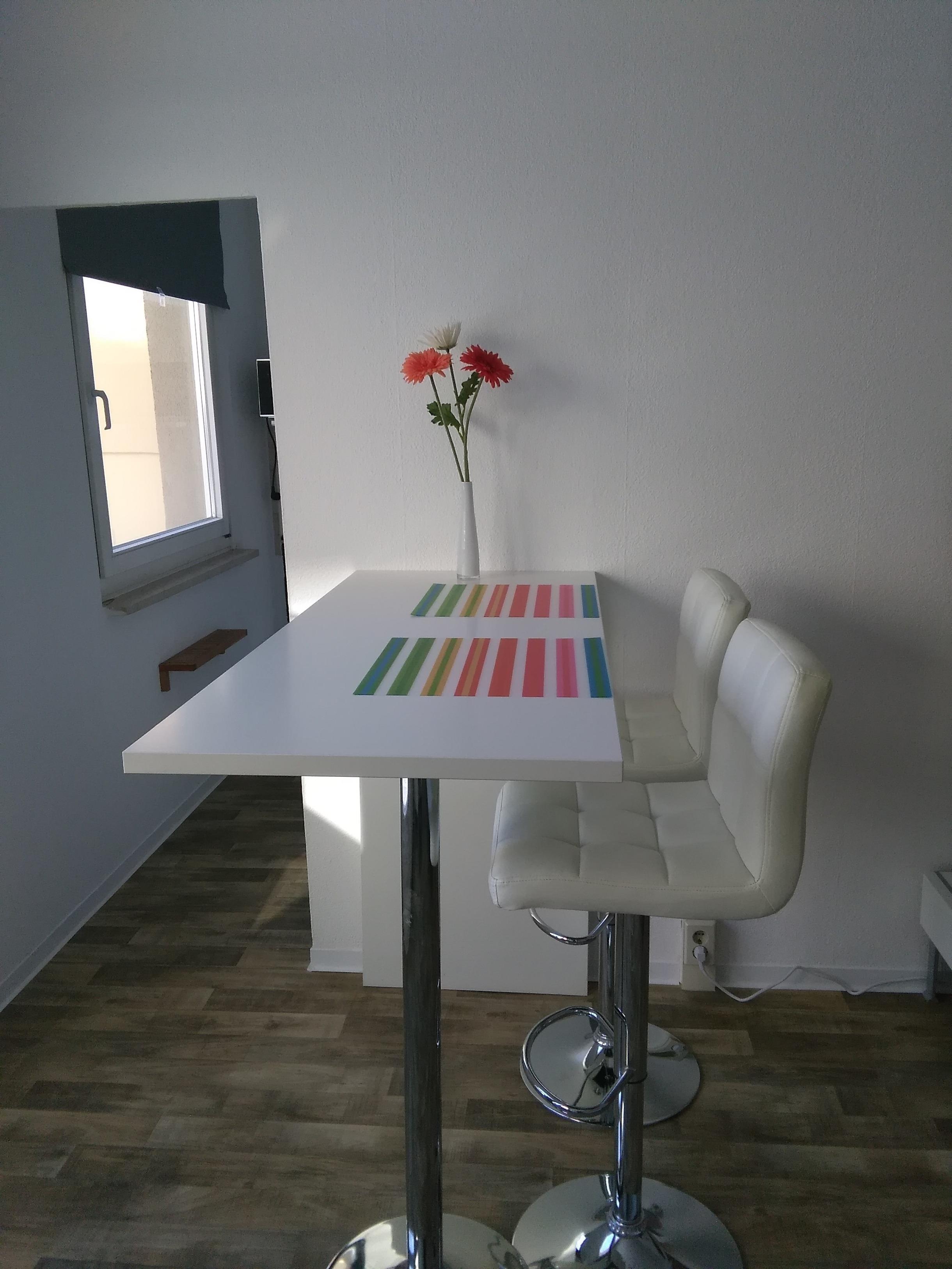 Im Wohn-/Schlafbereich findet man ein gemütliches Doppelbett (1,80m), Schrank, Kommode und einen modernen Essbereich mit Barhockern. TV und WLAN gibt es selbstverständlich auch.