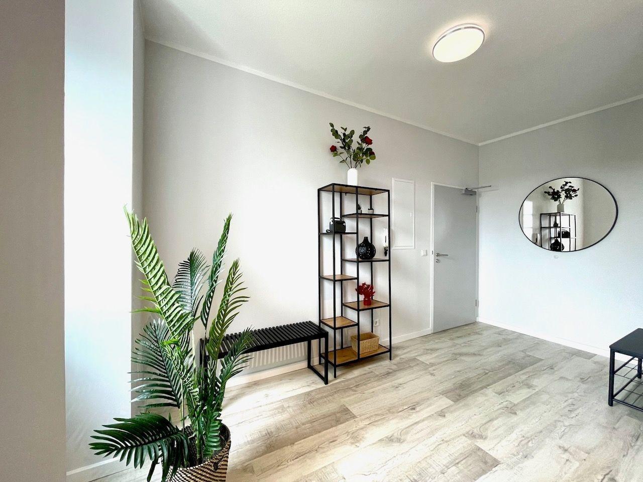 Der offene und lichtüberflutete Eingangsbereich, gewährt sofort nach dem Öffnen der Wohnungstür einen Einblick, in das geräumige Apartment.