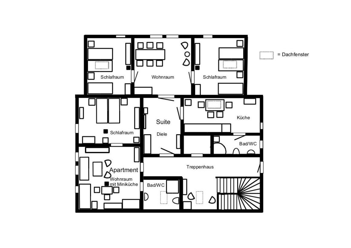 Die Suite der "Villa Elsa" befindet sich in der 2. Etage (kein Aufzug im Haus). Die Wohnung besitzt zwei separate Schlafzimmer mit jeweils einem Doppelbett (180 x 200 cm) und einem Einzelbett (90 x 200cm), Die Betten stehen unter Dachschrägen, ein Wohnzimmer mit Fernseher, Radioanlage und großen Esstisch mit Stühlen und eine Sitzecke, eine geräumige Diele, eine große Komplettküche (mit Dachschräge) und ein Bad/WC. Die Küche ist komplett eingerichtet mit Elektroherd mit Ceranfeld und Backofen, Kühlschrank/separates Gefrierfach, Geschirrspüler, Toaster, Wasserkocher, Kaffeemaschine, Eierkocher, Mikrowelle und ein Esstisch mit Stühlen. Im Bad ist eine Dusche, ein Waschbecken und WC.