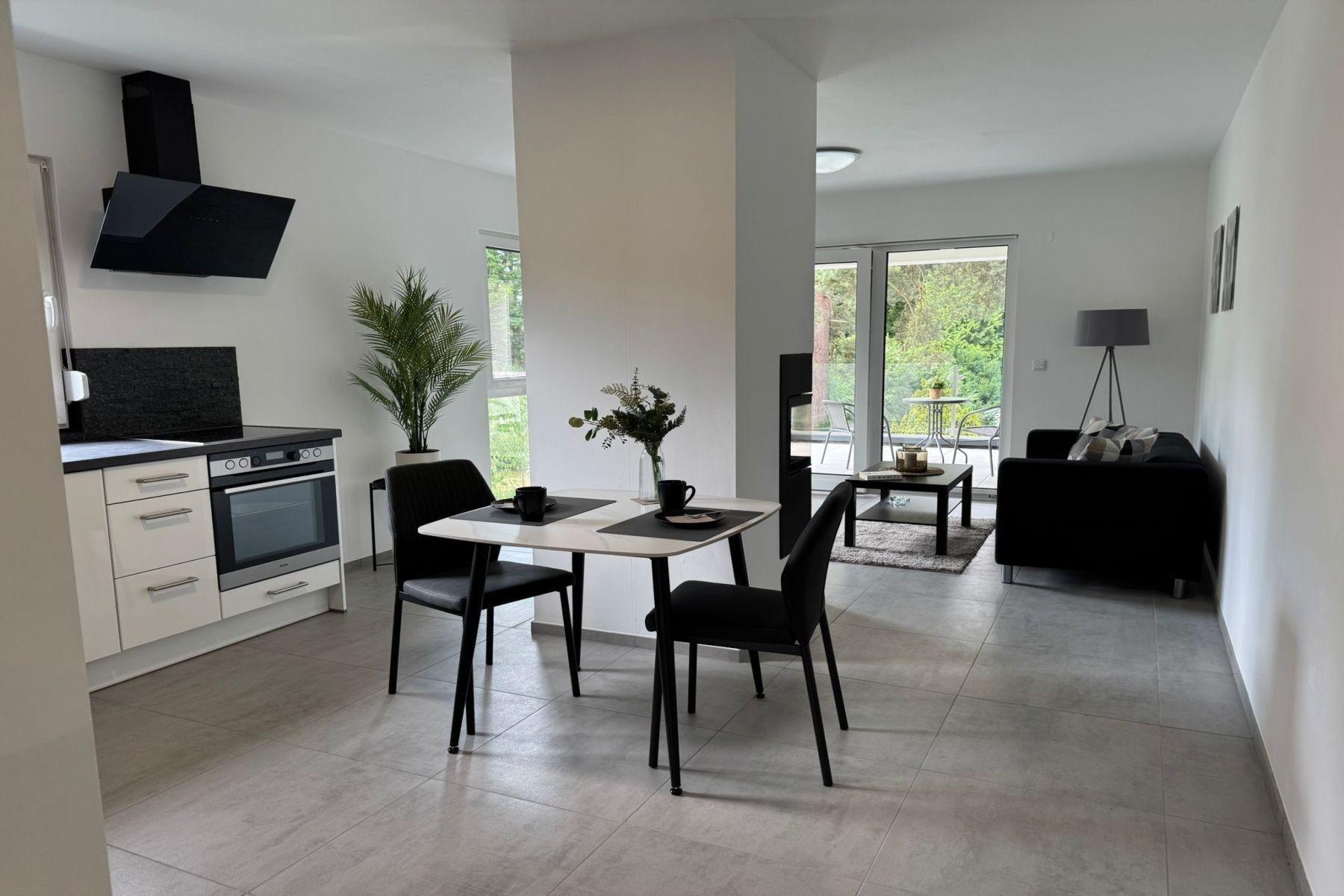 Der offen gestaltete Wohn- und Essbereich bildet das Herzstück der Wohnung. Die voll ausgestattete, hochwertige Küche verfügt über einen Backofen mit Cerankochfeld, Kühlschrank, Geschirrspüler, Kaffeemaschine, Wasserkocher und Toaster – ideal für Selbstversorger oder Genießer eines gemütlichen Frühstücks.