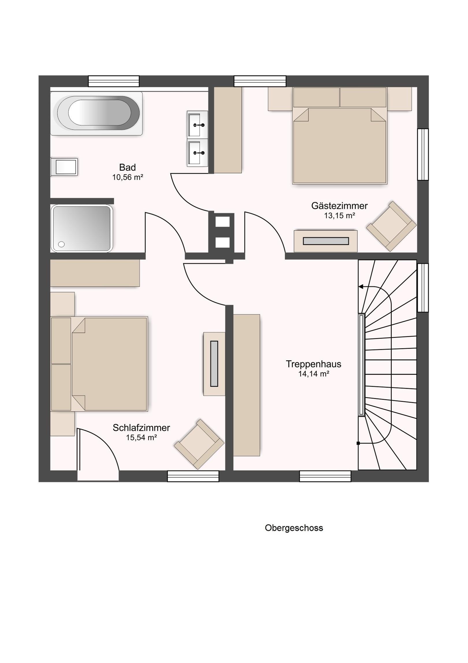 Das Schlafzimmer im OG liegt in Richtung Osten, so dass Sie jeden Morgen von der Sonne geweckt werden können. Ein weiteres Gästezimmer ist auf derselben Etage.
