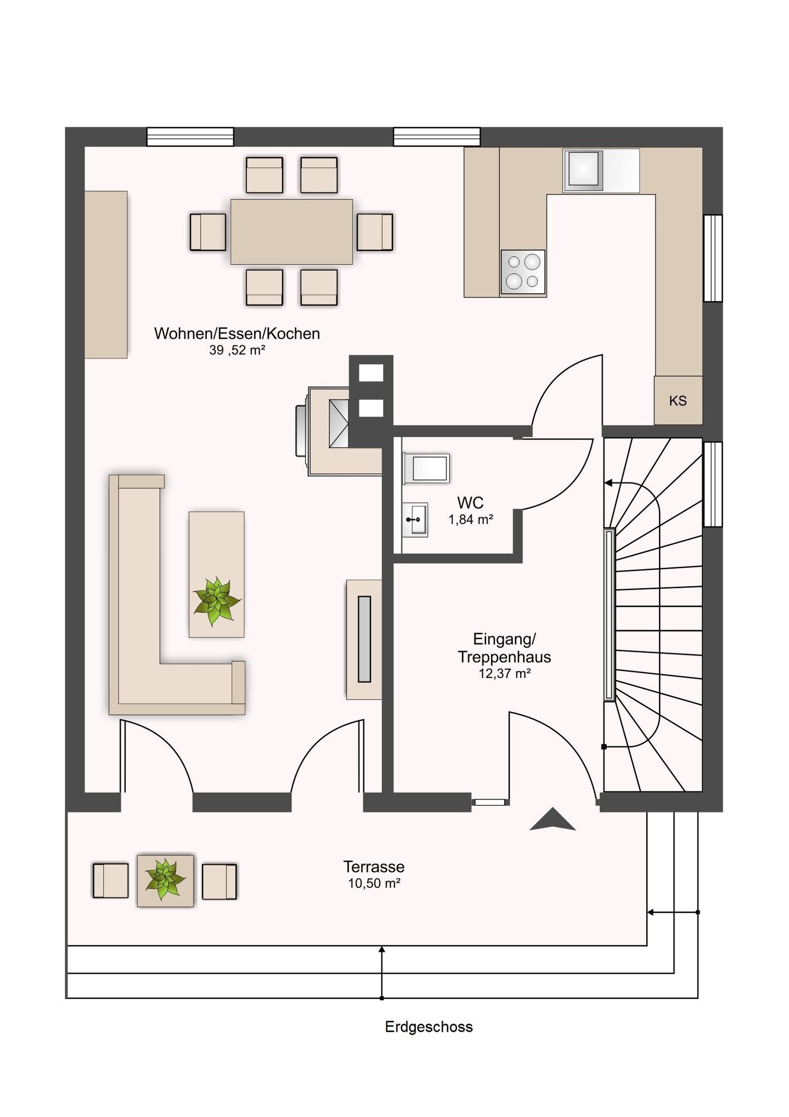 Die moderne Küche mit ihrer Insel grenzt an den Wohn/Essbereich an und lädt zum gemeinsamen Kochen ein.