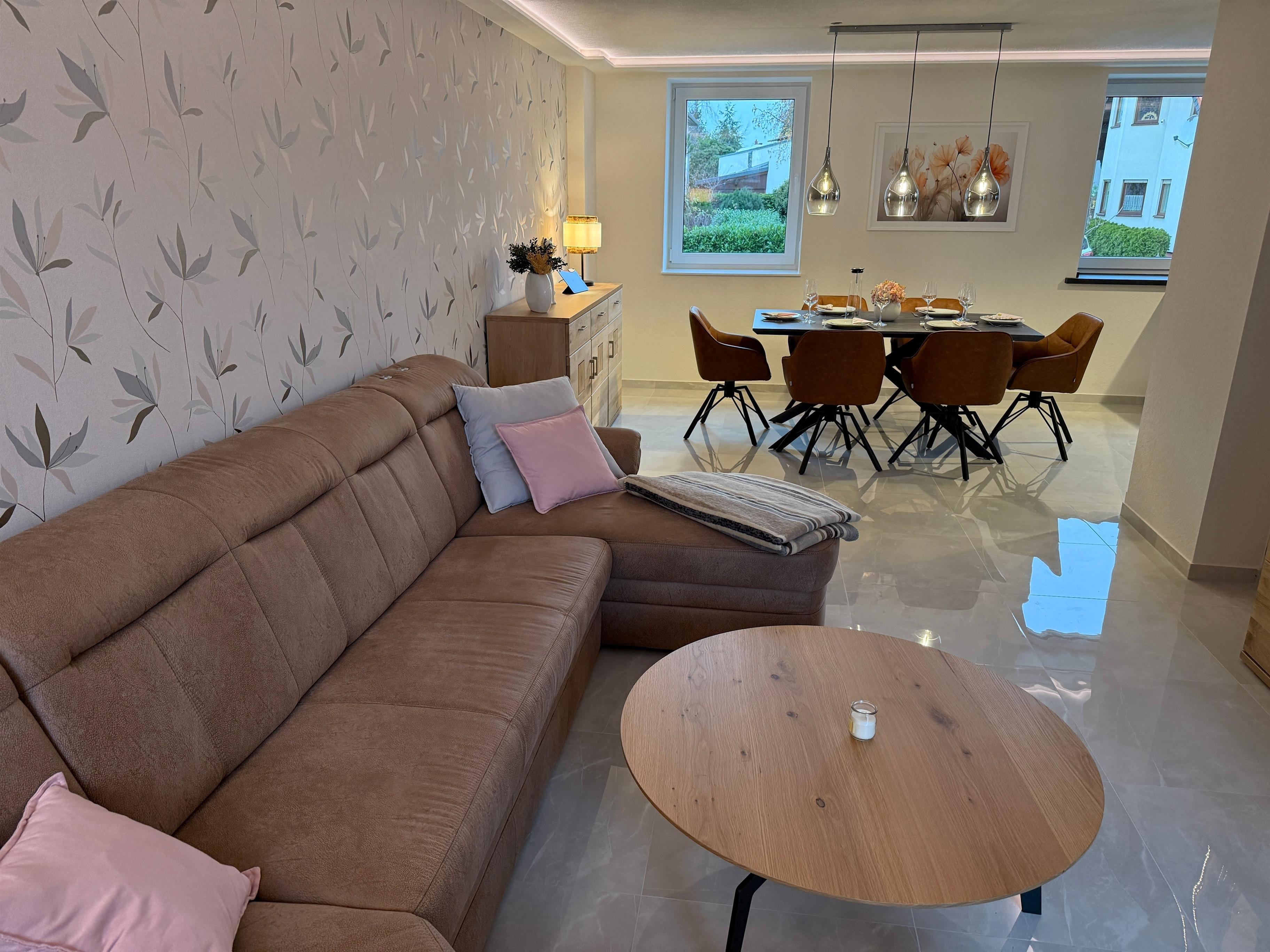 Der gut geschnittene und sehr bequeme eingerichtete Wohn/Essbereich bildet das Herzstück des schönen Ferienhauses, die einladende Süd/Ostterrasse mit Sitzgruppe betreten Sie stufenlos aus dem Wohnzimmer.