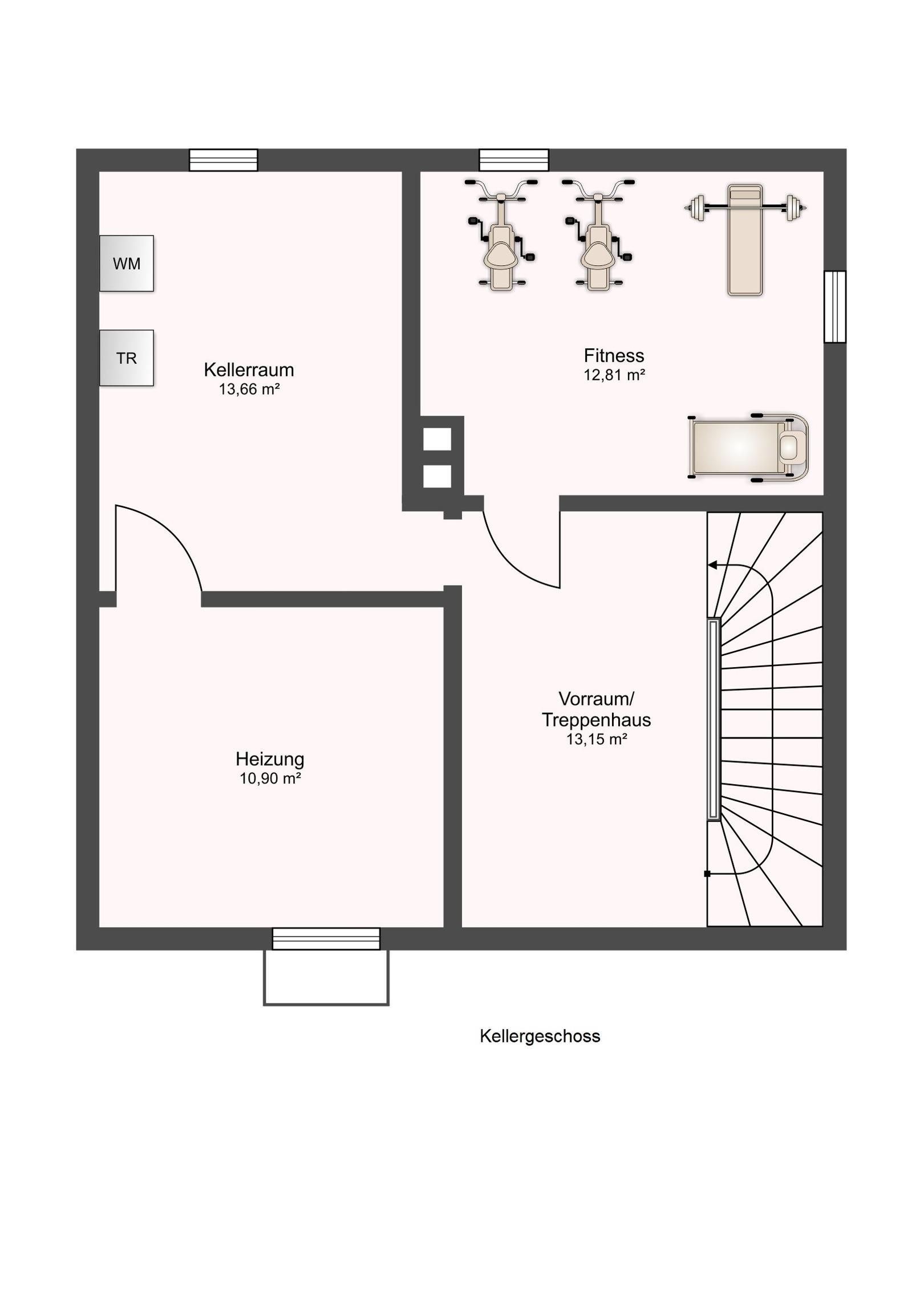 Im Kellergeschoss gibt es einen kleinen Fittnessraum und eine Wäscheraum mit Waschmaschine und Trockner.