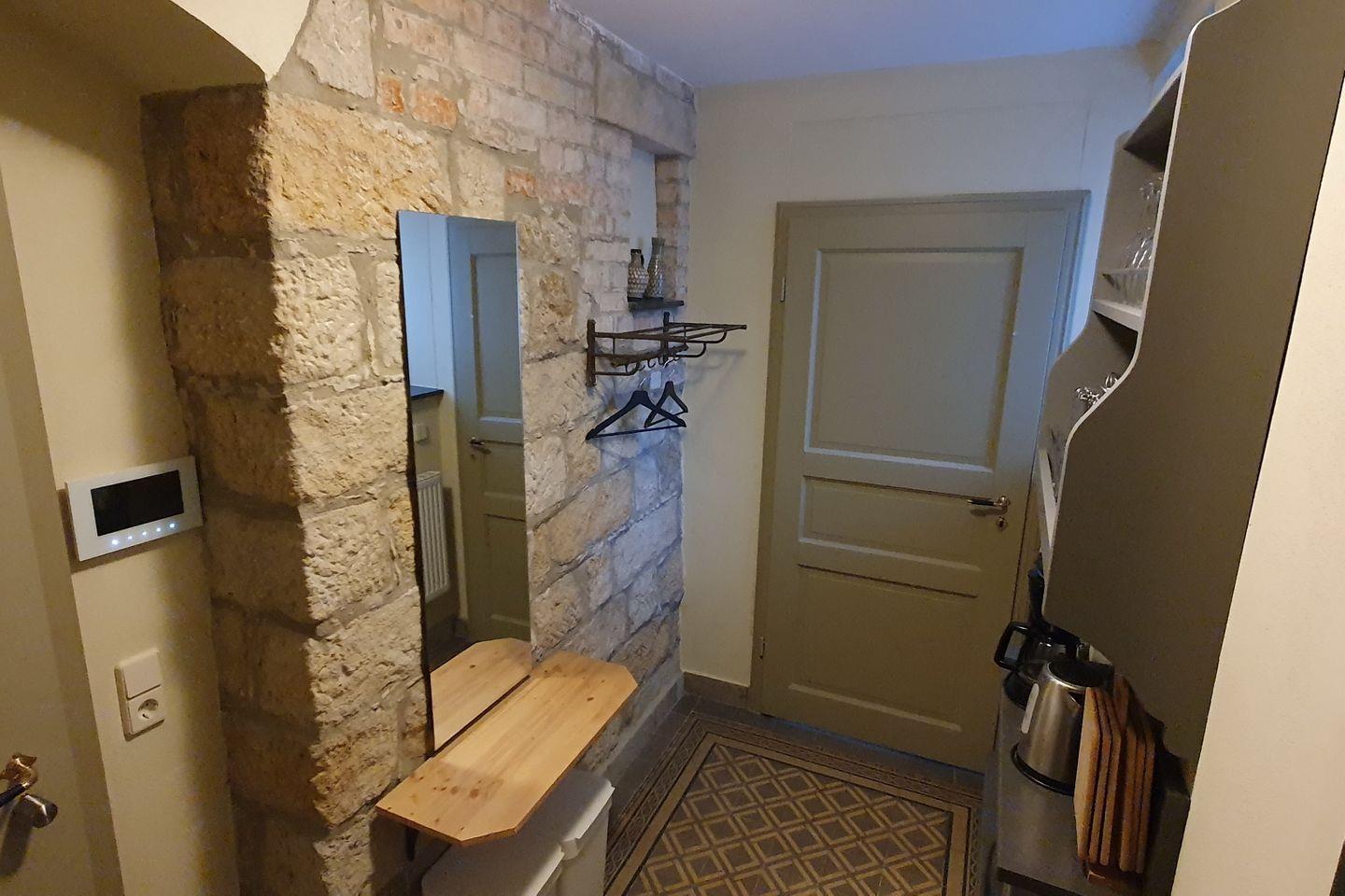 Die Historischen Fliesen stammen noch aus der Zeit, als hier Dienstboten- und Wirtschaftsräume untergebracht waren. Das sorgfältig freigelegte Mauerwerk aus schweren Sandsteinblöcken schafft ein angenehmes Raumklima, im Winter warm - im Sommer kühl. Liebevoll restauriert und mit moderner Technik ergänzt lässt es sich im Apartment Frieda gemütlich und komfortabel wohnen.