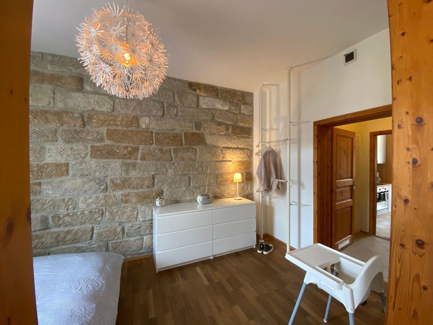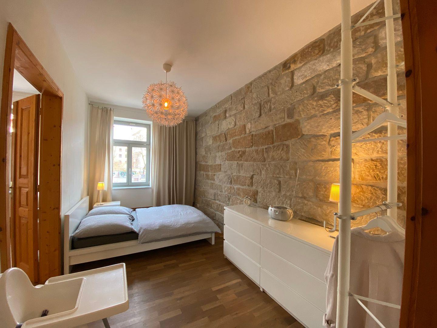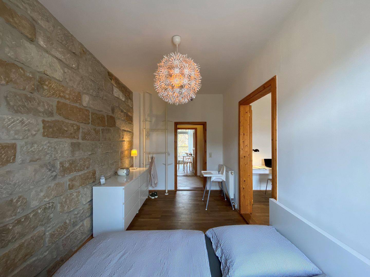 Zur Wohnung gehört ein geräumiges Wohnzimmer mit TV und Schlafcouch für 1 Person. Zum Arbeiten steht außerdem ein Schreibtisch bereit. Vom Wohnzimmer gelangt man durch die hübsche Flügeltür in das Schlafzimmer mit Sandsteinmauer und Doppelbett.
