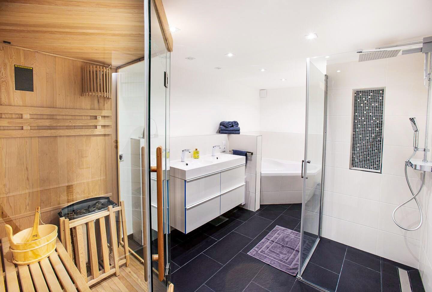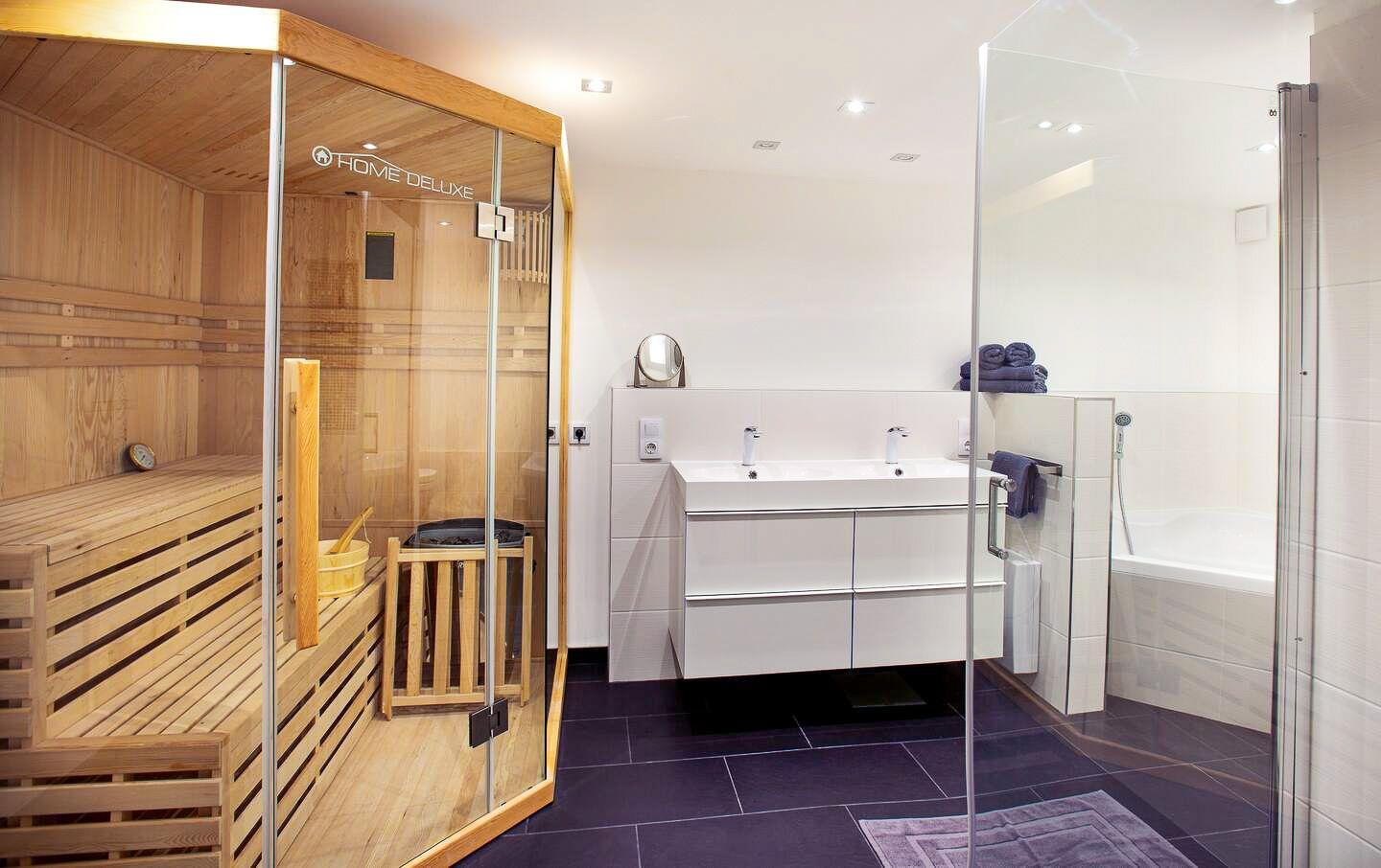 Ein besonderes Highlight ist das Bad. Hier finden Sie neben einem großzügigen Doppelwaschtisch auch eine Dusche und eine Badewanne. Zusätzlich bieten wir Ihnen den besonderen Luxus einer privaten Sauna.