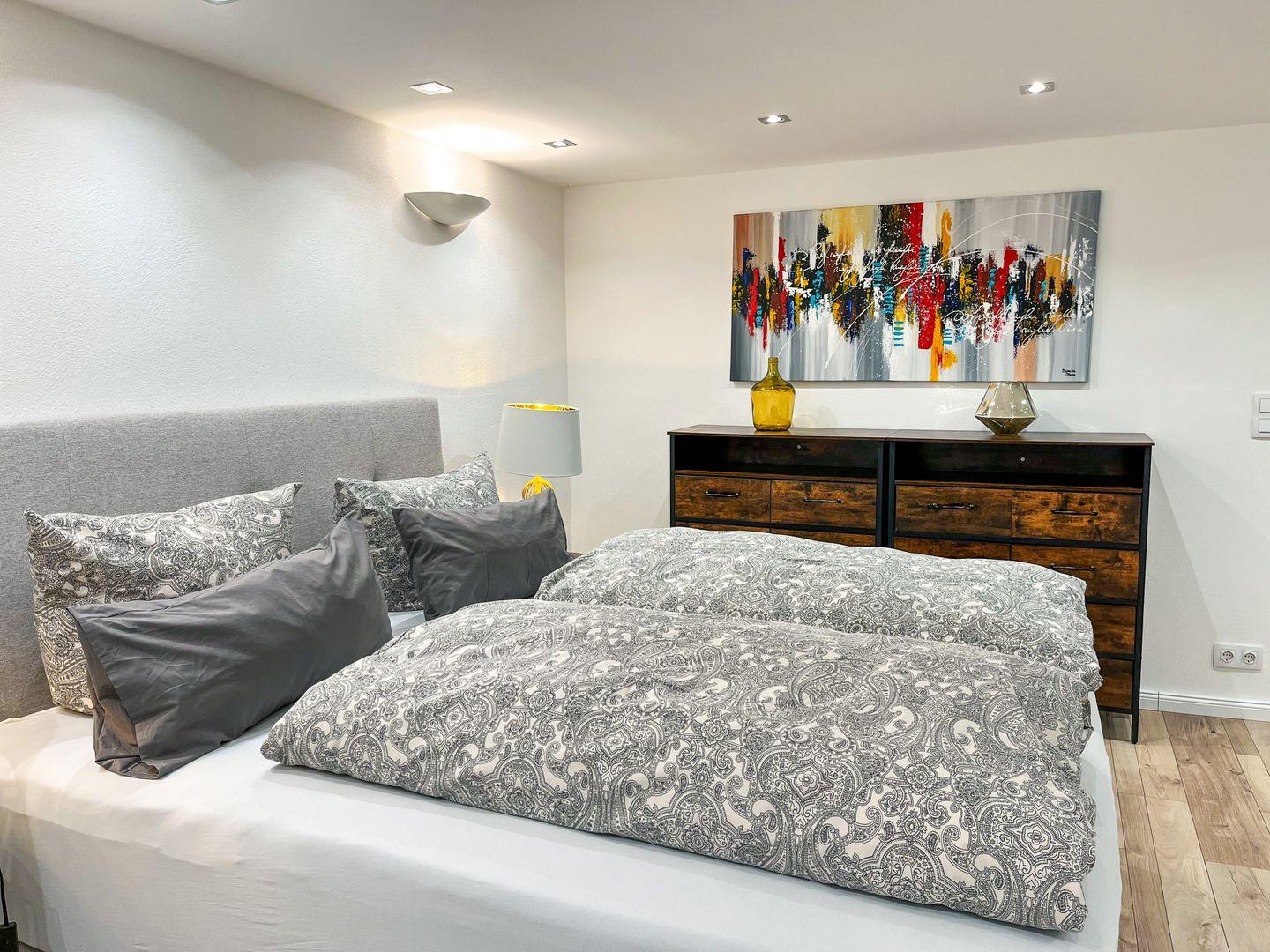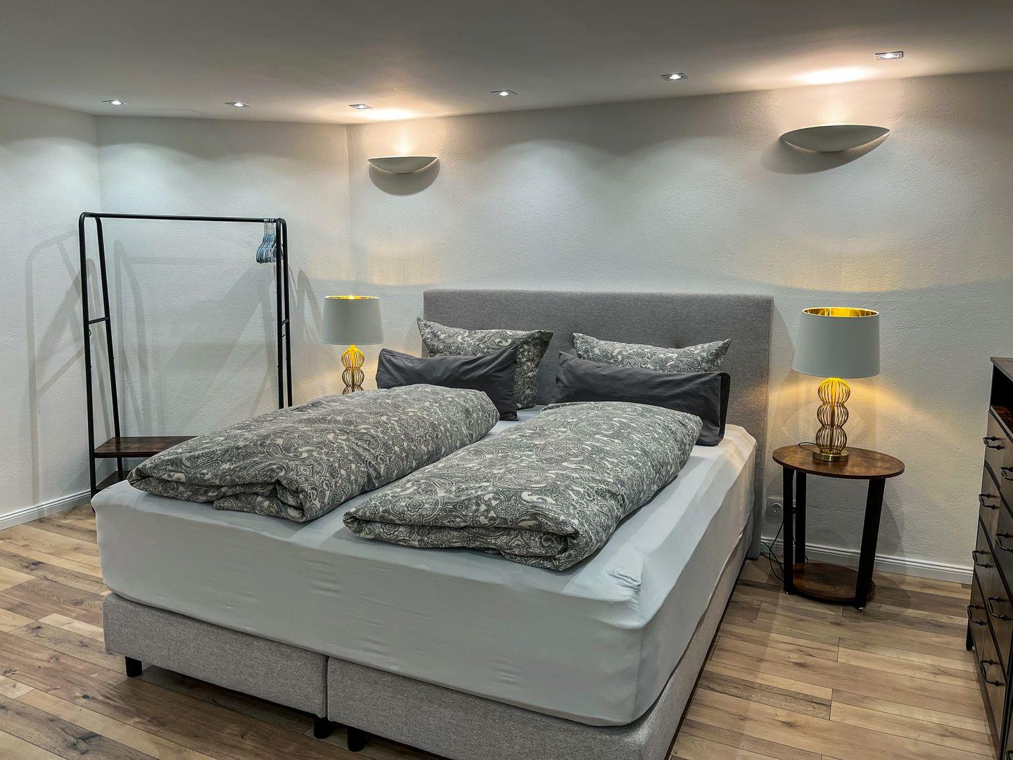 Vom Flur, welcher eine kleine separate Sitzecke bietet, gelangen Sie zum Schlafbereich. Hier wartet ein großes, gemütliches Boxspringbett auf Sie. Das Schlafzimmer ist, wie auch der Wohnbereich, mit einem Smart-TV ausgestattet.