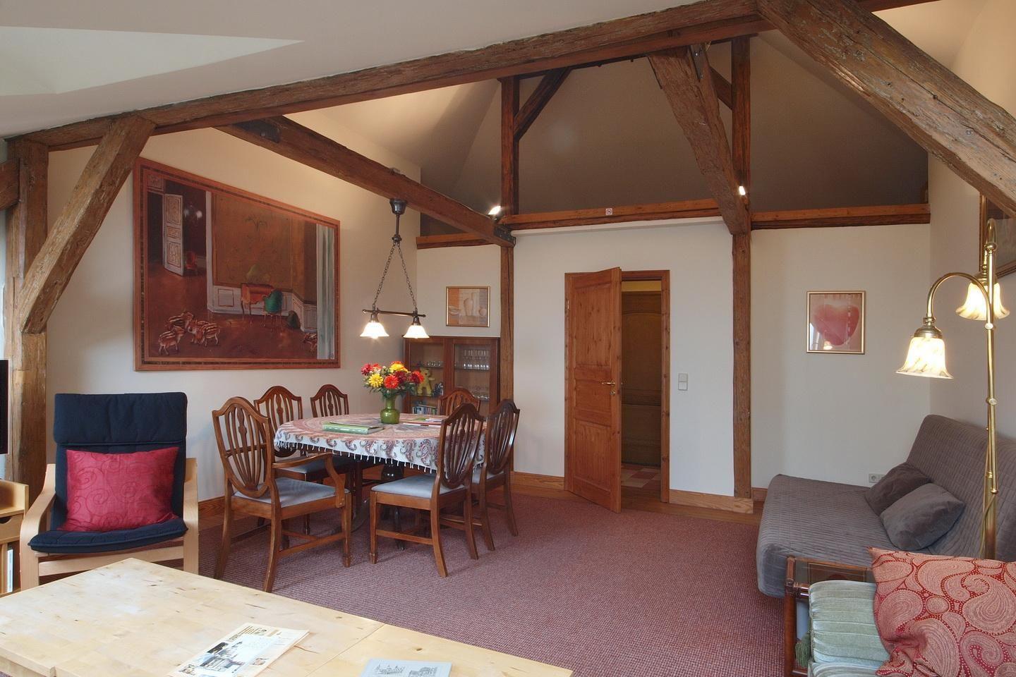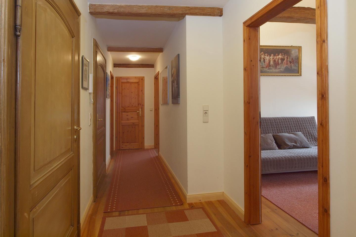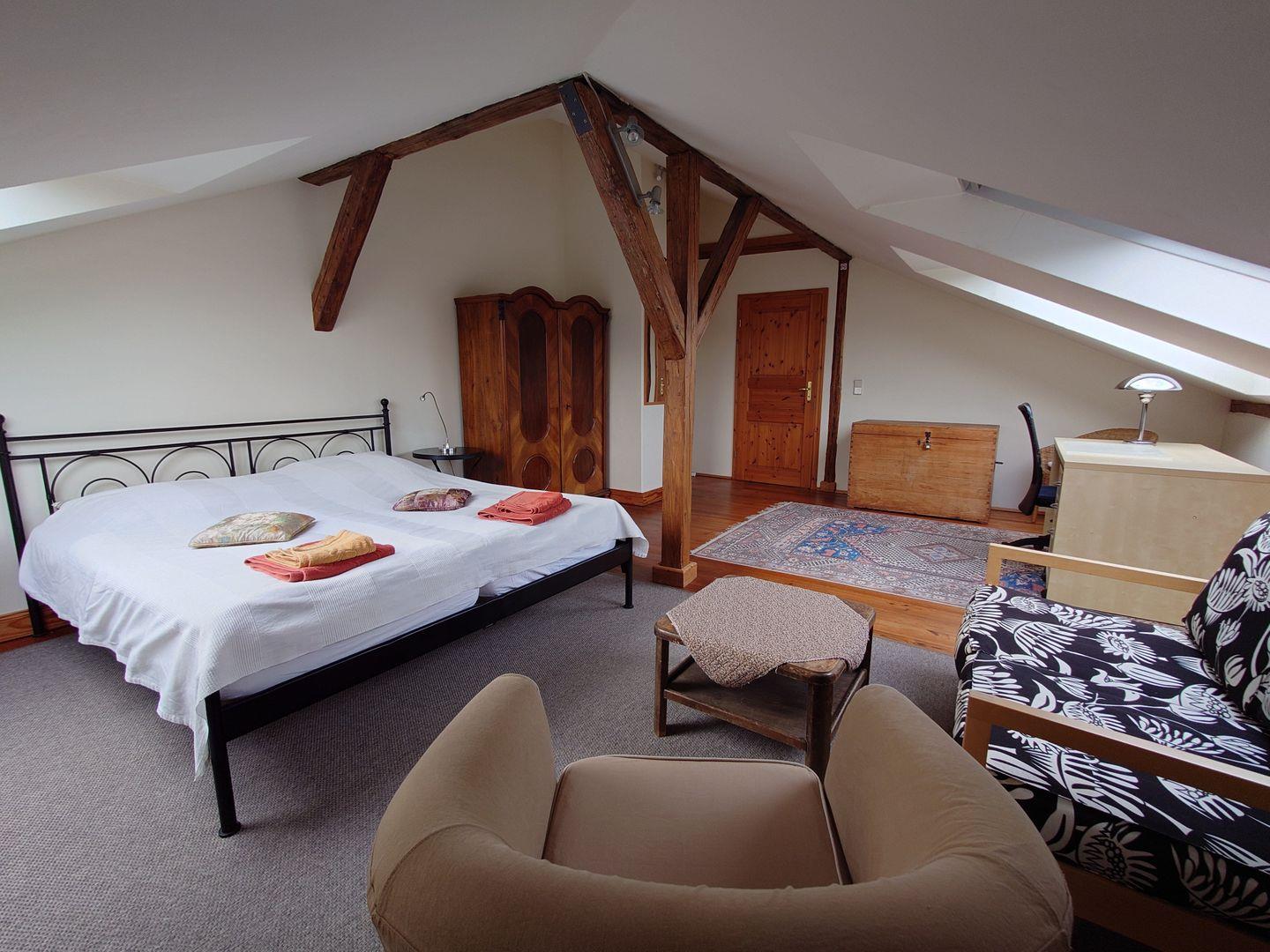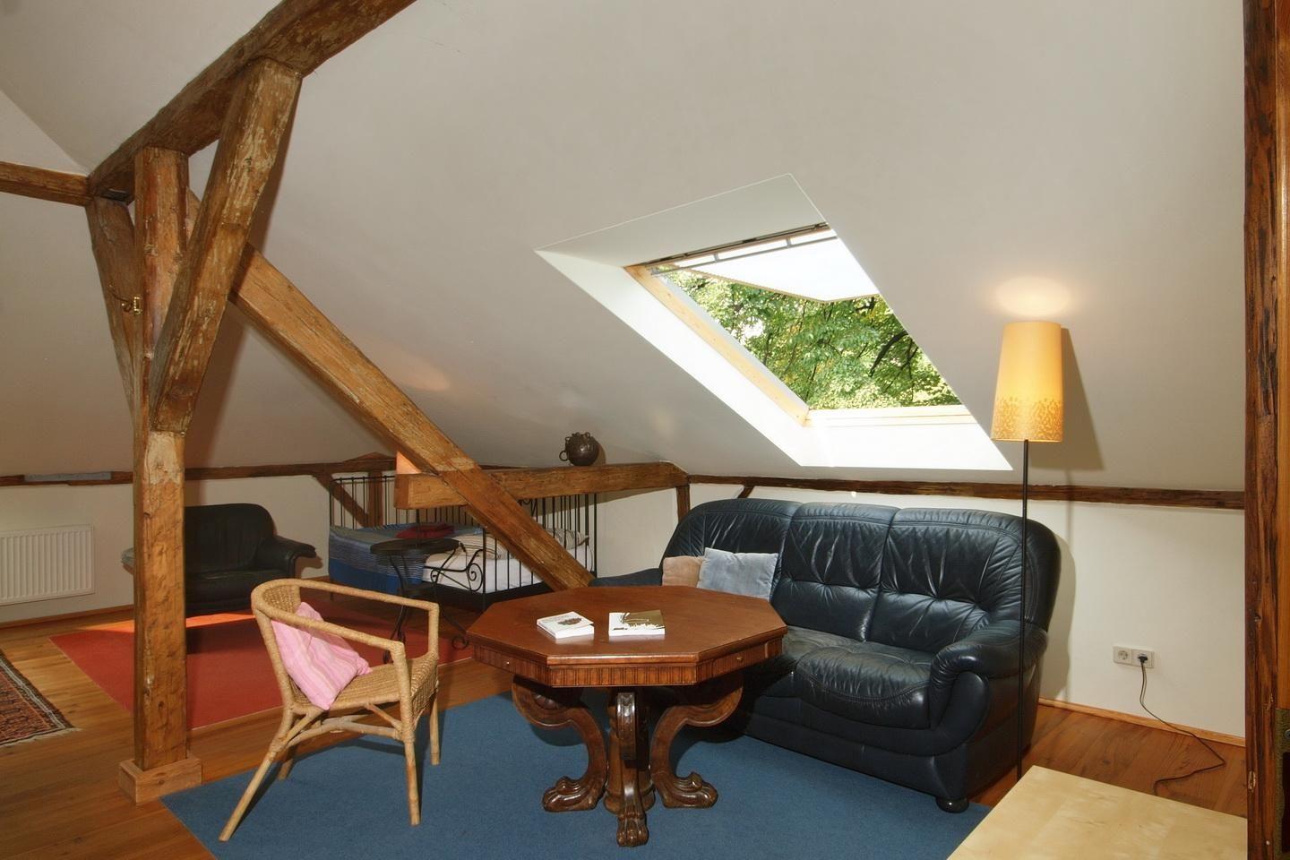 Über das prächtige Marmortreppenhaus betritt man den ehemaligen Speicher. Ganz bewusst ist hier der historische Dachstuhl sichtbar gelassen. Genießen Sie die zentrale Lage, die sonnigen Räume und jede Menge Platz. Liebevoll restauriert und mit moderner Technik ergänzt, lässt es sich in der Villa Haniel gemütlich und komfortabel wohnen.