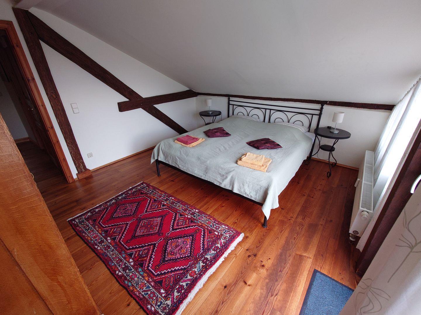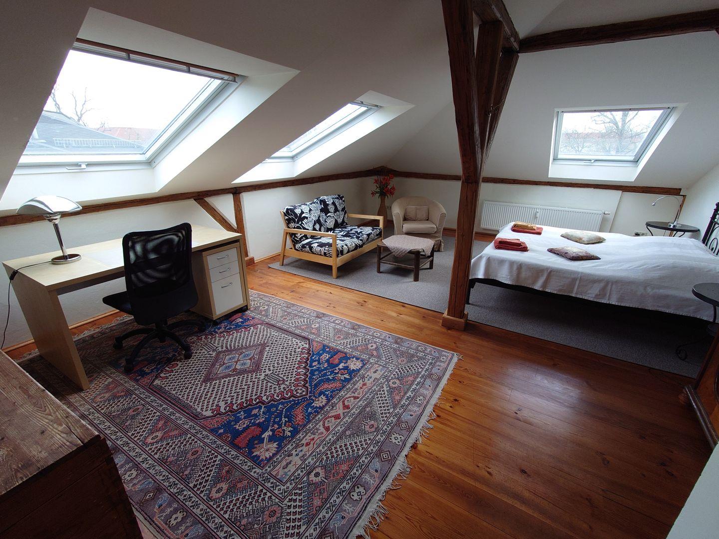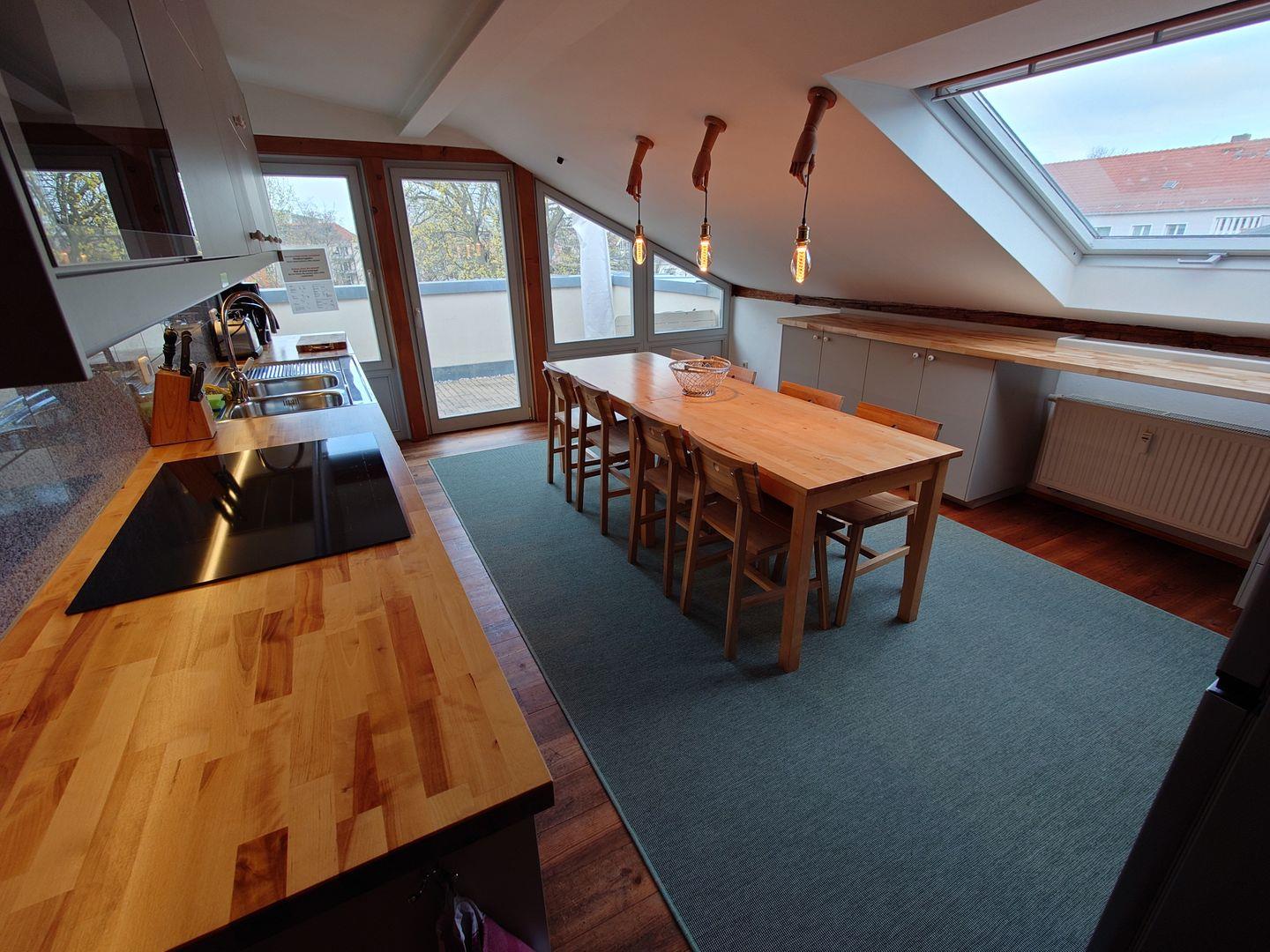 Eine wirklich große Wohnung für die ganze Familie, Freunde, Kollegen... 160 qm, 4 Zimmer, 2 Bäder, 2 Balkone! 4-Raum Wohnung im Dachgeschoss (2. OG) bis 8 Personen, ruhig und zentral nähe Hauptbahnhof gelegen. 2 Schlafzimmer mit Doppelbett, 1 Schlafzimmer mit 2 Einzelbetten und 1 Doppelbettcouch im großen Wohnzimmer. Flur, Garderobe, großer heller Wohnraum mit Esstisch und Couchgruppe, Küche mit Esstisch und Balkon, 3 Schlafräume (2 x Doppelbett, 1 x 2 Einzelbetten), 1 Fensterbad mit Dusche, Waschtisch, WC, 1 Fensterbad mit Wanne, Waschtisch, WC, TV, WiFi. Parkplätze und/oder Garagen können bei Bedarf gegen Gebühr mitgemietet werden. Zur gemeinschaftlichen Nutzung stehen den Gästen eine Fahrradgarage mit E-Bike-Ladestation, Waschmaschine und Trockenraum zur Verfügung. Auch der Garten lädt zum verweilen ein.