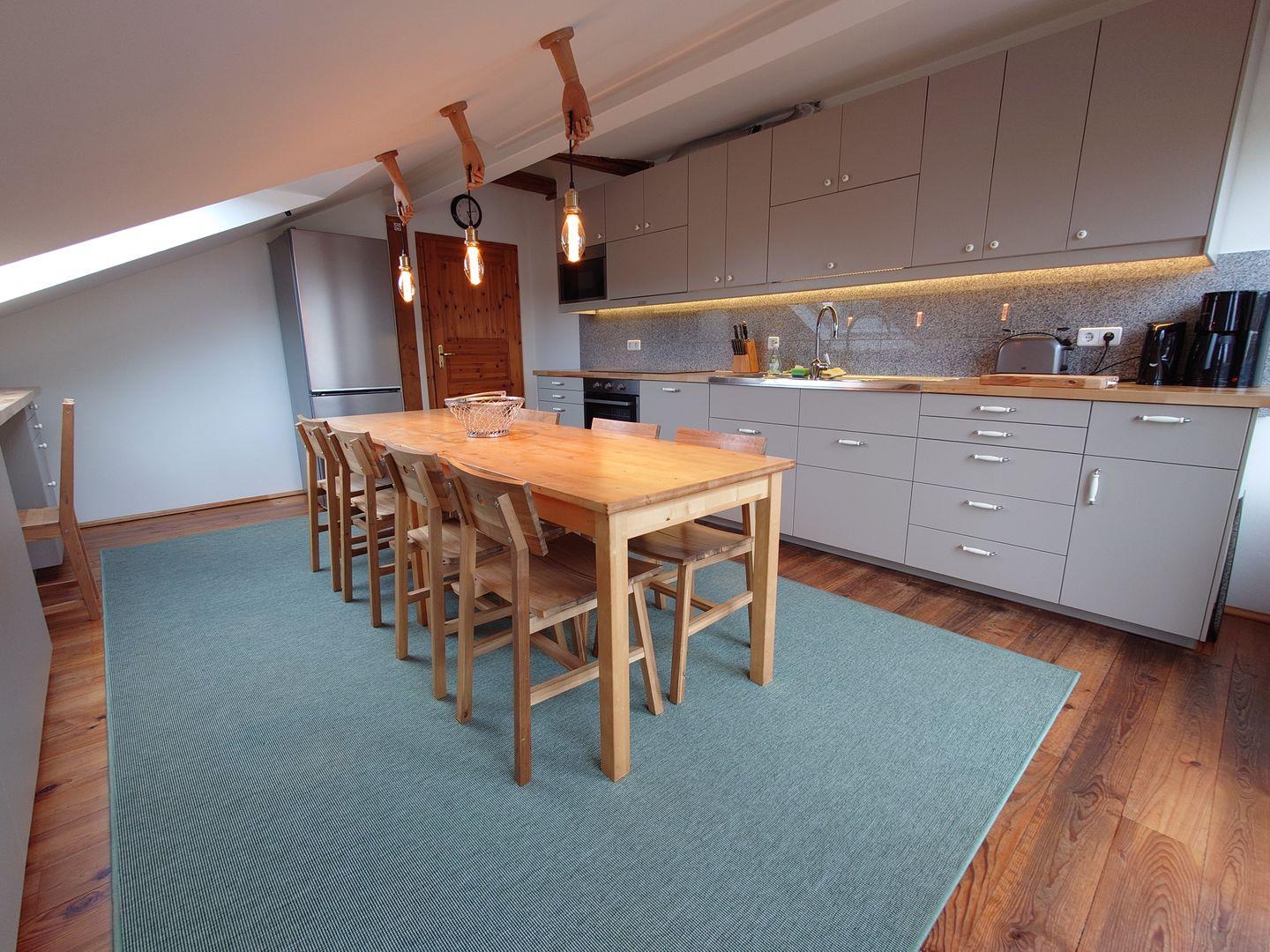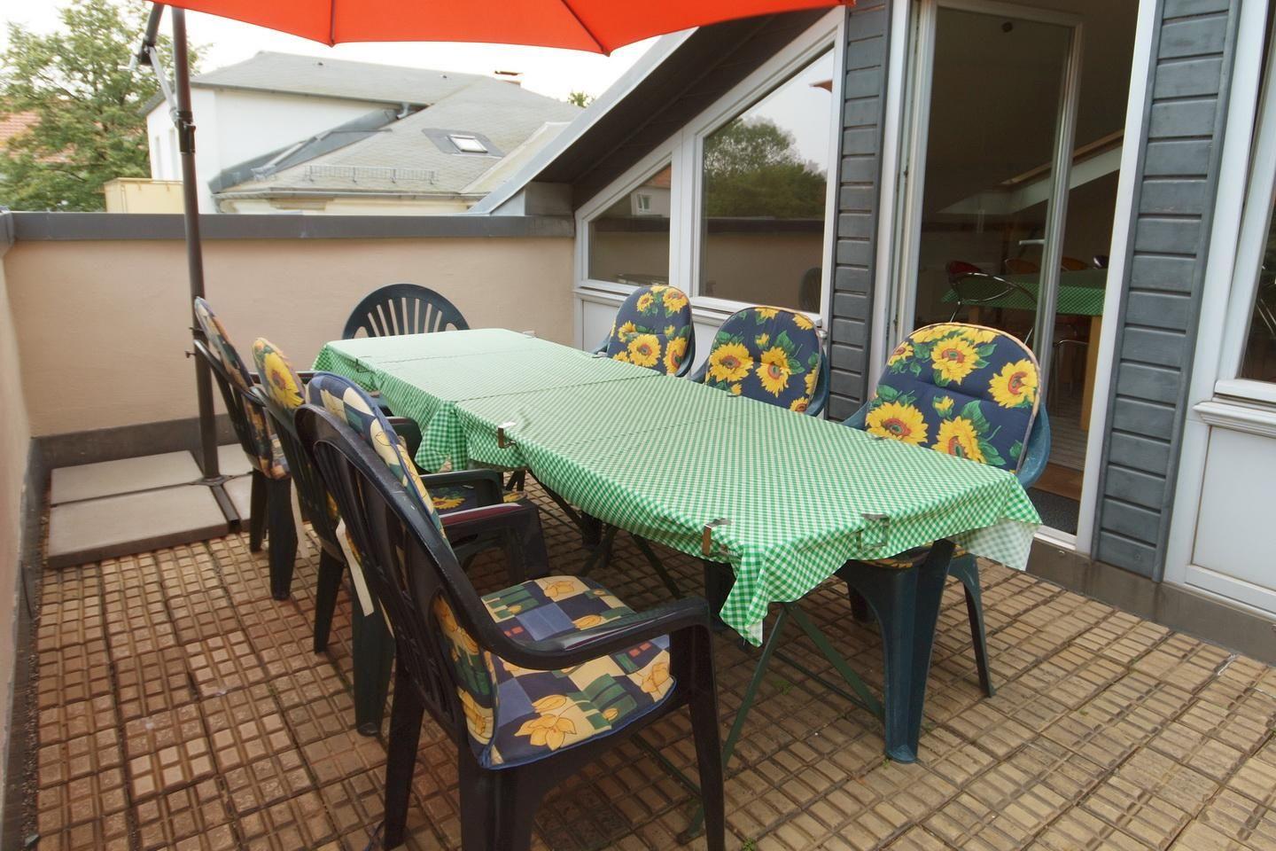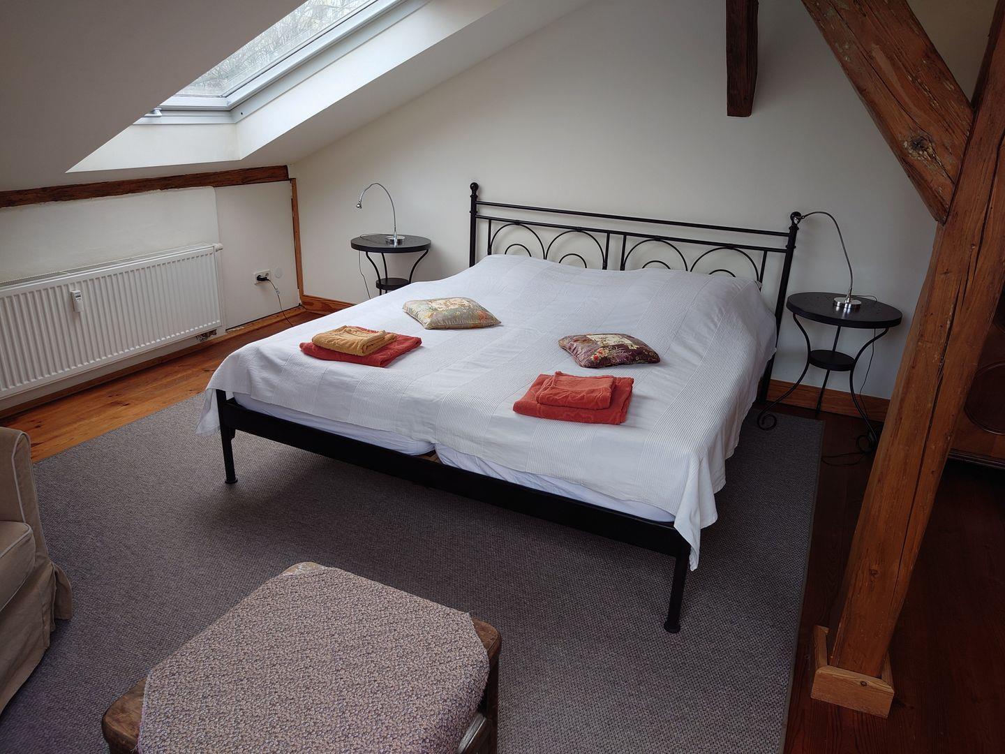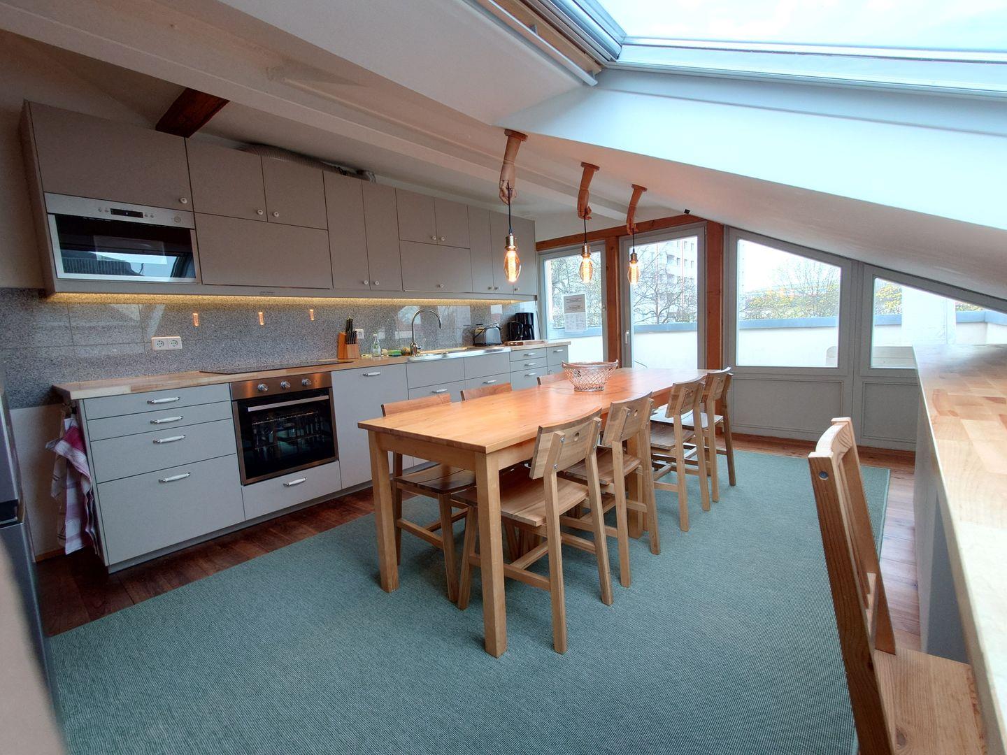 Eine wirklich große Wohnung für die ganze Familie, Freunde, Kollegen... 160 qm, 4 Zimmer, 2 Bäder, 2 Balkone! 4-Raum Wohnung im Dachgeschoss (2. OG) bis 8 Personen, ruhig und zentral nähe Hauptbahnhof gelegen. 2 Schlafzimmer mit Doppelbett, 1 Schlafzimmer mit 2 Einzelbetten und 1 Doppelbettcouch im großen Wohnzimmer. Flur, Garderobe, großer heller Wohnraum mit Esstisch und Couchgruppe, Küche mit Esstisch und Balkon, 3 Schlafräume (2 x Doppelbett, 1 x 2 Einzelbetten), 1 Fensterbad mit Dusche, Waschtisch, WC, 1 Fensterbad mit Wanne, Waschtisch, WC, TV, WiFi. Parkplätze und/oder Garagen können bei Bedarf gegen Gebühr mitgemietet werden. Zur gemeinschaftlichen Nutzung stehen den Gästen eine Fahrradgarage mit E-Bike-Ladestation, Waschmaschine und Trockenraum zur Verfügung. Auch der Garten lädt zum verweilen ein.