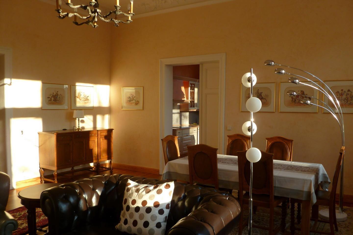 Treten Sie ein in die Belle Étage. Herrschaftliches Wohnen auf 148 qm! 4-Raum Wohnung im Obergeschoss bis 6 Personen, ruhig und zentral nähe Hauptbahnhof gelegen. 2 Schlafzimmer mit Doppelbett, 1 Schlafzimmer mit 2 Einzelbetten. Vorsaal mit Garderobe, großer, heller Wohnraum mit Esstisch, Couchgruppe und einer riesigen, nach Südwesten ausgerichteten Terrasse. Große moderne Küche, 3 Schlafräume (2 x Doppelbett, 1 x 2 Einzelbetten), großes Fensterbad mit Dusche, Wanne, Waschtisch, WC, separates Gäste-WC, TV, WiFi. Parkplätze und/oder Garagen können bei Bedarf gegen Gebühr mitgemietet werden. Zur gemeinschaftlichen Nutzung stehen den Gästen eine Fahrradgarage mit E-Bike-Ladestation, Waschmaschine und Trockenraum zur Verfügung. Auch der Garten lädt zum Verweilen ein.