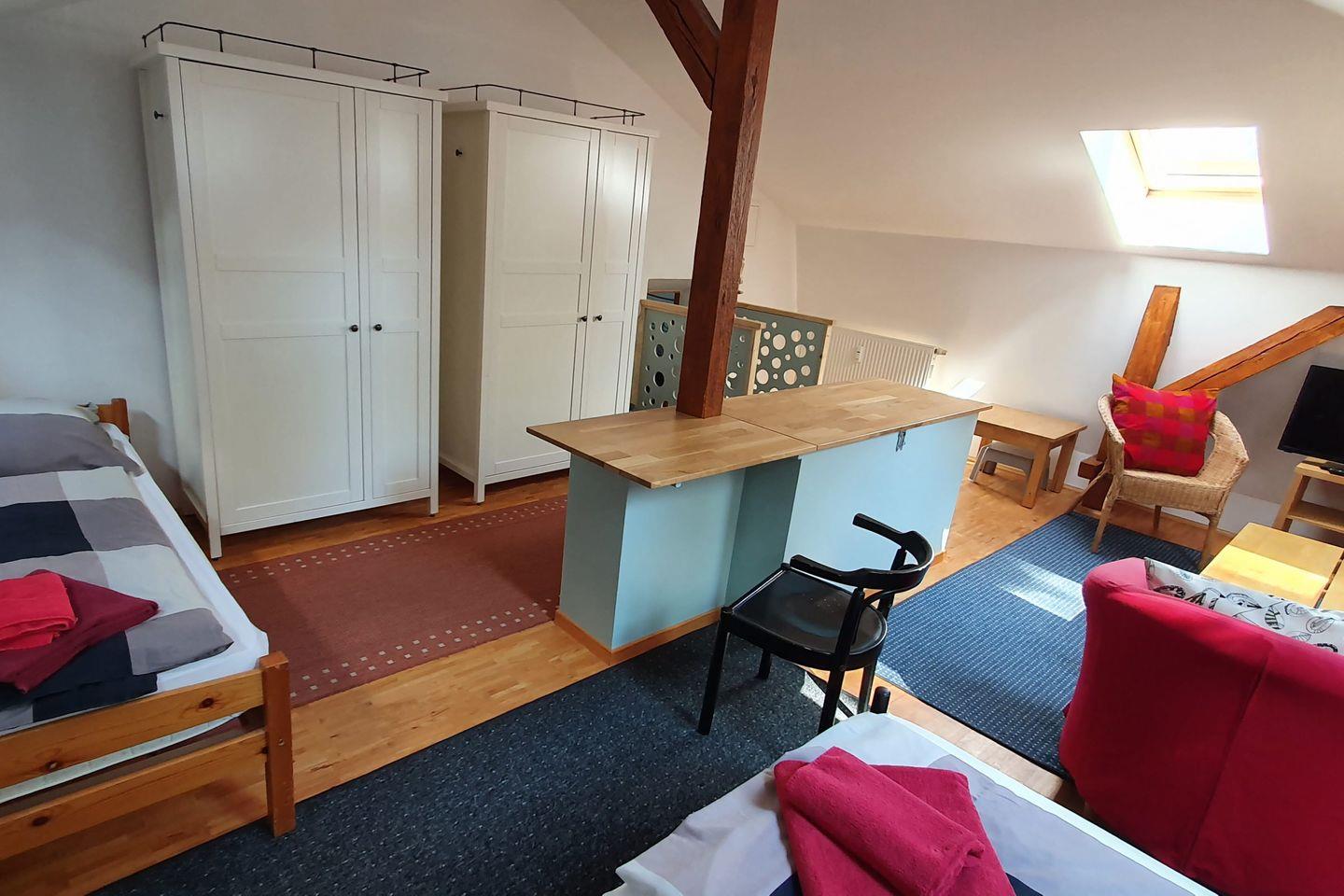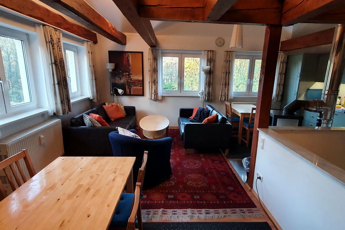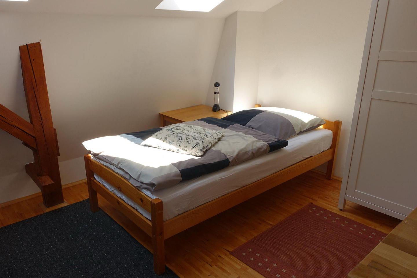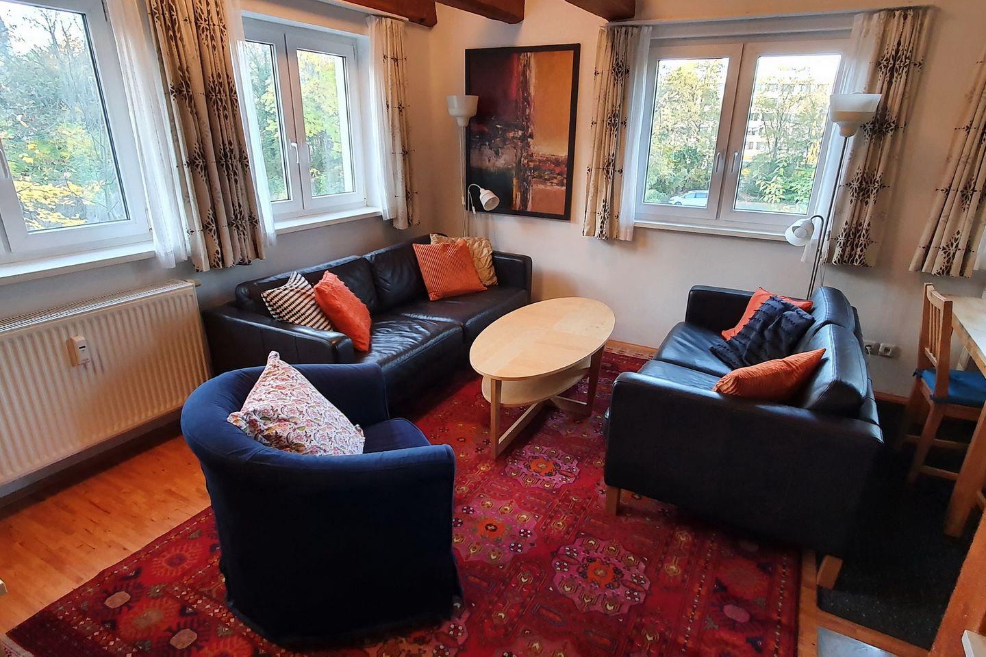 Große, ruhige Wohnung im Obergeschoss, 4-Raum Wohnung für 7 Personen, zentral im Unicampus gelegen. 2 Doppelbetten, 3 Einzelbetten. Flur mit Garderobe im EG. Im OG großzügiger offener Wohnraum mit großem Essbereich, Couchgruppe und Kaminofen. Offene Küche mit Küchentisch, Schlafzimmer mit 2 Einzelbetten und Schreibtisch, Schlafzimmer mit Doppelbett. Ein weiteres großes Schlafzimmer mit Doppelbett, Einzelbett, Couchgruppe, TV und Schreibtisch wird über eine kleine Treppe erreicht. Duschbad mit Tageslicht, Waschtisch, WC. TV, WiFi. Parkplätze können bei Bedarf gegen Gebühr mitgemietet werden. Zur gemeinschaftlichen Nutzung stehen den Gästen eine gemütliche Terrasse mit Gartenmöbeln, Fahrradunterstellplatz und eine Waschmaschine zur Verfügung.