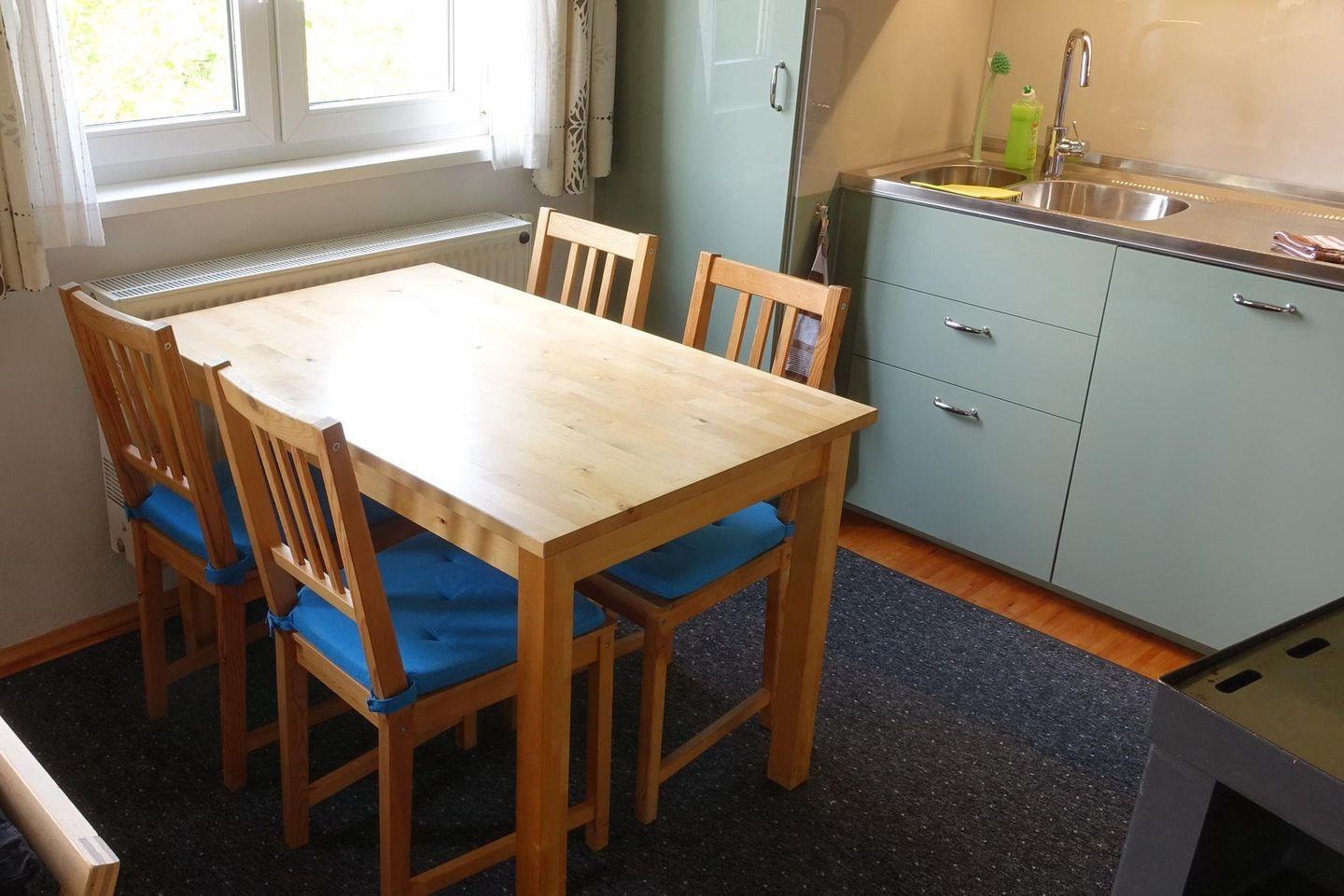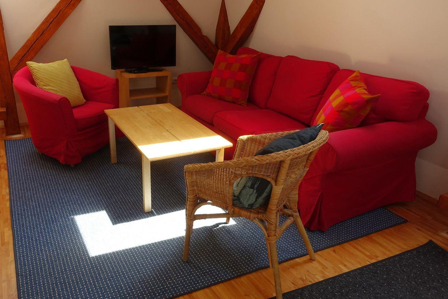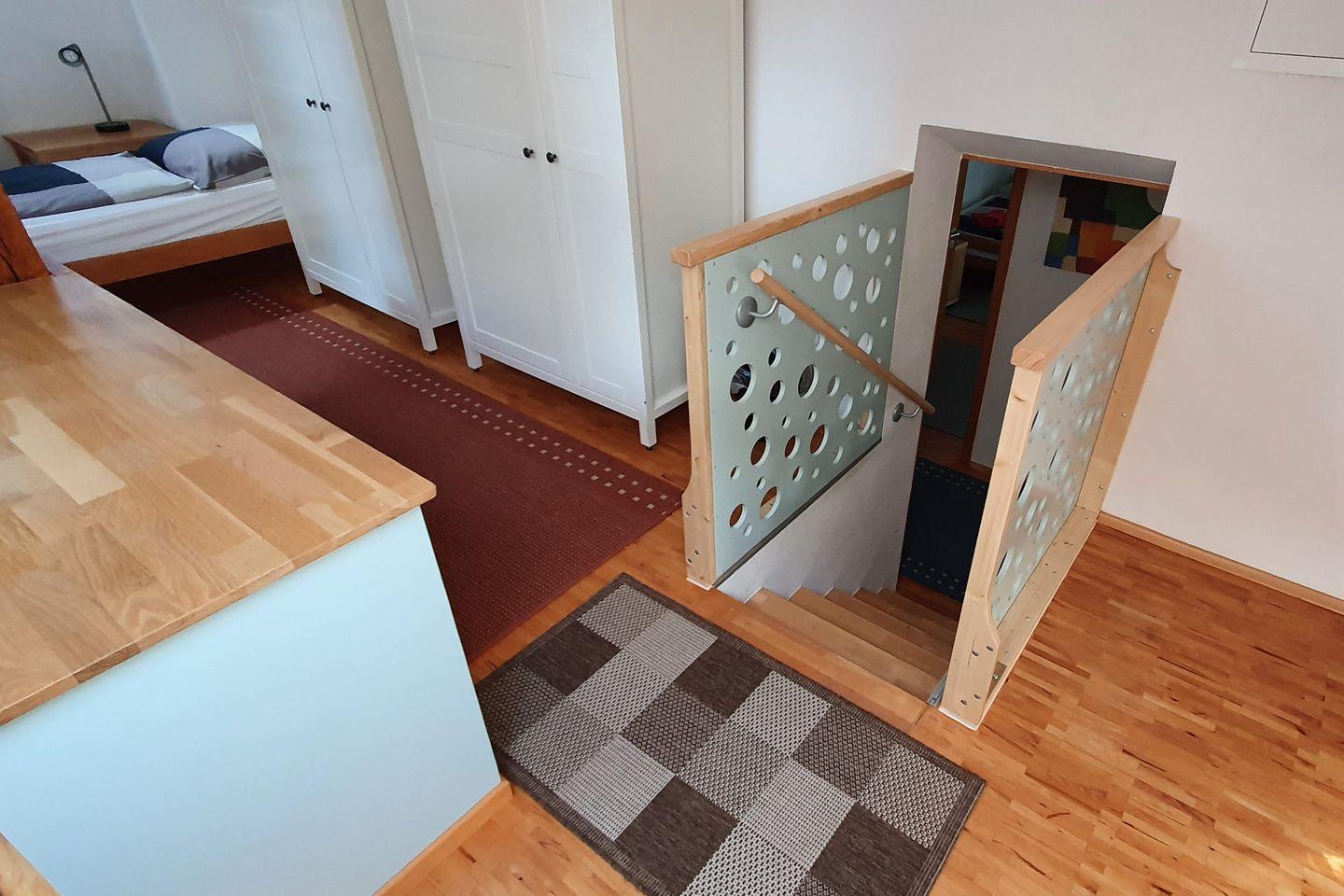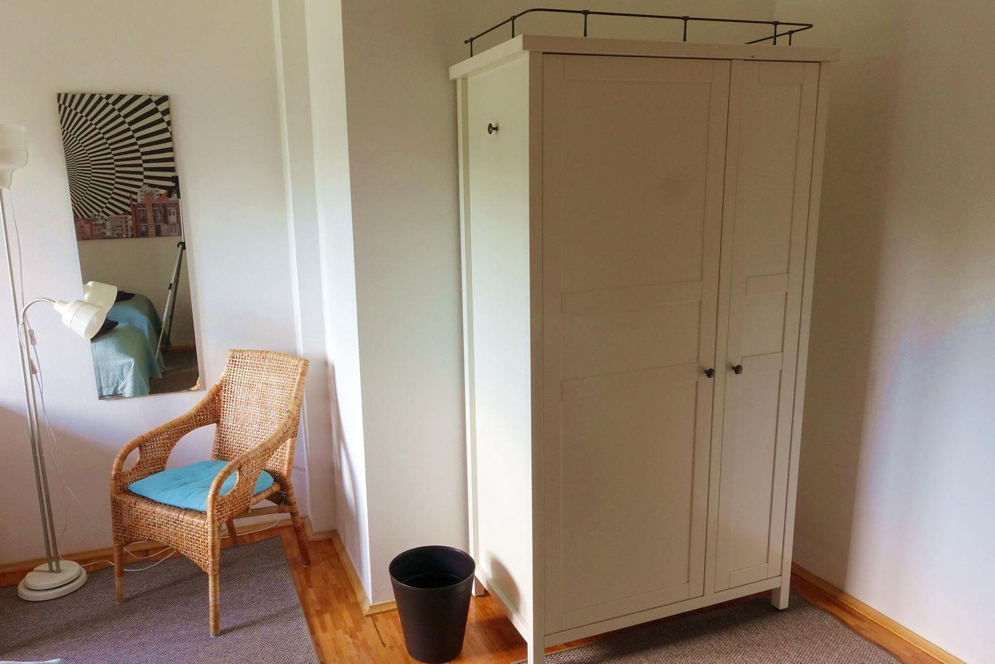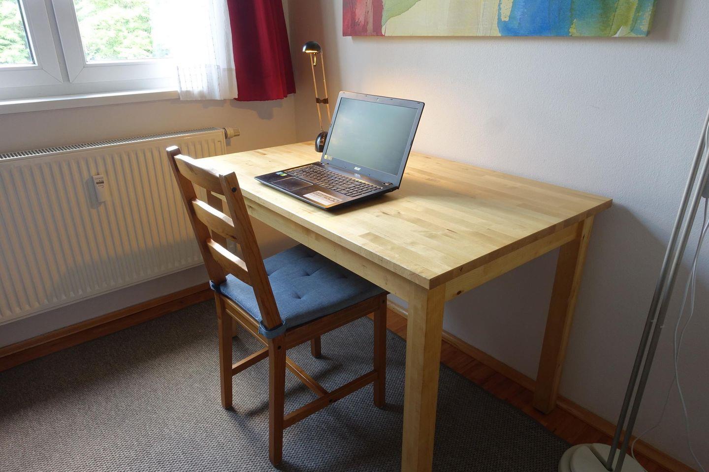 Große, ruhige Wohnung im Obergeschoss, 4-Raum Wohnung für 7 Personen, zentral im Unicampus gelegen. 2 Doppelbetten, 3 Einzelbetten. Flur mit Garderobe im EG. Im OG großzügiger offener Wohnraum mit großem Essbereich, Couchgruppe und Kaminofen. Offene Küche mit Küchentisch, Schlafzimmer mit 2 Einzelbetten und Schreibtisch, Schlafzimmer mit Doppelbett. Ein weiteres großes Schlafzimmer mit Doppelbett, Einzelbett, Couchgruppe, TV und Schreibtisch wird über eine kleine Treppe erreicht. Duschbad mit Tageslicht, Waschtisch, WC. TV, WiFi. Parkplätze können bei Bedarf gegen Gebühr mitgemietet werden. Zur gemeinschaftlichen Nutzung stehen den Gästen eine gemütliche Terrasse mit Gartenmöbeln, Fahrradunterstellplatz und eine Waschmaschine zur Verfügung.