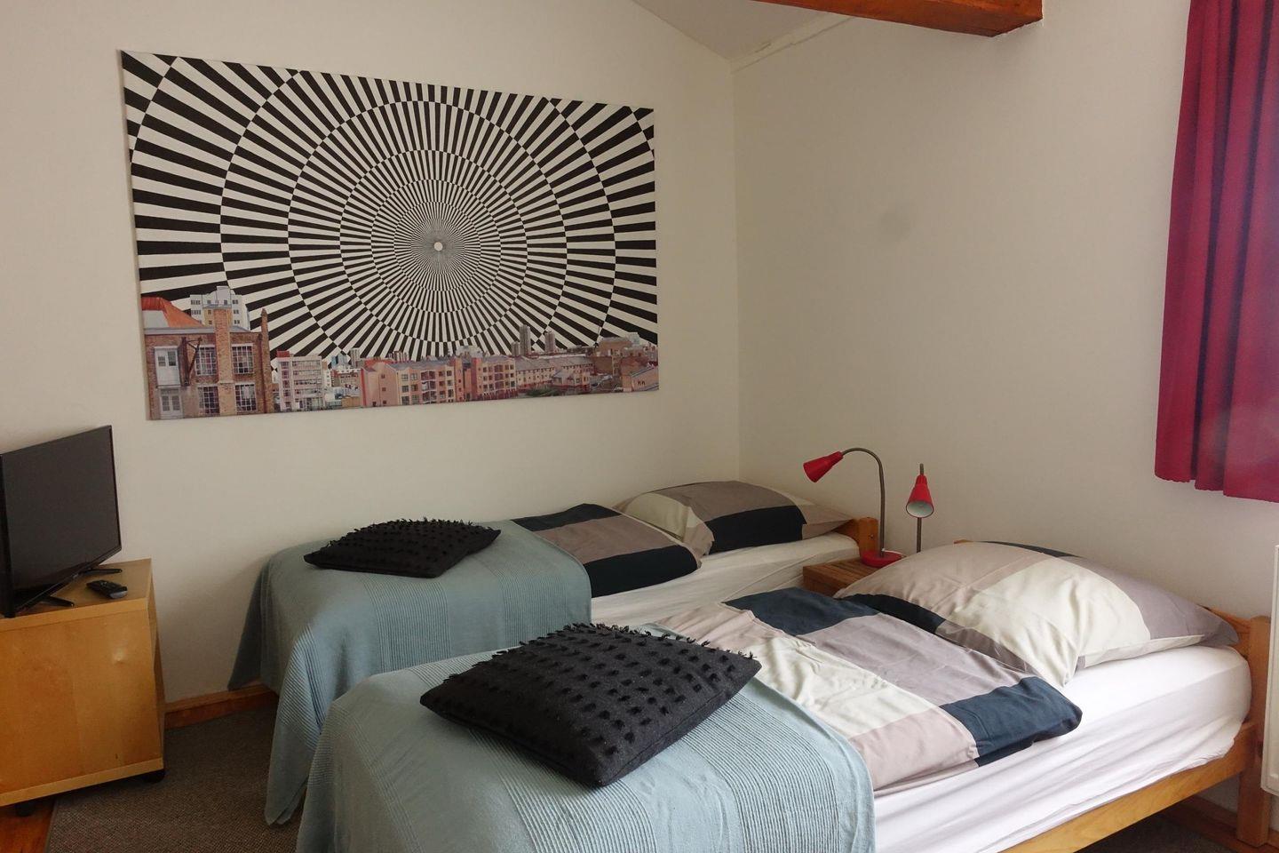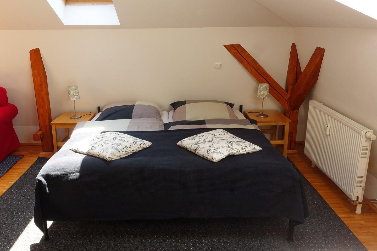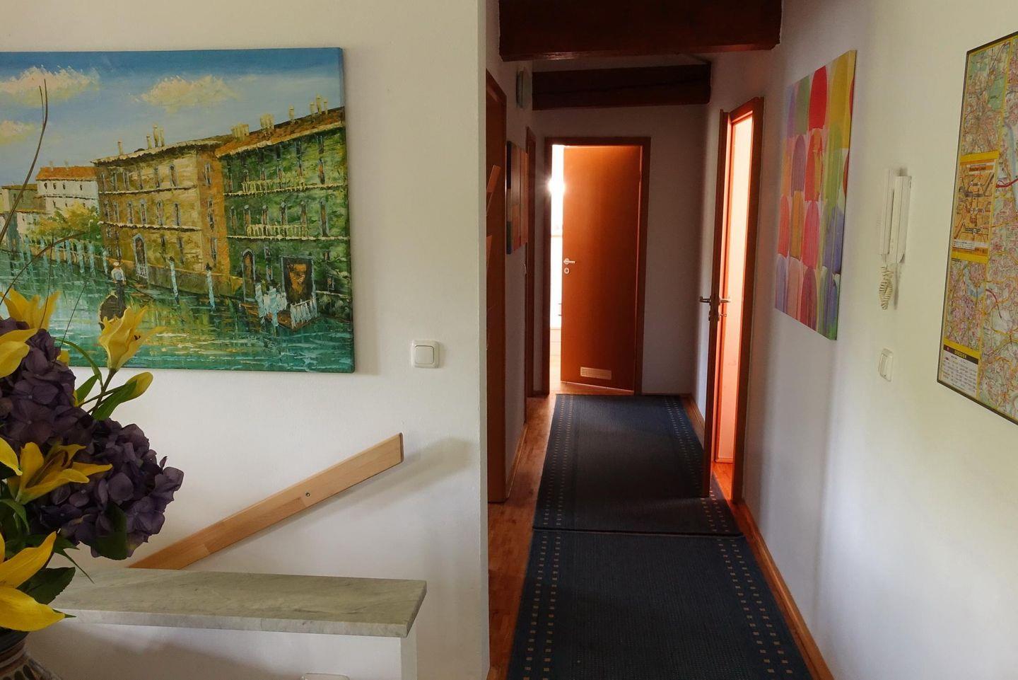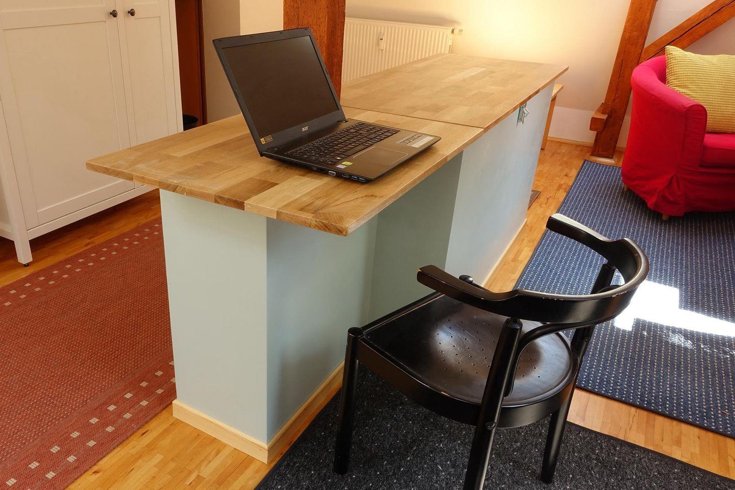Große, ruhige Wohnung im Obergeschoss, 4-Raum Wohnung für 7 Personen, zentral im Unicampus gelegen. 2 Doppelbetten, 3 Einzelbetten. Flur mit Garderobe im EG. Im OG großzügiger offener Wohnraum mit großem Essbereich, Couchgruppe und Kaminofen. Offene Küche mit Küchentisch, Schlafzimmer mit 2 Einzelbetten und Schreibtisch, Schlafzimmer mit Doppelbett. Ein weiteres großes Schlafzimmer mit Doppelbett, Einzelbett, Couchgruppe, TV und Schreibtisch wird über eine kleine Treppe erreicht. Duschbad mit Tageslicht, Waschtisch, WC. TV, WiFi. Parkplätze können bei Bedarf gegen Gebühr mitgemietet werden. Zur gemeinschaftlichen Nutzung stehen den Gästen eine gemütliche Terrasse mit Gartenmöbeln, Fahrradunterstellplatz und eine Waschmaschine zur Verfügung.