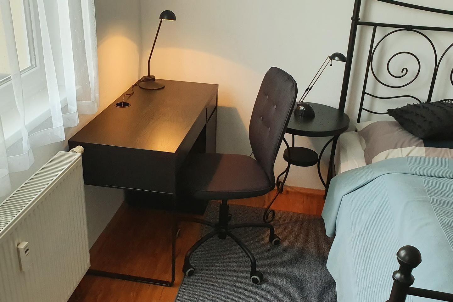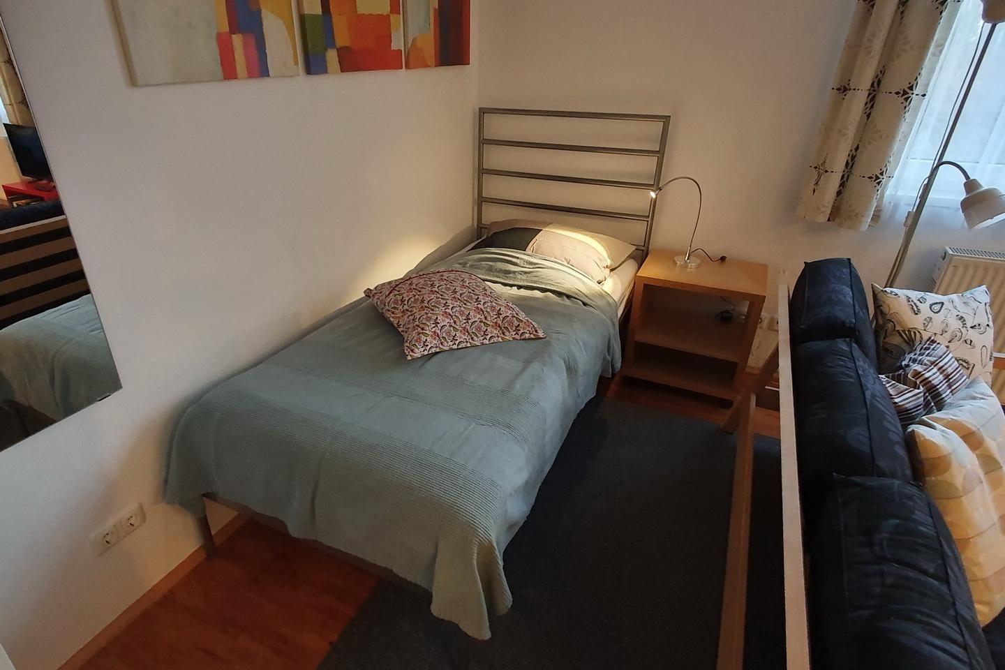 Das ruhige und geräumige Apartment liegt im Erdgeschoss. 1-Raum Apartment für 3 Personen, zentral im Unicampus gelegen. 1 Doppelbett, 1 Einzelbett. Offener Wohnraum mit Doppelbett und Einzelbett, Couchgruppe, Schreibtisch, Schrank, Sessel, Esstisch und Kompaktküche mit Herd, Kühlschrank, Kaffeemaschine, Mikrowelle usw… Duschbad mit Fenster, Waschtisch, Wanne, WC, TV, WiFi. Parkplätze können bei Bedarf gegen Gebühr mitgemietet werden. Zur gemeinschaftlichen Nutzung stehen den Gästen eine gemütliche Terrasse mit Gartenmöbeln, Fahrradunterstellplatz und eine Waschmaschine zur Verfügung.