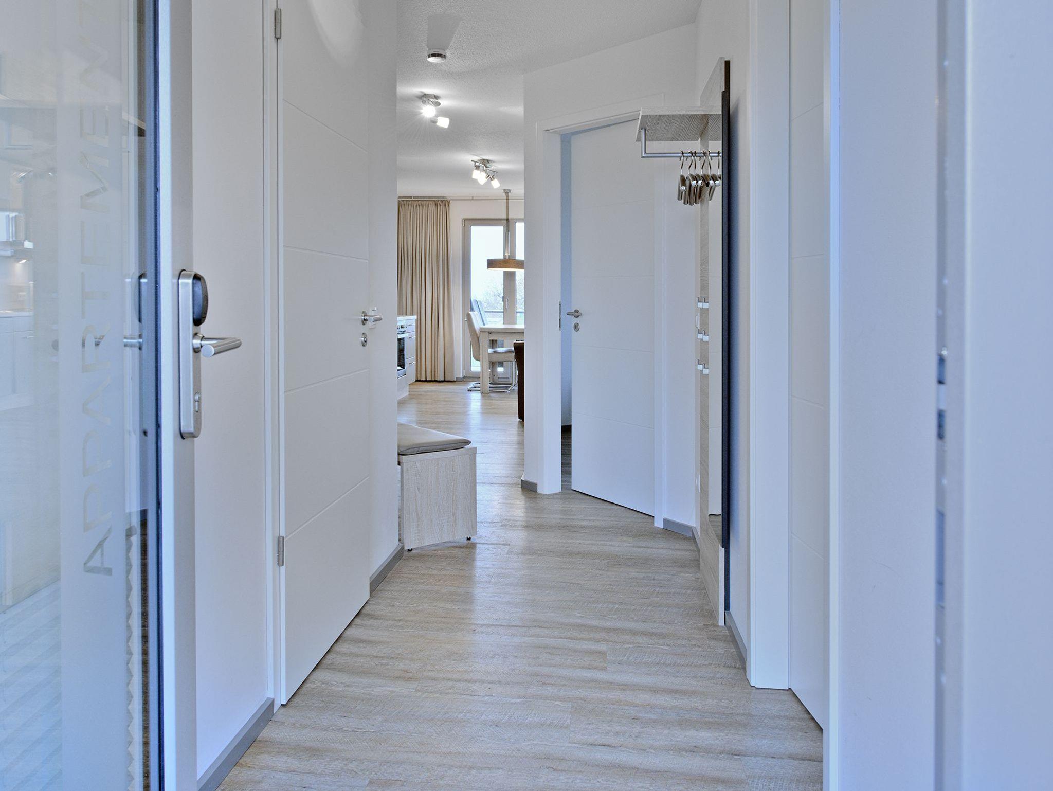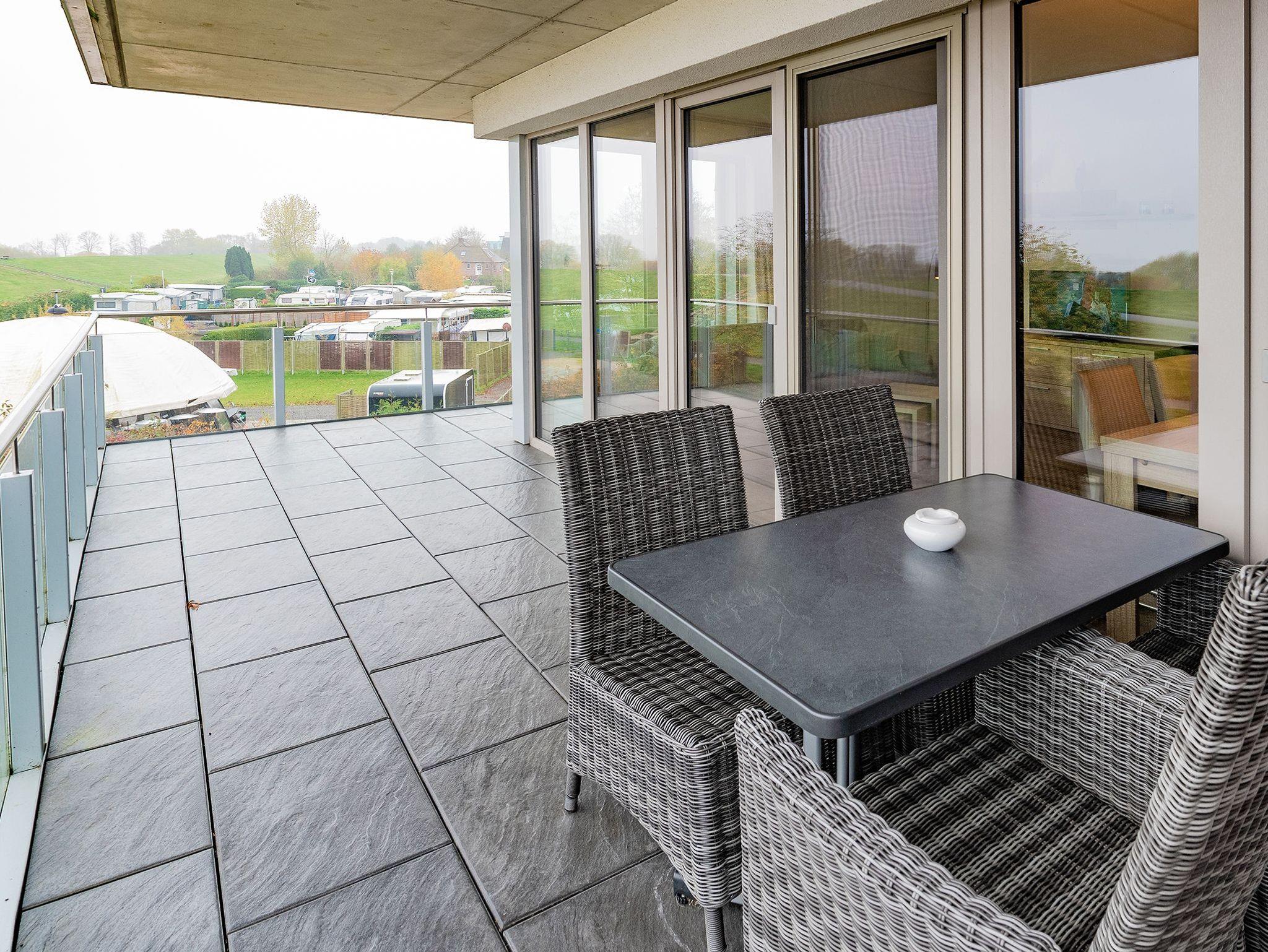 Die Appartements der Kategorie D3 R3 im Haus Lee verfügen über zwei separate Schlafzimmer, Wohn-, Koch- und Essbereich sowie einem Balkon mit direktem Blick auf die Elbe.