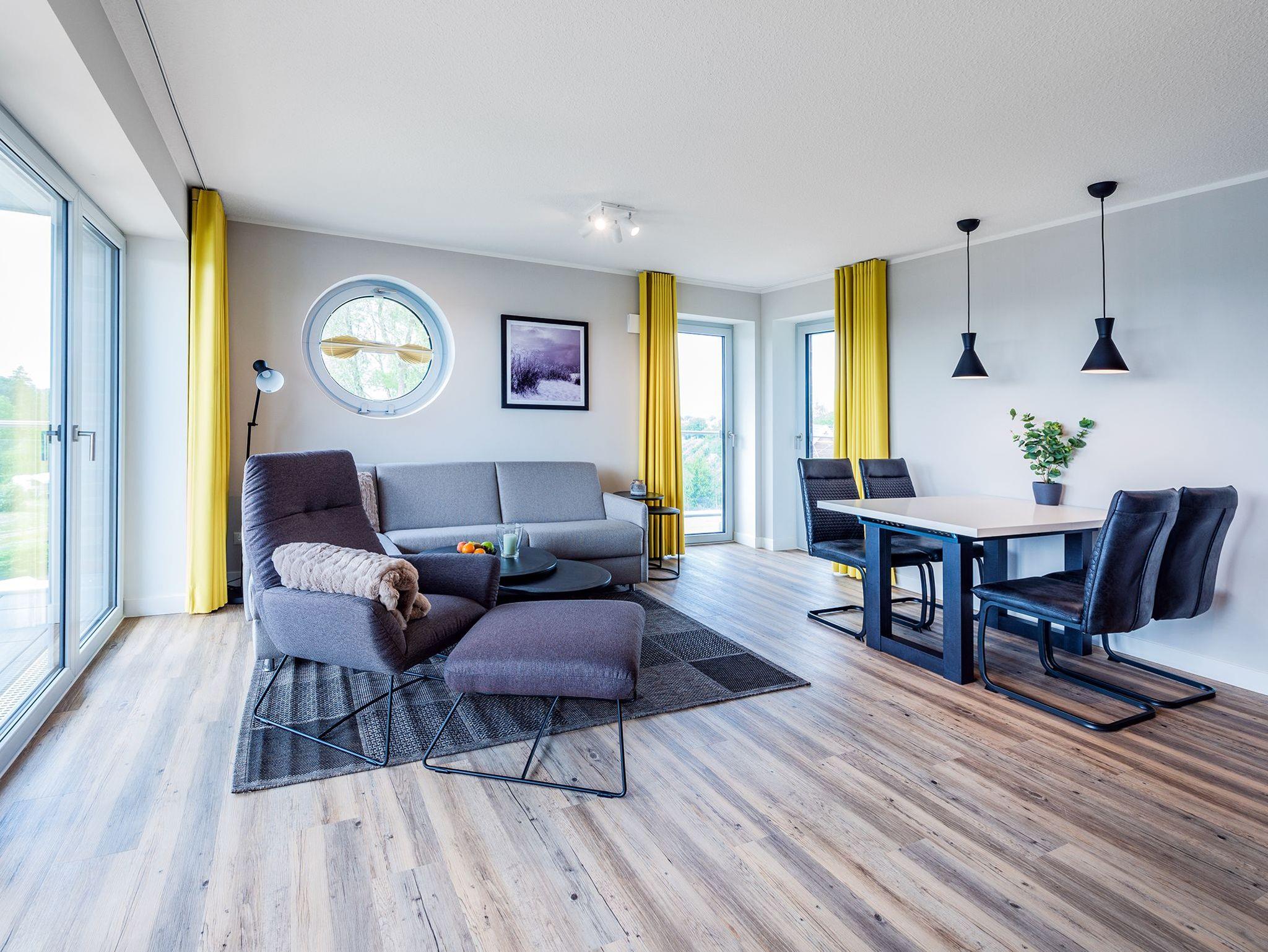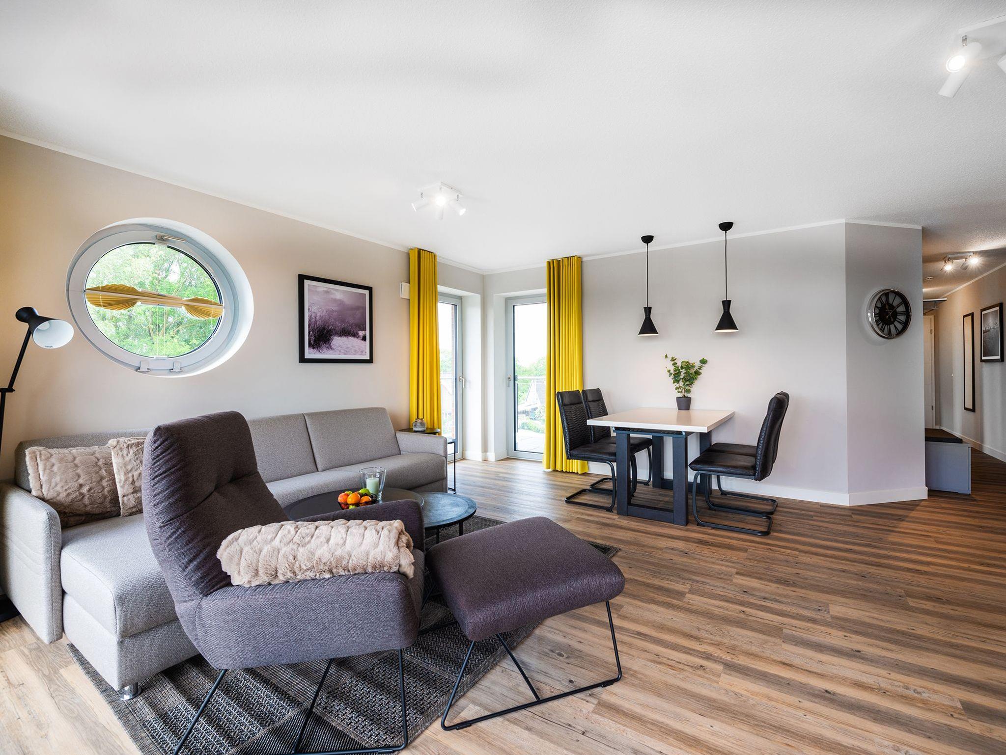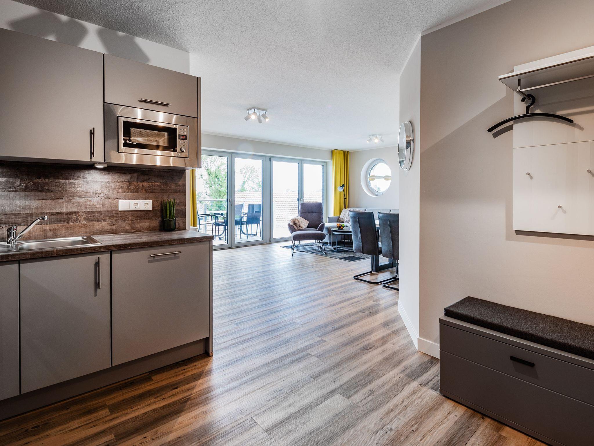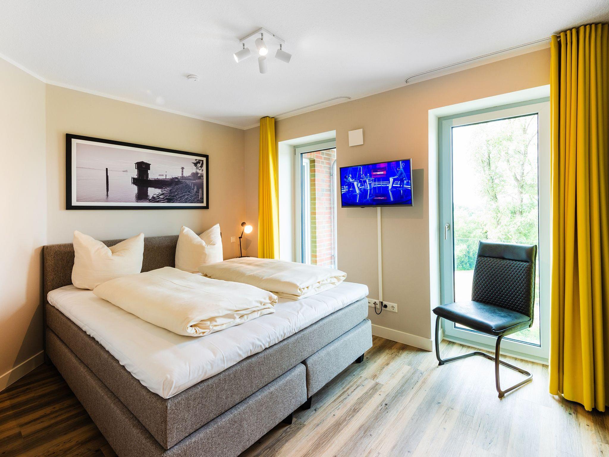 DIe Appartements der Kategorie D5 R3 in unserem Ferienhaus Elbbrise bieten Ihnen eine komfortable Ferienwohnung mit zwei separaten Schlafzimmern, einem offenen Wohn-, Koch- und Essbereich und einem Balkon mit Blick auf die Elbe.