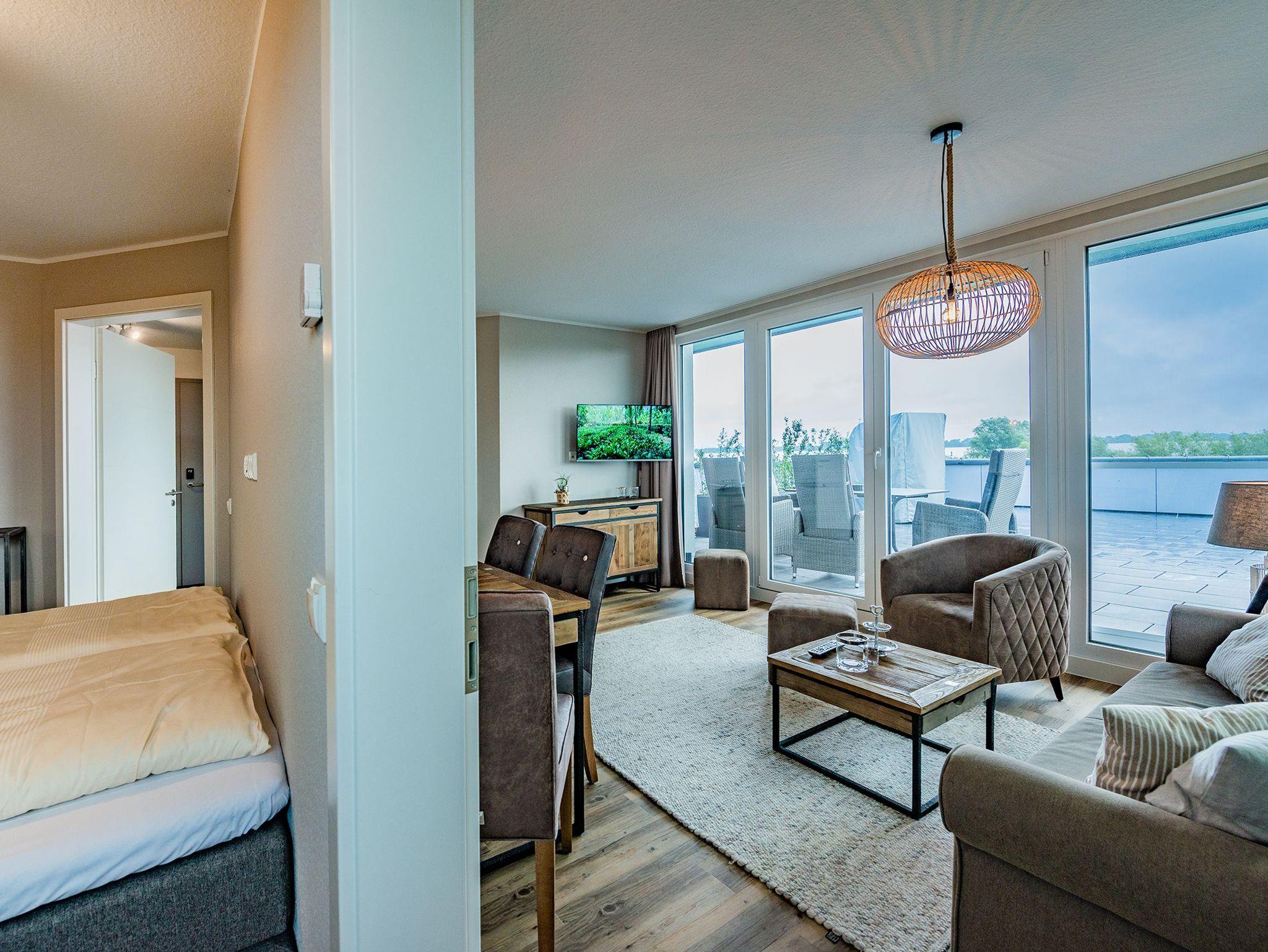 Die Wohnungen der Kategorie D4 R2 im Haus Elbaussicht verfügen über ein separates Schlafzimmer, einen Wohn-, Koch- und Essbereich und einem Balkon mit Elbblick.