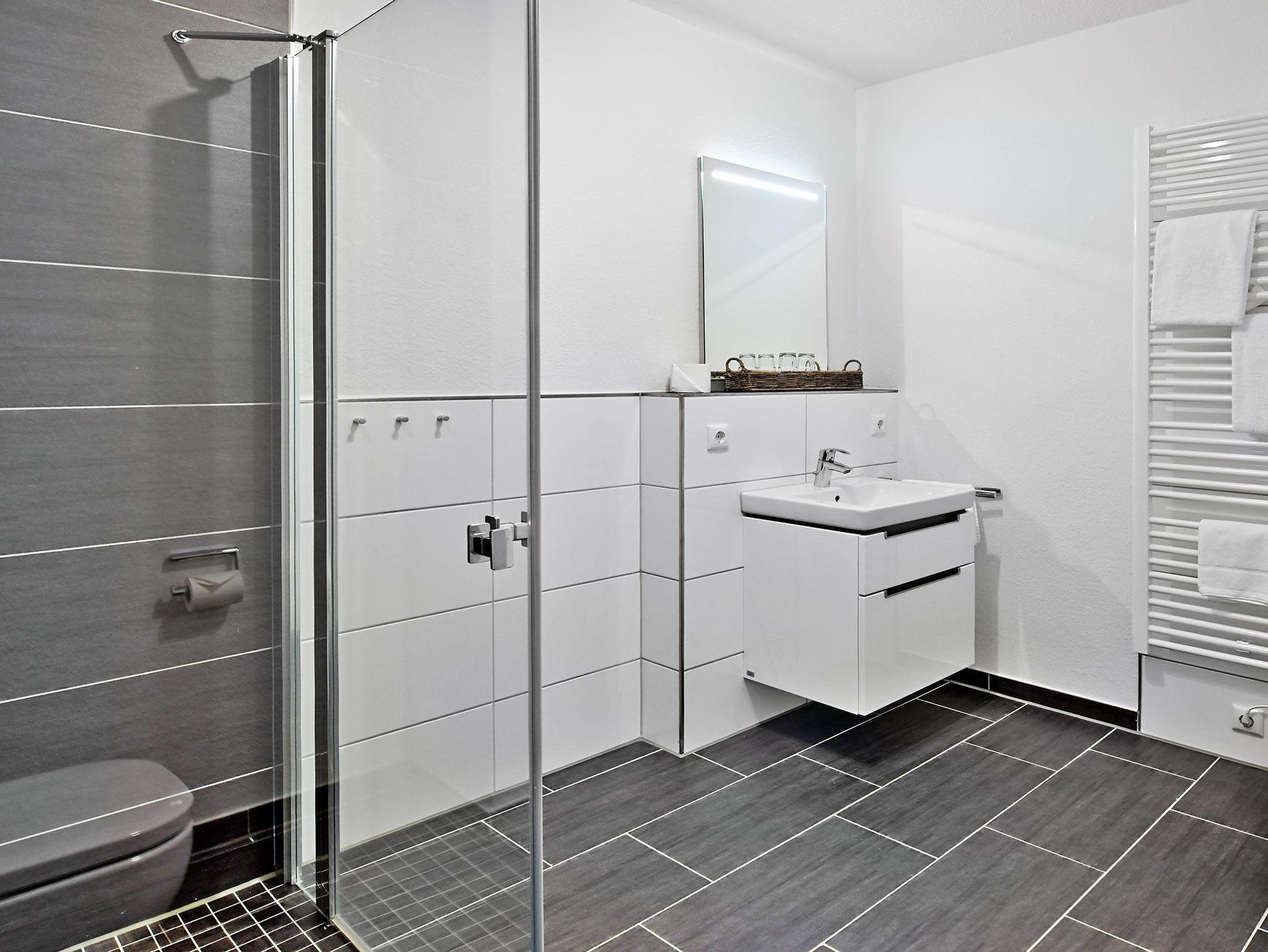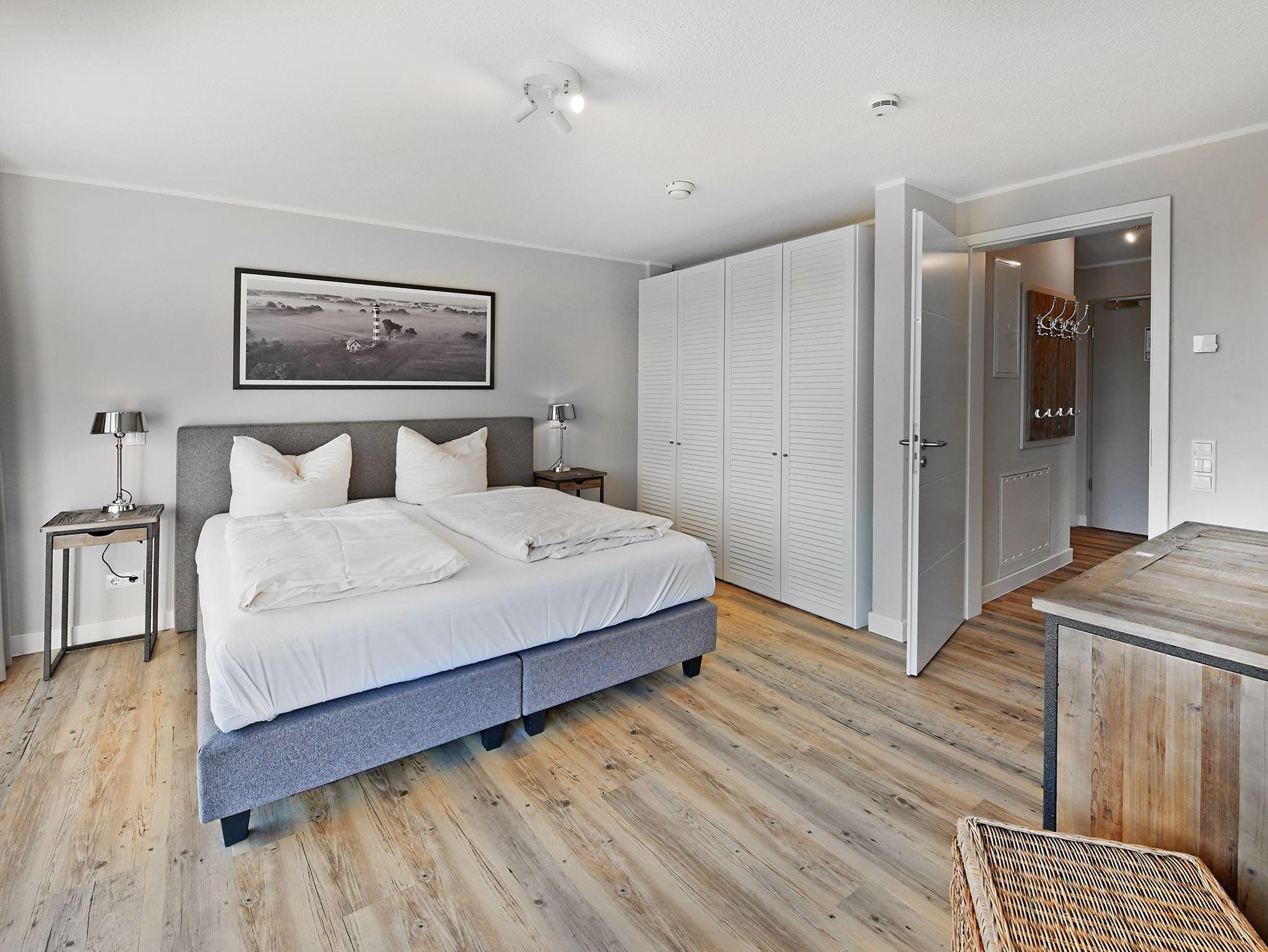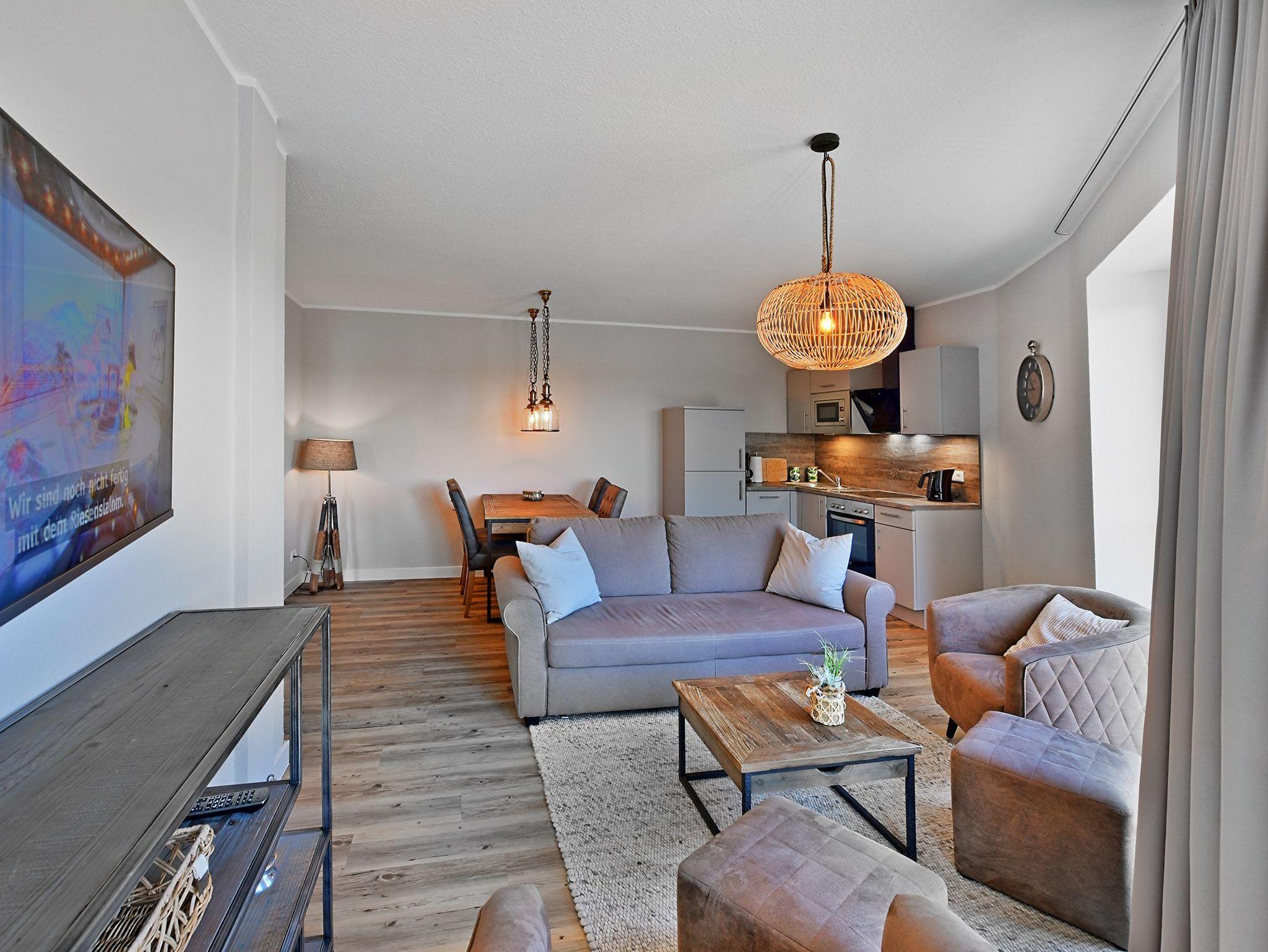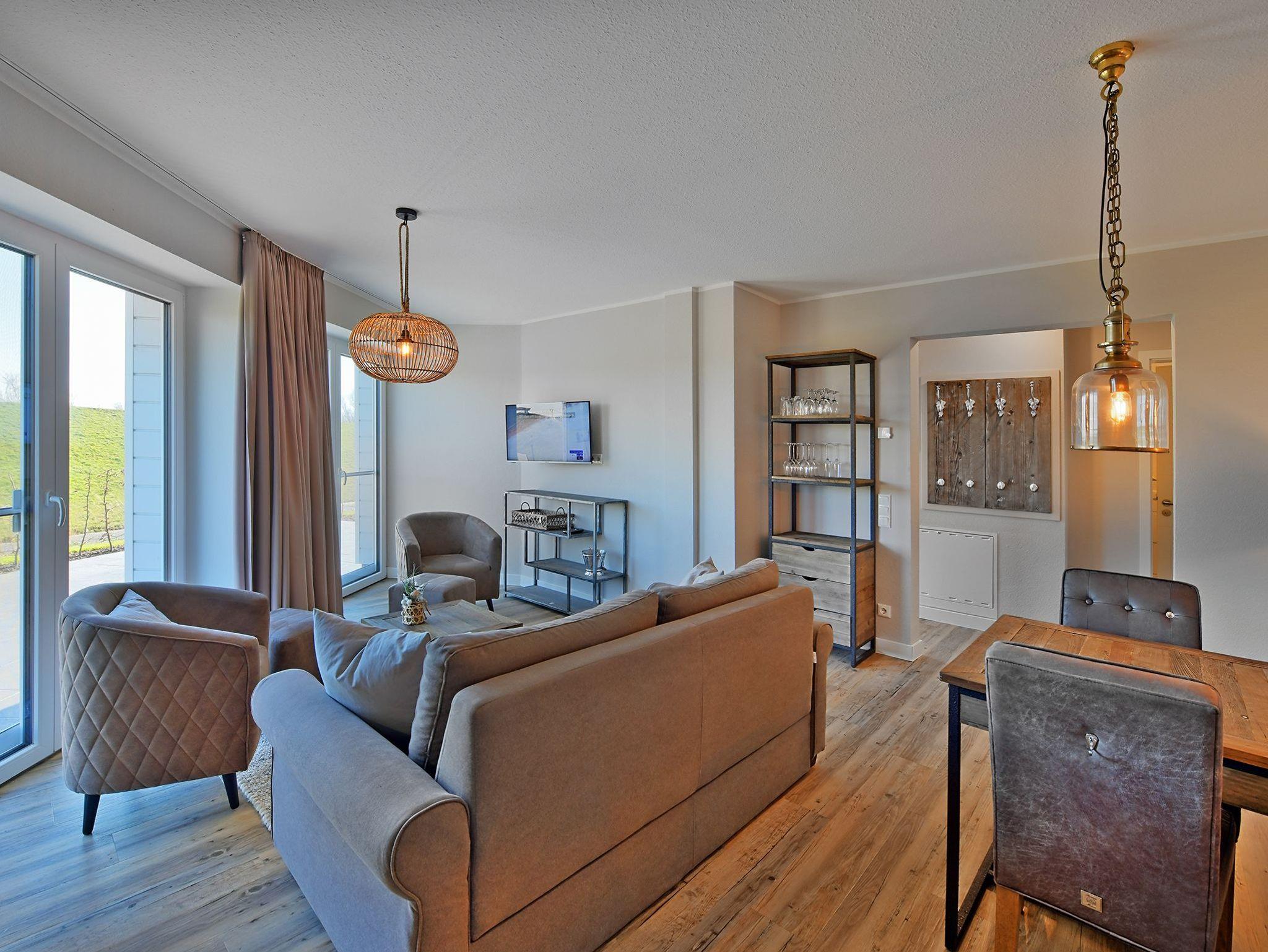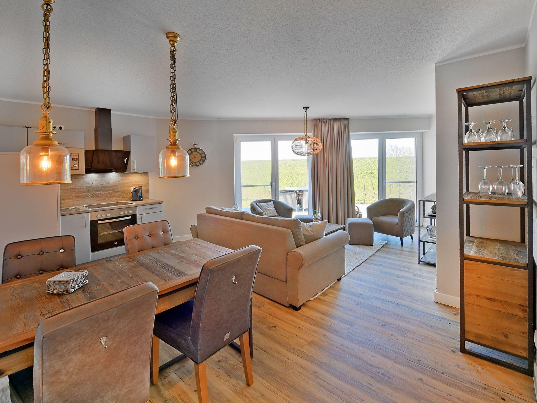 Die Wohnung D2 R3 im Haus Elbaussicht verfügt über zwei separate Schlafzimmer, einen Wohn-, Koch- und Essbereich und einer sonnigen Südterrasse.