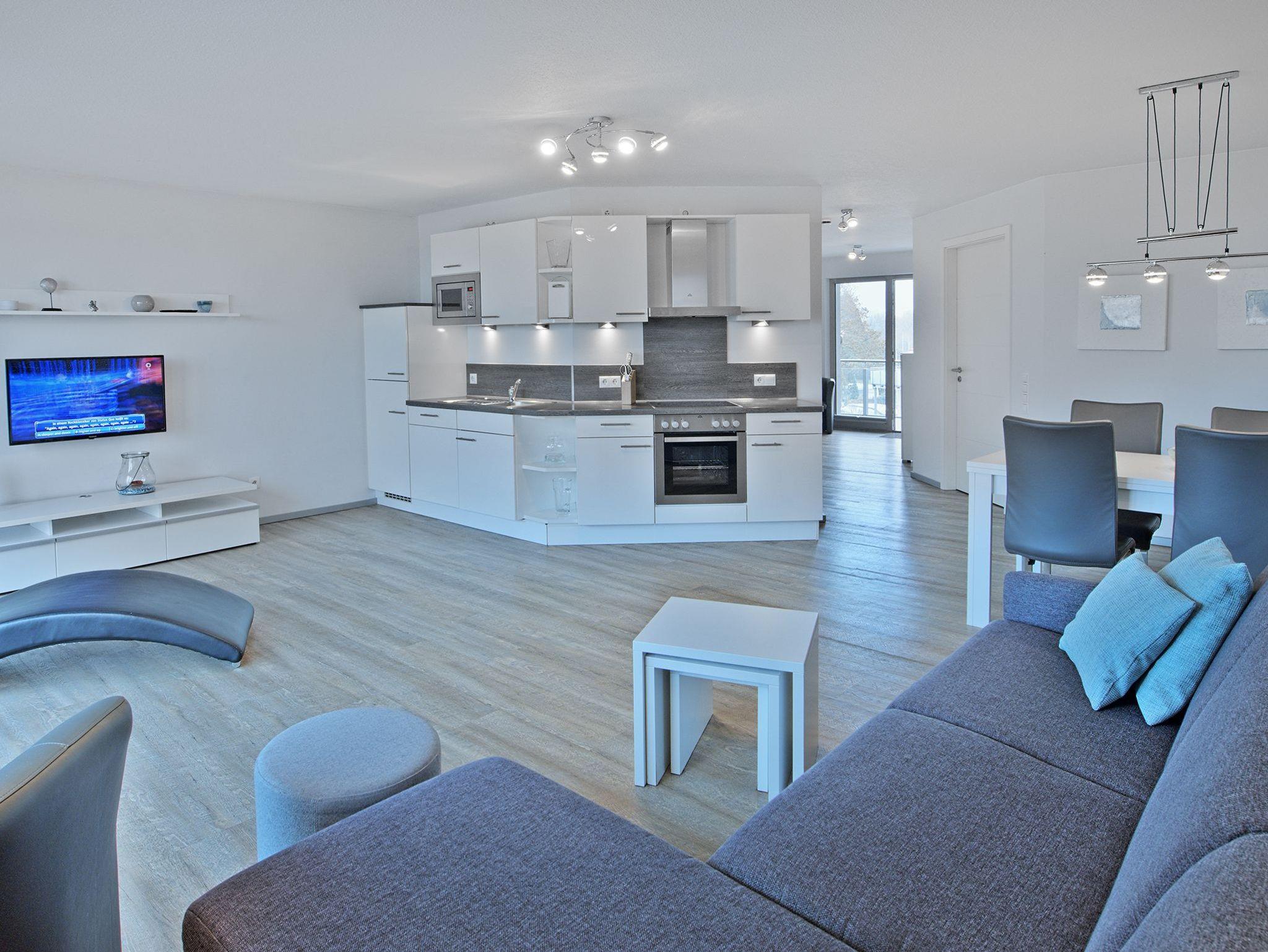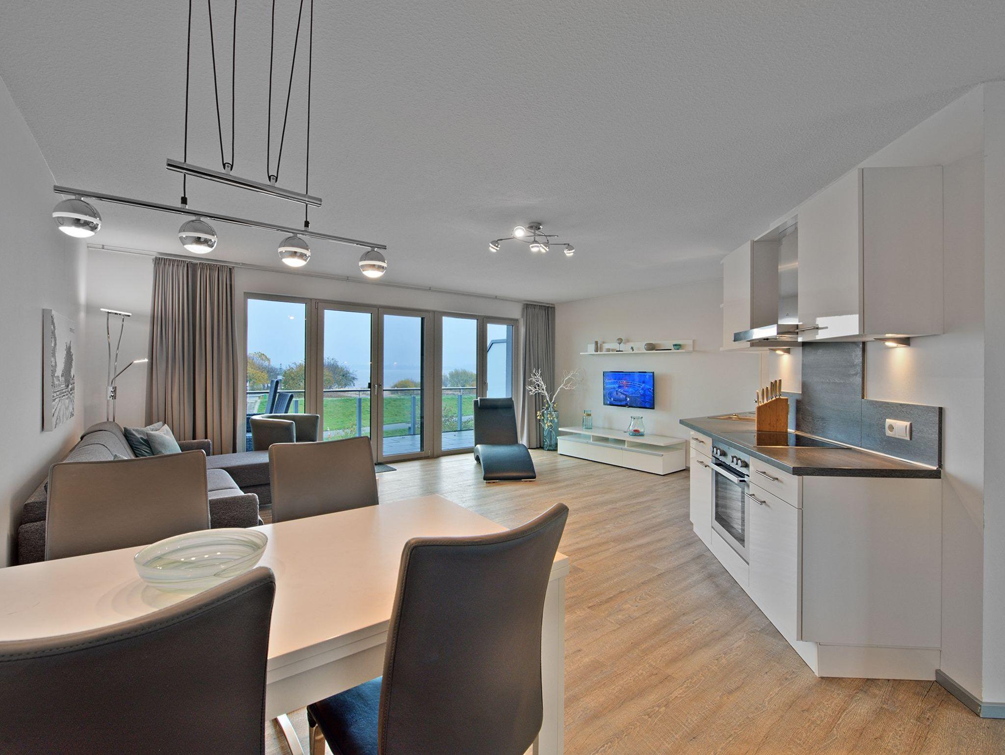 Die Appartements der Kategorie D4 R2 im Haus Lee verfügen über ein Schlafzimmer, Wohn-, Koch- und Essbereich und einem Balkon mit direktem Blick auf die Elbe.