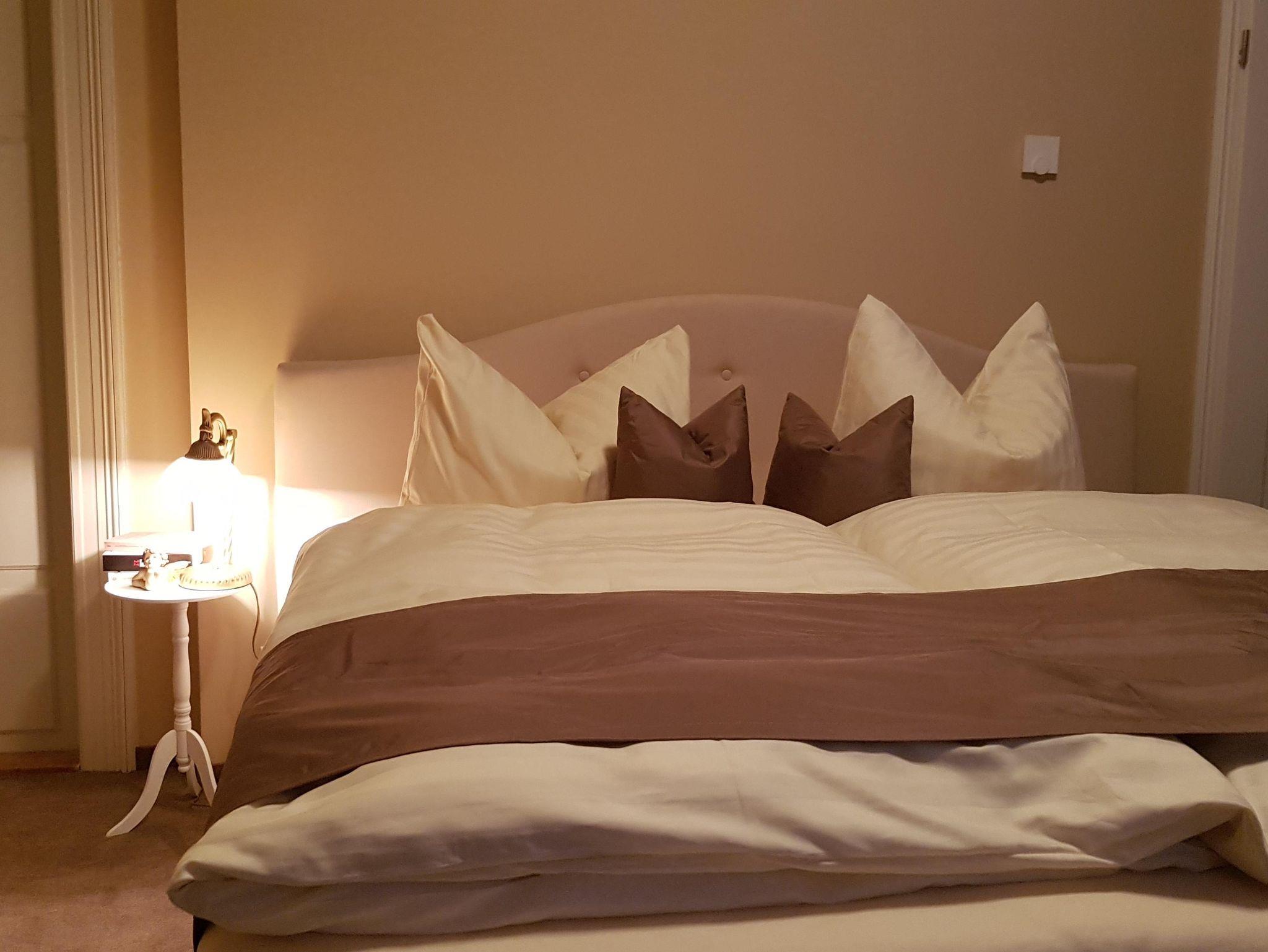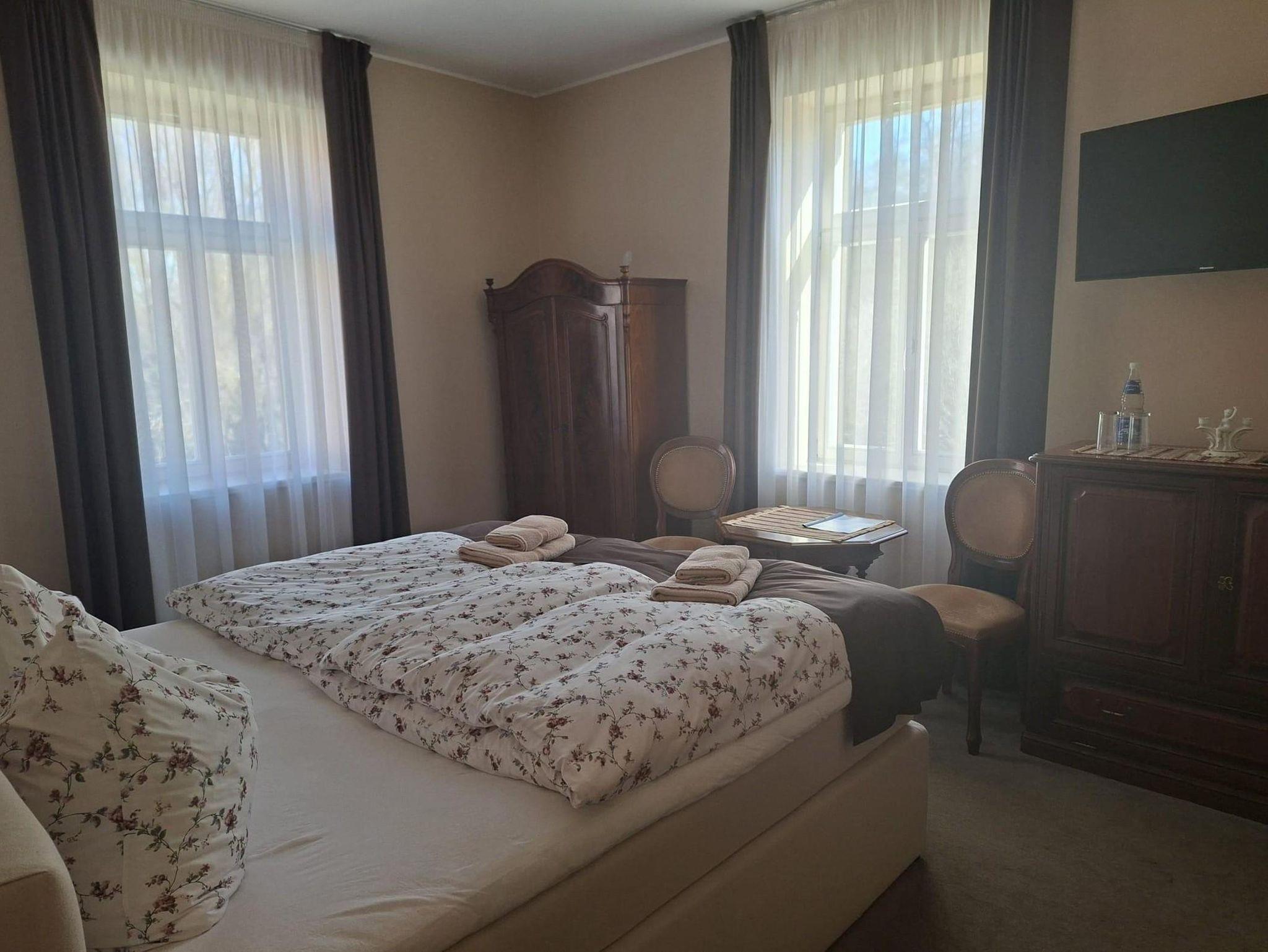 Die Doppelzimmer sind modern ausgestattet und zugleich vom historischen Flair der Villa geprägt. Auf ca. 10 m² bieten sie Platz für bis zu zwei Personen und verfügen über ein komfortables Boxspringbett (180 cm), eigenes Bad, TV sowie kostenfreies WLAN. Trotz zeitgemäßer Ausstattung bleibt der Charakter des Jugendstilhauses spürbar. Gästen stehen alle Aufenthaltsräume sowie der Garten zur Verfügung, auf Anfrage kann auch das Heimkino genutzt werden. Die ruhige Lage und die unmittelbare Nähe zum angrenzenden Waldgebiet machen diese Zimmer ideal für Erholungssuchende.