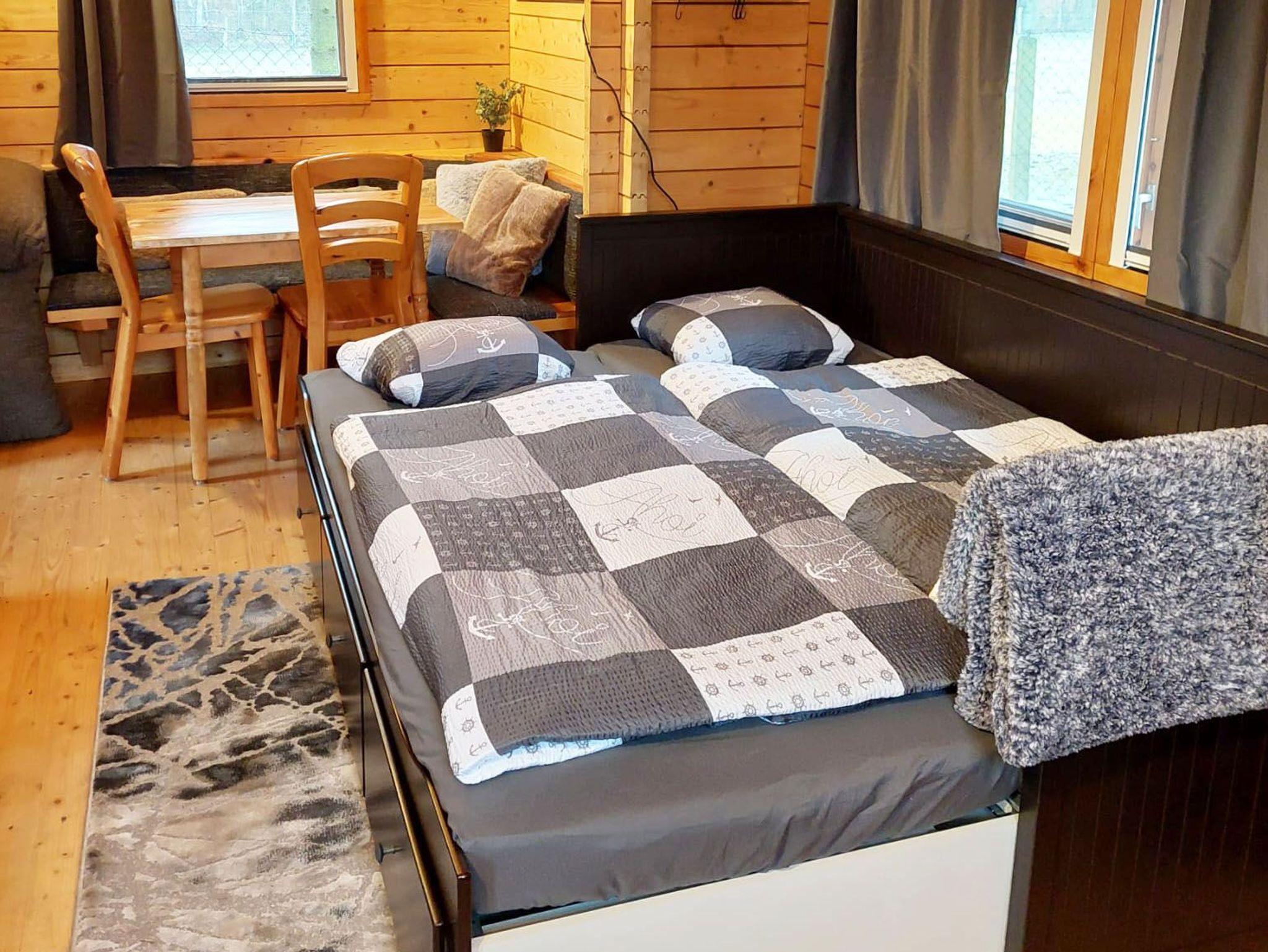 Der durchdachte Grundriss bietet ein separates Schlafzimmer mit komfortablem Doppelbett, einen hellen Wohnbereich mit Schlafcouch sowie eine praktische Küchennische. Die Terrasse erweitert den Wohnraum nach außen und lädt zum Entspannen in der Natur ein.