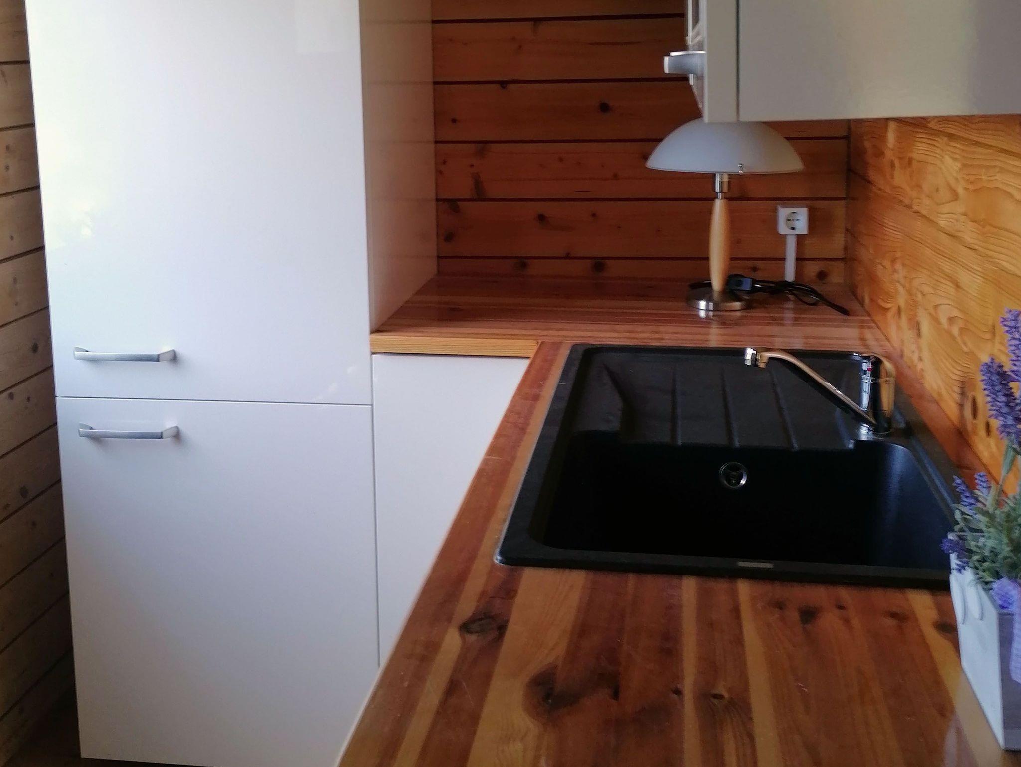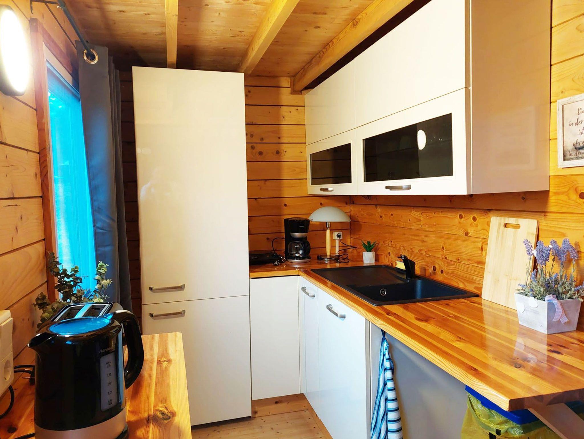 Dieser gemütliche Holzbungalow (25m²) bietet durchdachten Wohnkomfort mit einer separaten, vollausgestatteten Küche, einem modernen Bad mit Dusche/WC sowie einer privaten 14 m² Terrasse für entspannte Stunden im Freien.