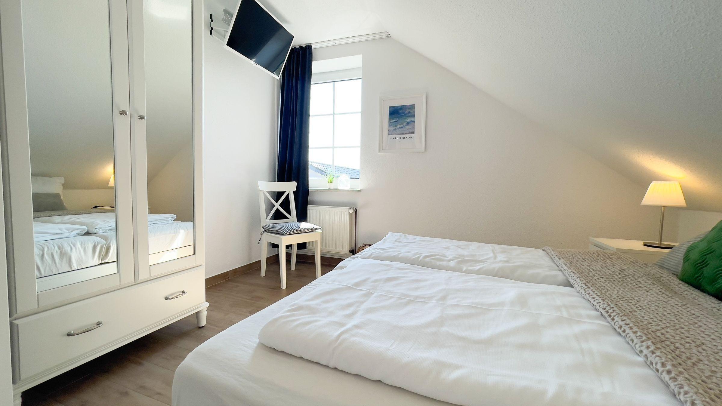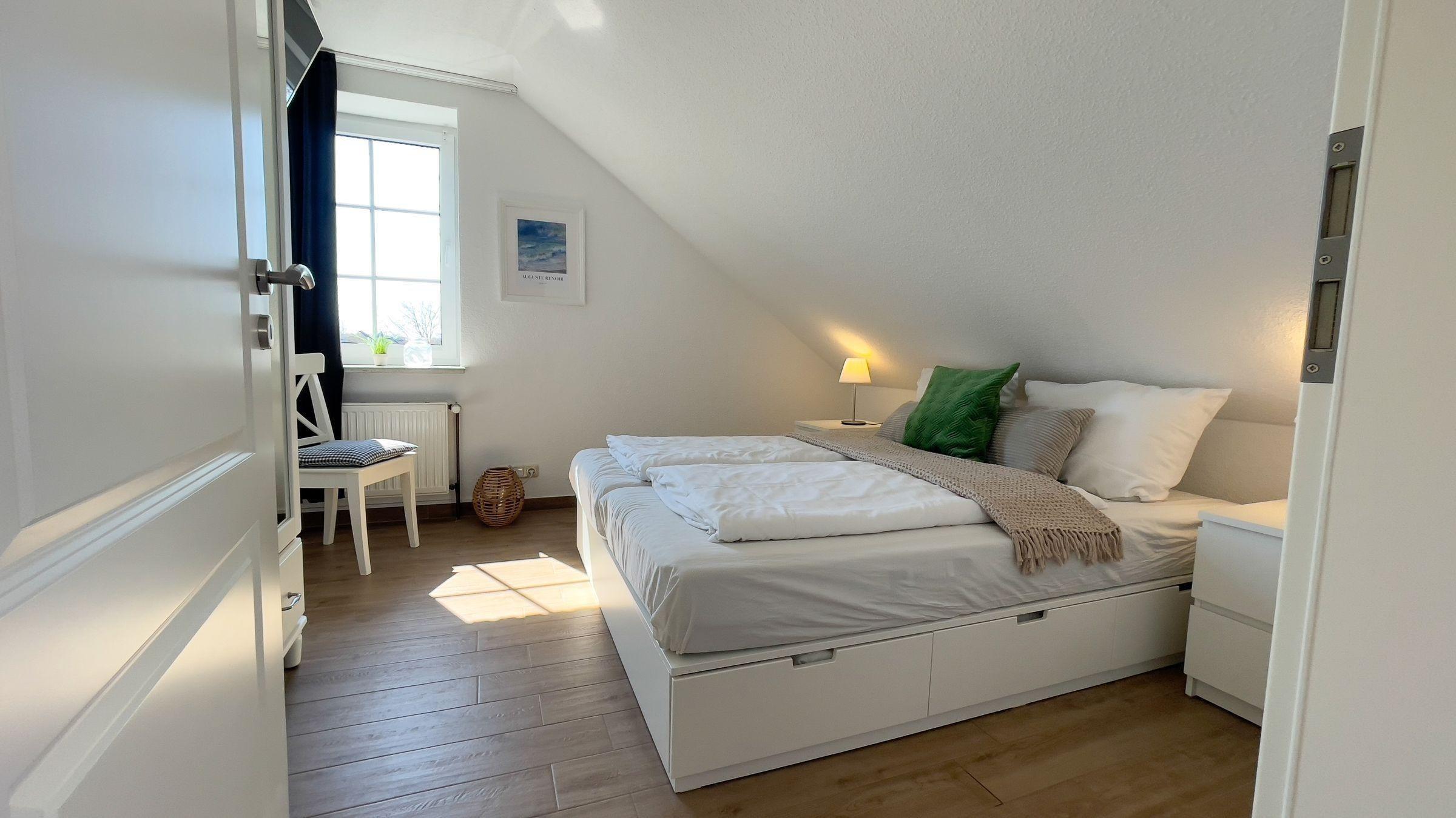 Das „Haus Kirsten FeWo 6“ präsentiert eine komfortable Ferienwohnung mit einer Fläche von 40 m², ideal für bis zu vier Personen. Im ersten Stock gelegen, bietet die Unterkunft einen einladenden Wohnbereich mit einem komfortablen Schlafsofa und Esstisch. Ein separates Schlafzimmer mit einem gemütlichen Doppelbett sorgt für erholsamen Schlaf. Die vollausgestattete, offene Küche enthält einen 4-Platten-Herd, Kühlschrank mit Gefrierfach, Backofen, Mikrowelle und Spülmaschine, um kulinarische Wünsche zu erfüllen. Die kinderfreundliche Ausstattung ist ein Plus für Familien. Gemeinschaftlich nutzbare Einrichtungen wie ein Wäschetrockner und eine Waschmaschine sind im Nachbarhaus verfügbar. Der ruhige Gemeinschaftsgarten mit Sandkasten und Schaukeln lädt zum Spielen ein. Die Lage ermöglicht erholsame Aktivitäten in der Natur und am nahegelegenen Sandstrand, nur wenige Minuten entfernt.