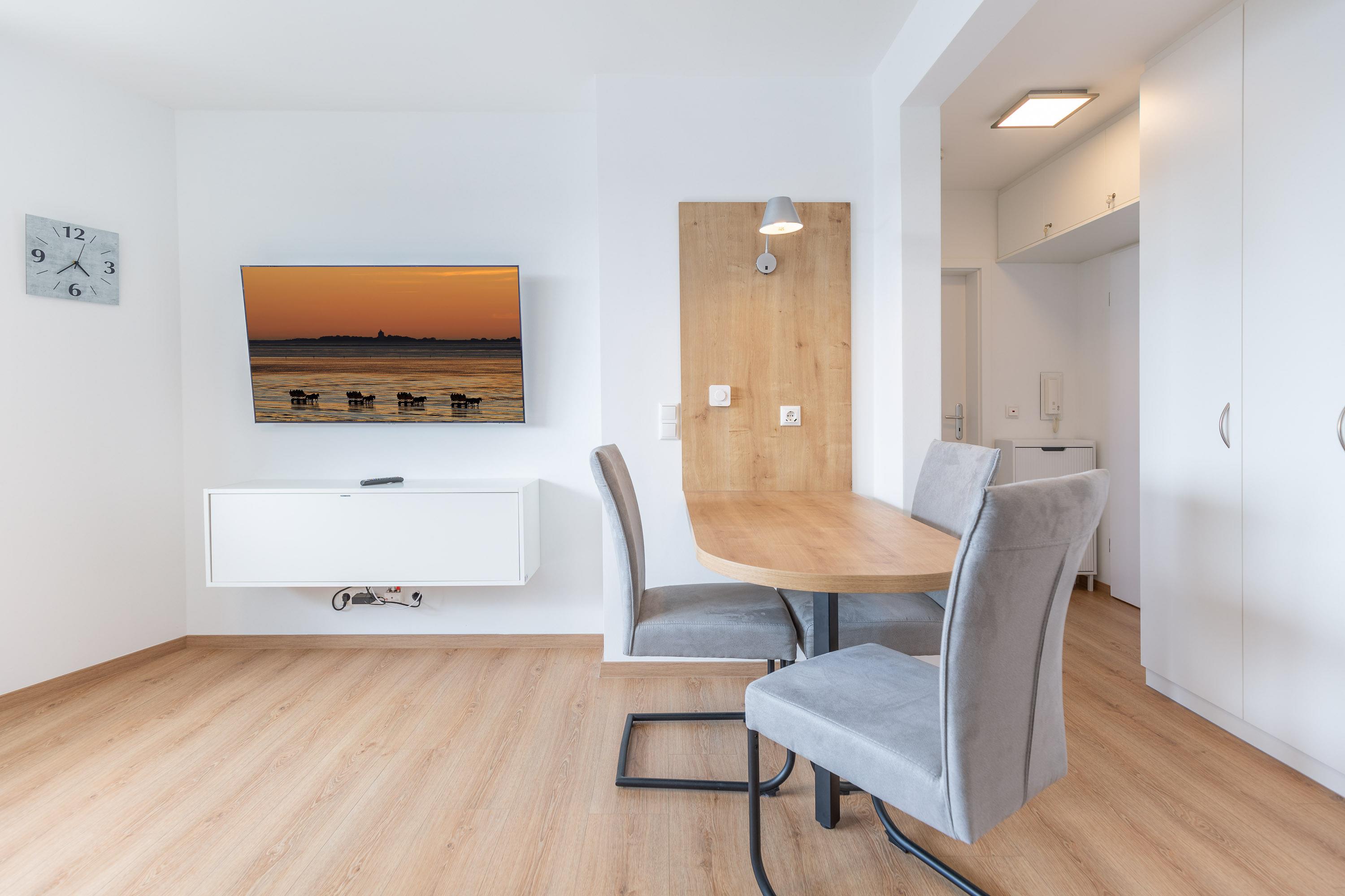 Die 2-Zimmer Ferienwohnung ist der optimale Logenplatz für 2 Personen. Egal ob Sie am Esstisch oder auf dem Sofa sitzen, immer genießen Sie den atemberaubenden Blick auf Nordsee, Wattenmeer und Insel Neuwerk. Am Abend können Sie bei einem Glas Wein traumhafte Sonnenuntergänge beobachten und einen erlebnisreichen Tag ausklingen lassen.