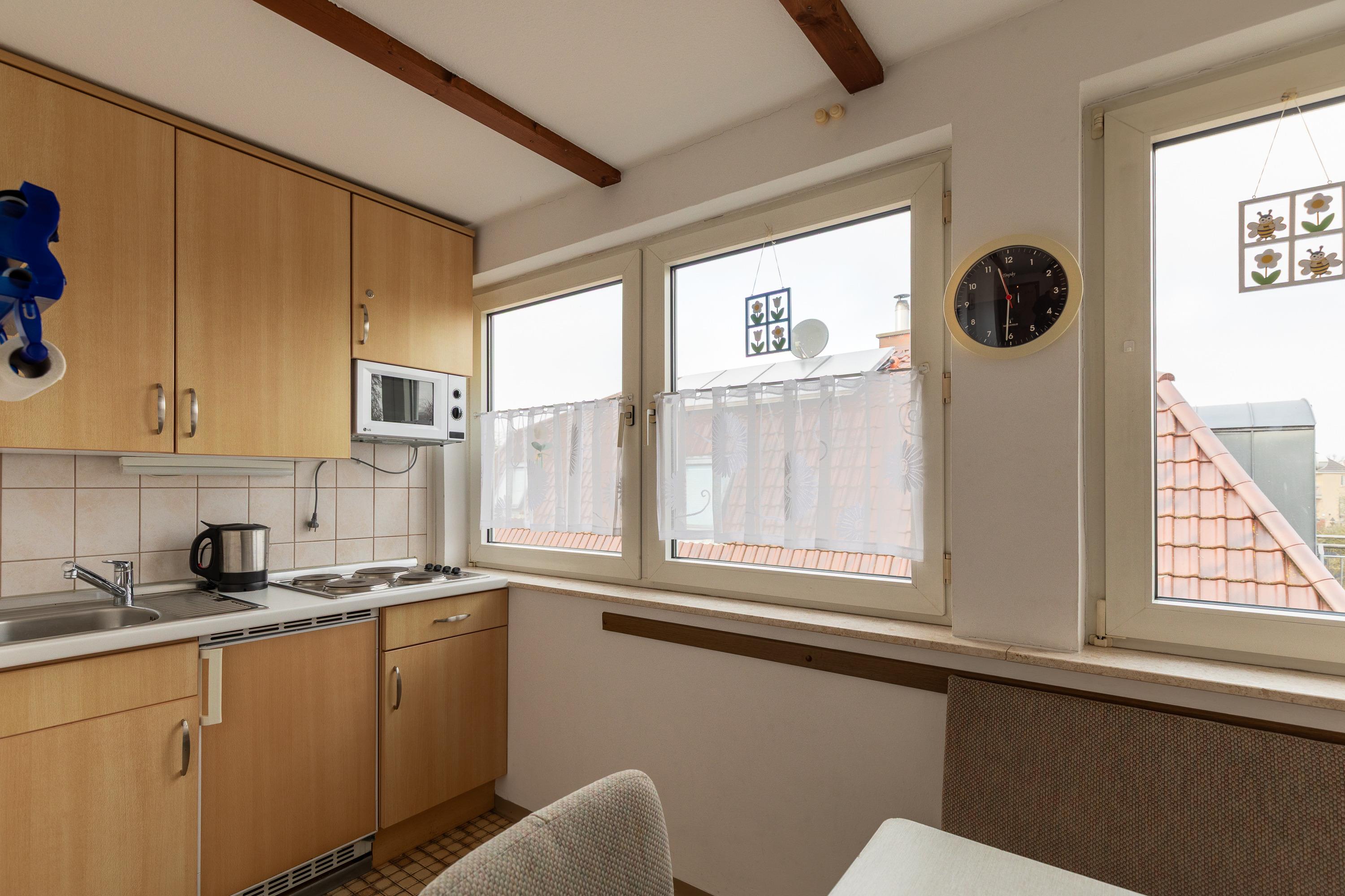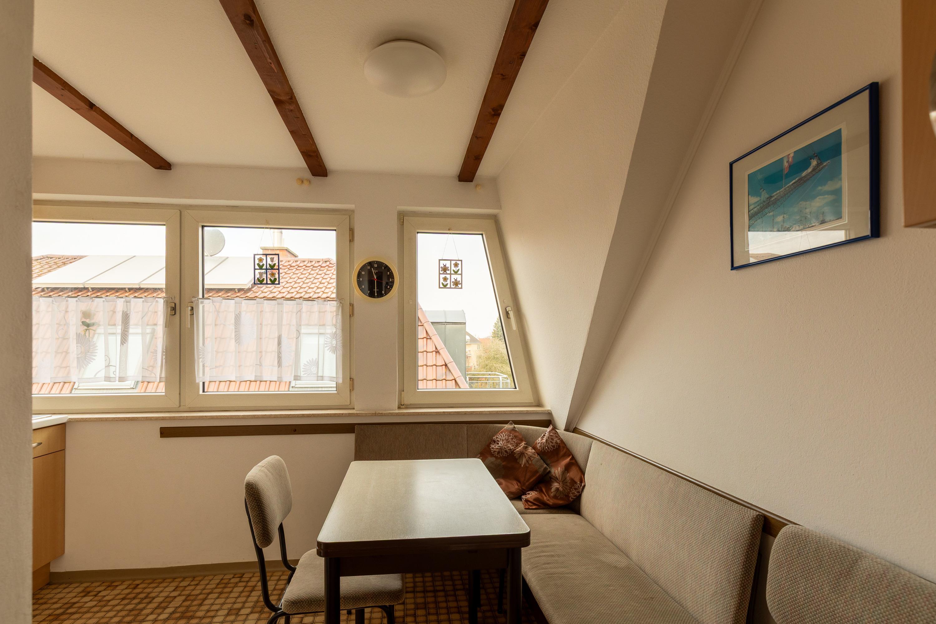 Die Wohnung verfügt über ein Wohnzimmer (mit 2 Schrankbetten), eine Küche mit Sitzecke und 4 Platten-Herd, zwei Schlafräume im Obergeschoss (erreichbar über eine Raumspartreppe) und ein Bad mit Dusche/WC.