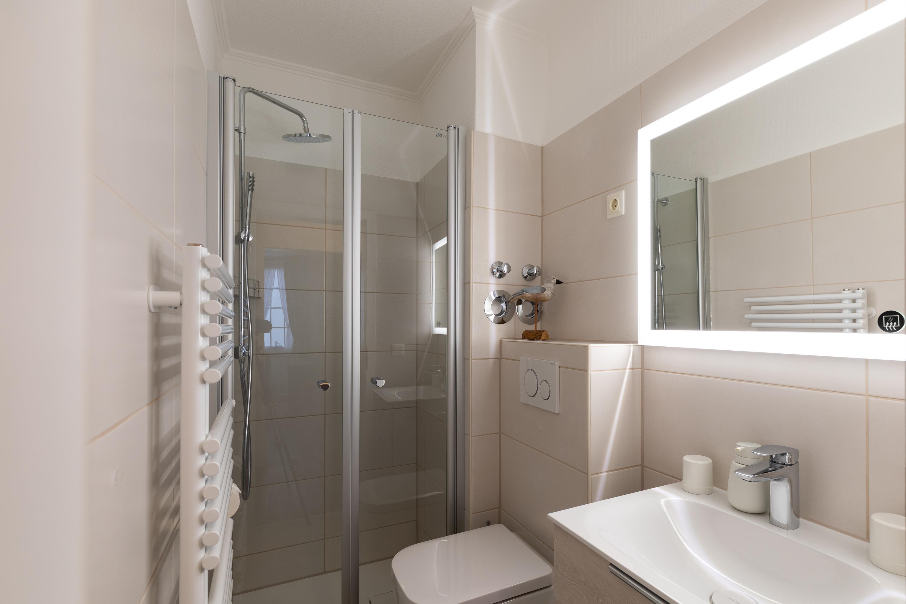 Die Ferienwohnung (Hochparterre, mit Vinylboden und Fliesen im Bad, in 2024 erneuert) mit einer Größe von ca. 32 m² Wohnfläche ist komplett bis zu 2 Personen ausgestattet. 1 Wohnzimmer mit Essplatz im Erker am Fenster, 1 Flachbildfernseher, Radio mit Bluetooth, Sofa und Sessel, Küche mit Geschirrspüler, Mikrowelle, Cerankochfeld, Backofen, Kühlschrank mit Gefrierfach, Kaffeemaschine, Eierkocher und Wasserkocher, Schlafzimmer mit Doppelbett (180x200cm) und Kleiderschrank, Flur, Bad (wurde in 2024 komplett erneuert), Dusche, WC, Waschbecken und Spiegel, Nichtraucherwohnung, keine Haustiere, PKW-Stellplatz am Haus.