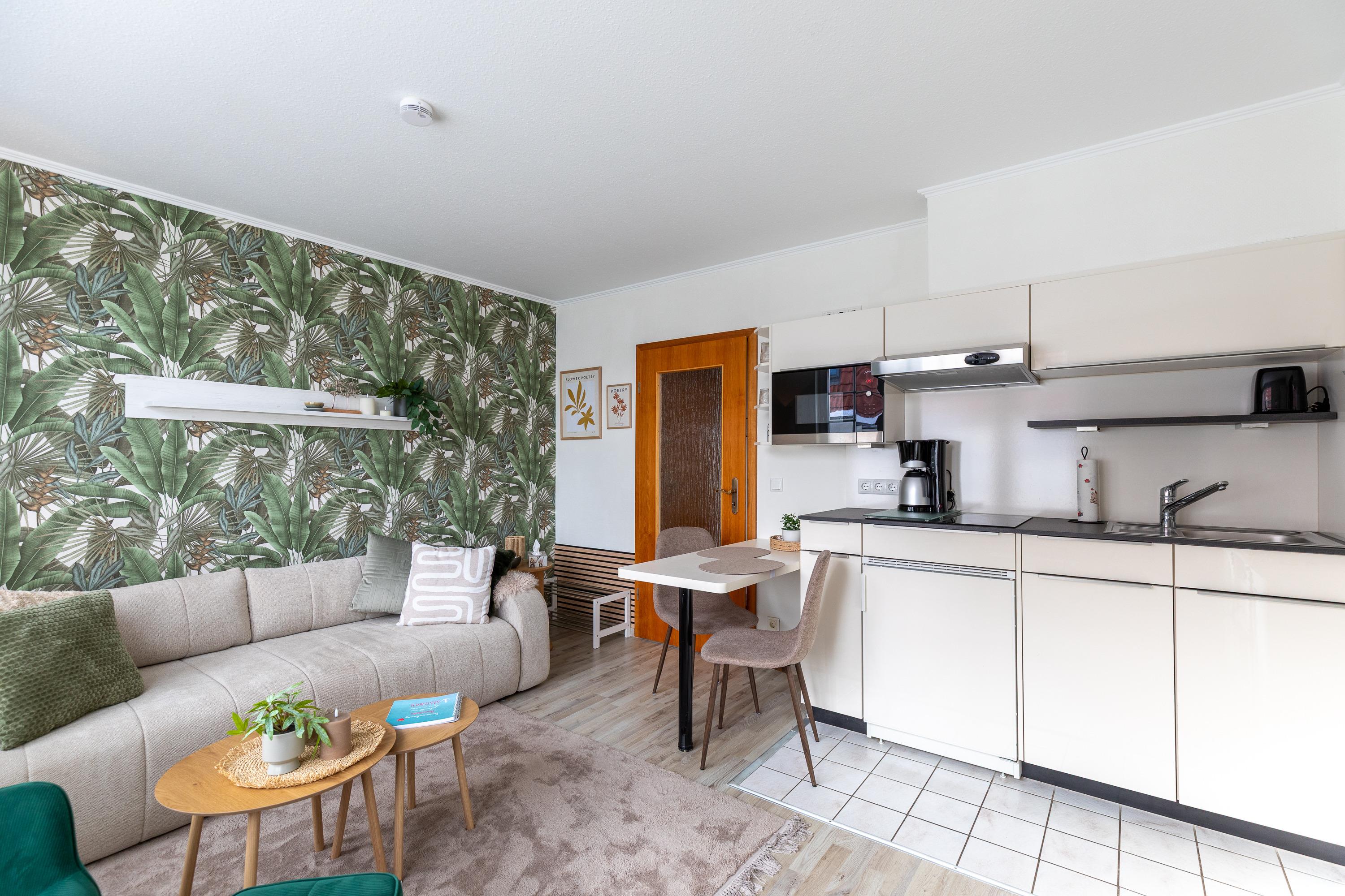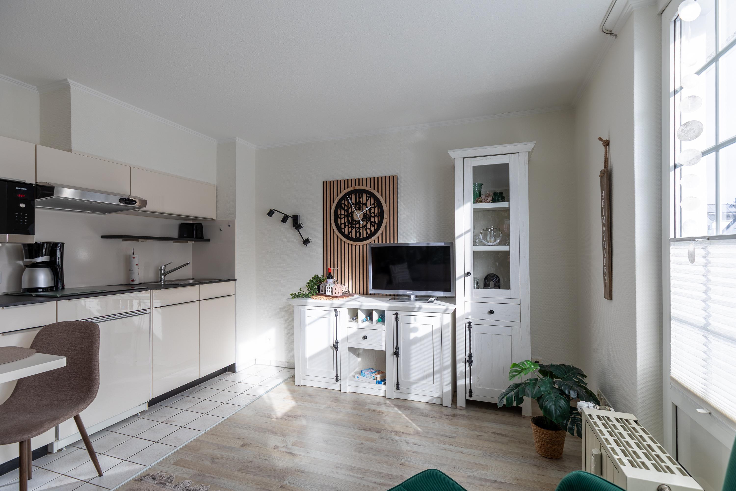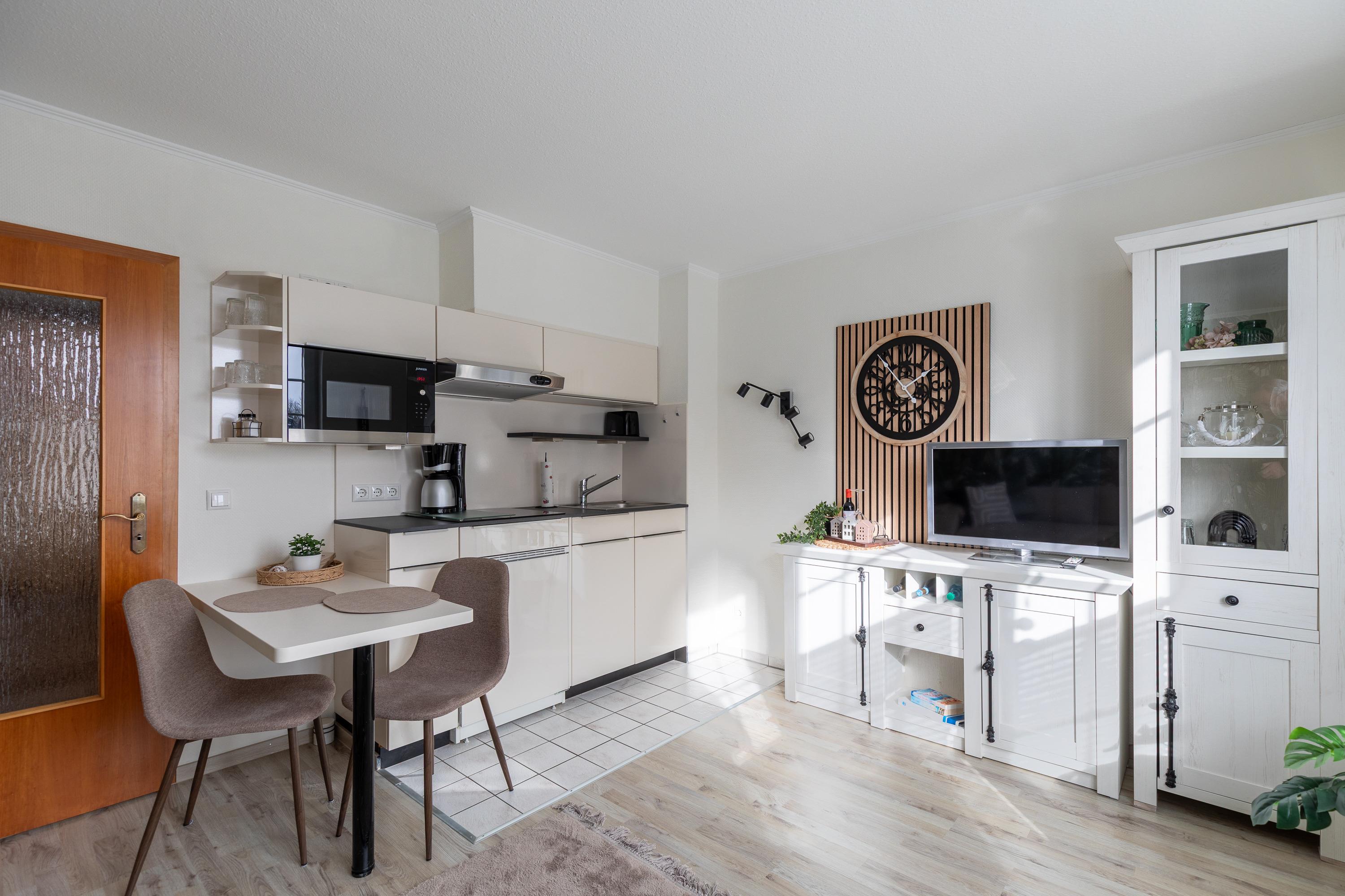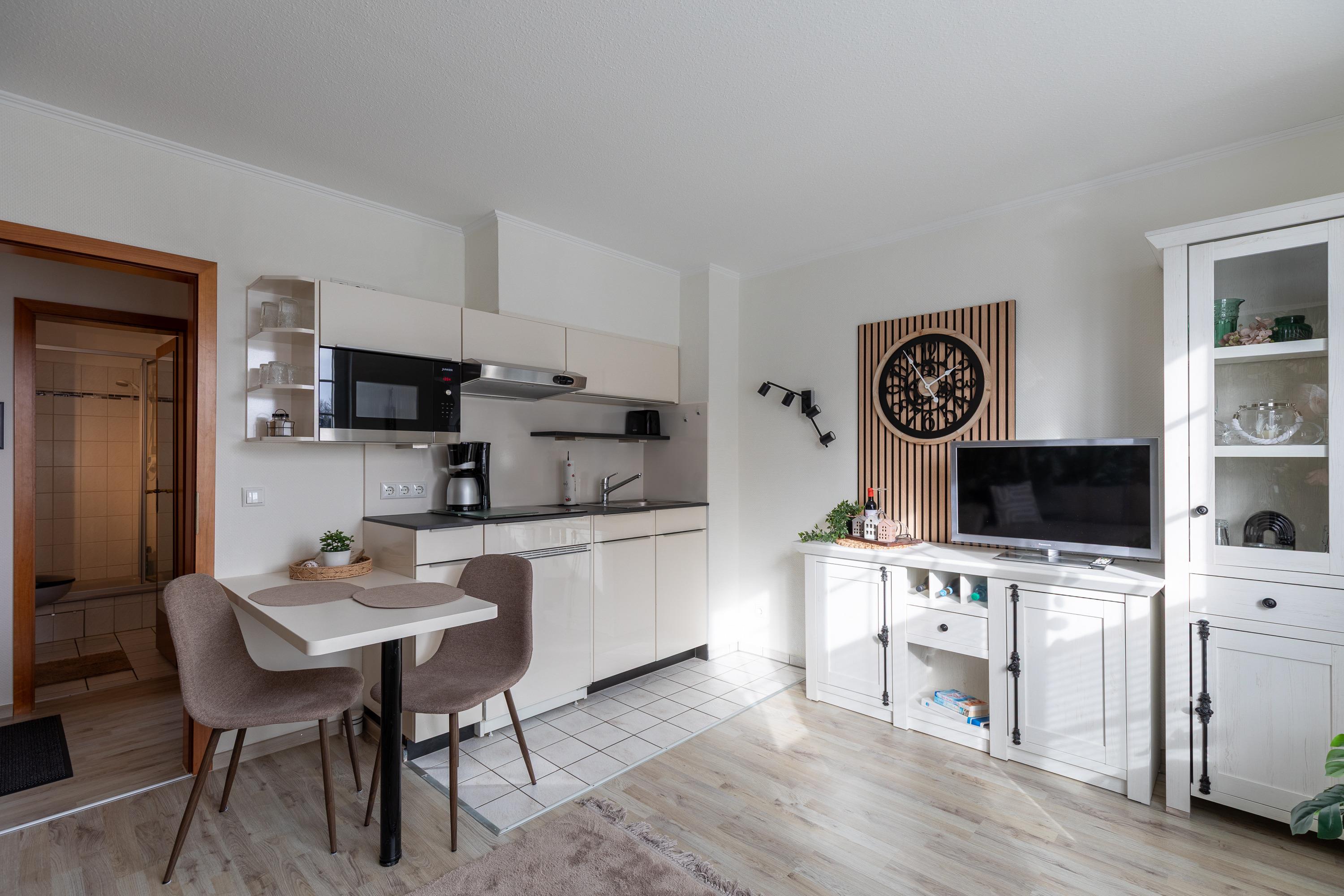 Die in 2026 frisch renovierte Ferienwohnung 4, mit einer Größe von ca. 31 m² Wohnfläche ist komplett bis zu 2 Personen ausgestattet. 1 Wohnzimmer mit Essplatz, 1 Flachbildfernseher, Radio, Sofa und Sessel, neue Einbauküche mit Kühlschrank, Cerankochfeld, Geschirrspüler, Mikrowelle, Kaffeemaschine, Toaster und Wasserkocher, Schlafzimmer mit Doppelbett, Seesicht (vom Schlafzimmer) und Kleiderschrank, Flur, Bad mit Dusche, WC, Waschbecken und Spiegel, Nichtraucherwohnung, keine Haustiere, PKW-Stellplatz am Haus.