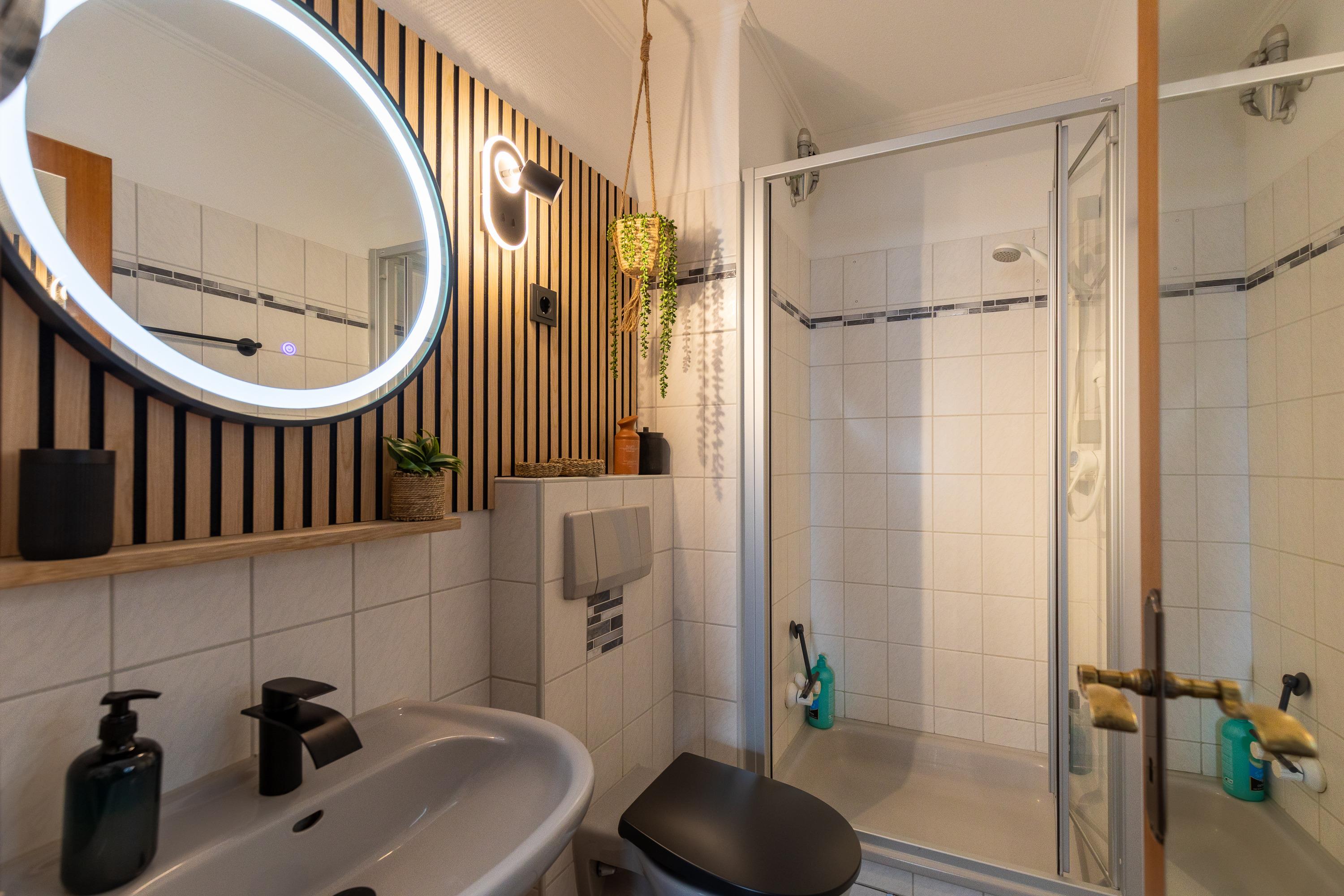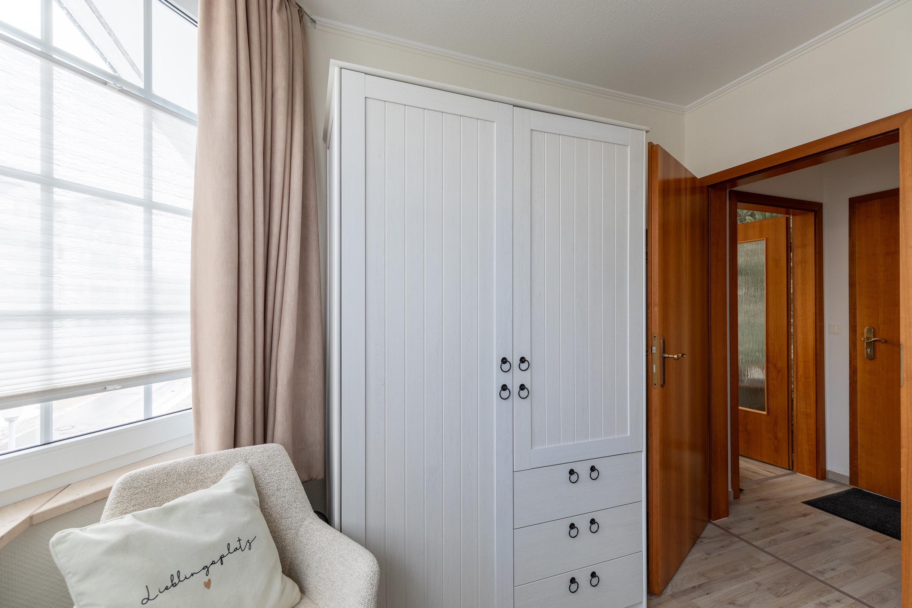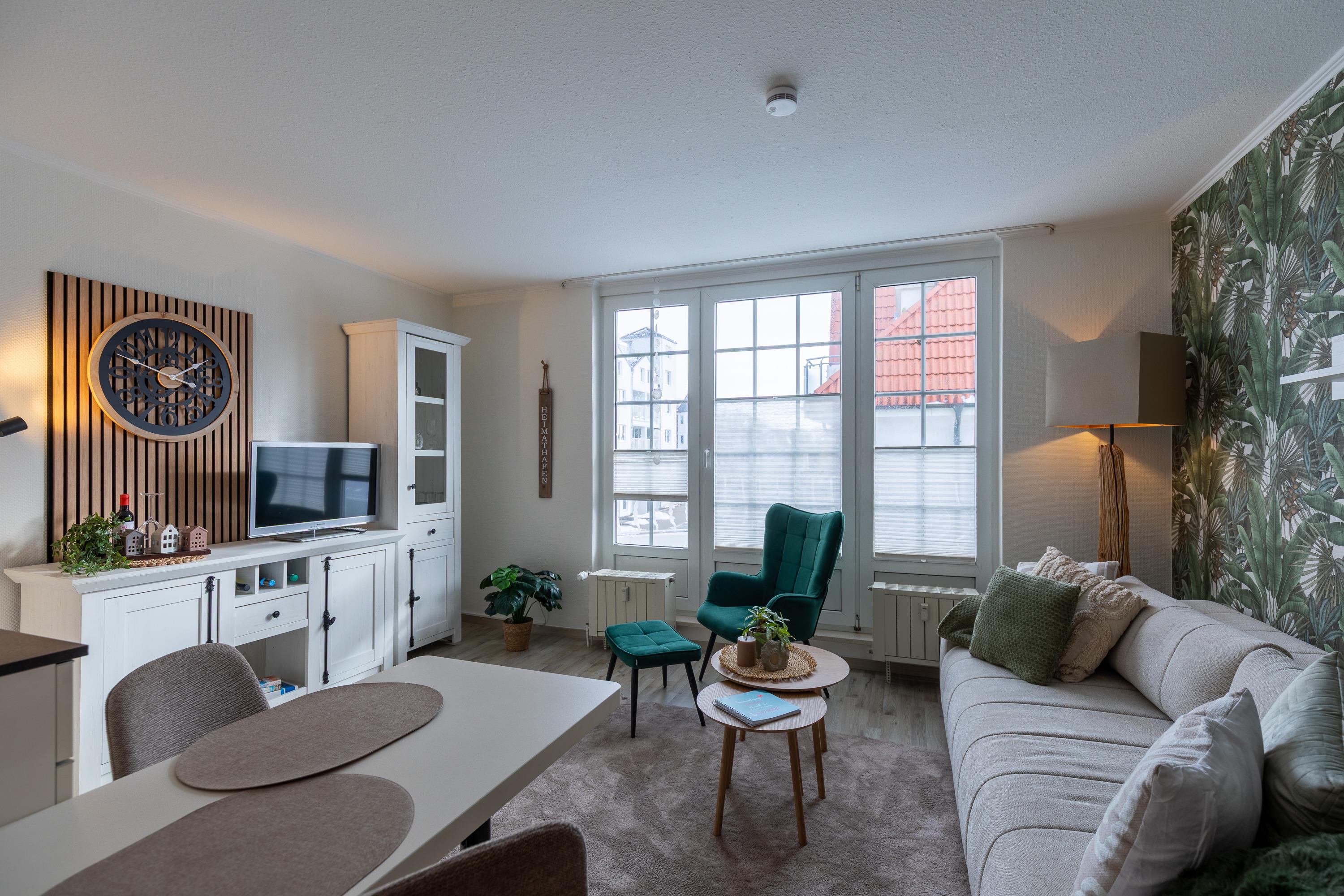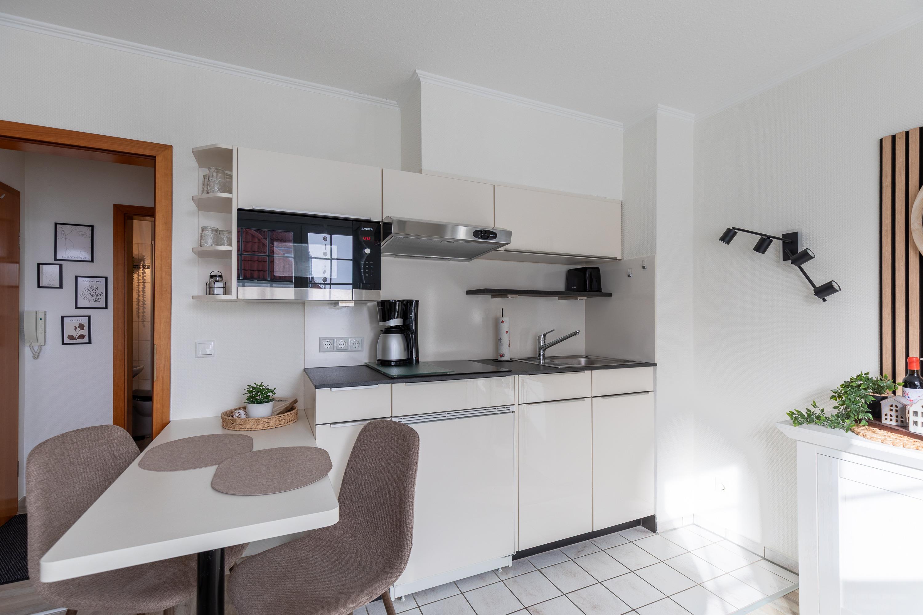 Die in 2026 frisch renovierte Ferienwohnung 4, mit einer Größe von ca. 31 m² Wohnfläche ist komplett bis zu 2 Personen ausgestattet. 1 Wohnzimmer mit Essplatz, 1 Flachbildfernseher, Radio, Sofa und Sessel, neue Einbauküche mit Kühlschrank, Cerankochfeld, Geschirrspüler, Mikrowelle, Kaffeemaschine, Toaster und Wasserkocher, Schlafzimmer mit Doppelbett, Seesicht (vom Schlafzimmer) und Kleiderschrank, Flur, Bad mit Dusche, WC, Waschbecken und Spiegel, Nichtraucherwohnung, keine Haustiere, PKW-Stellplatz am Haus.